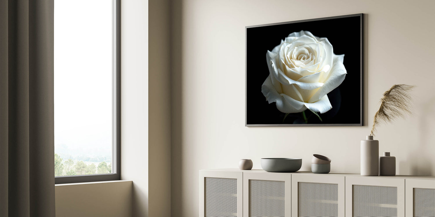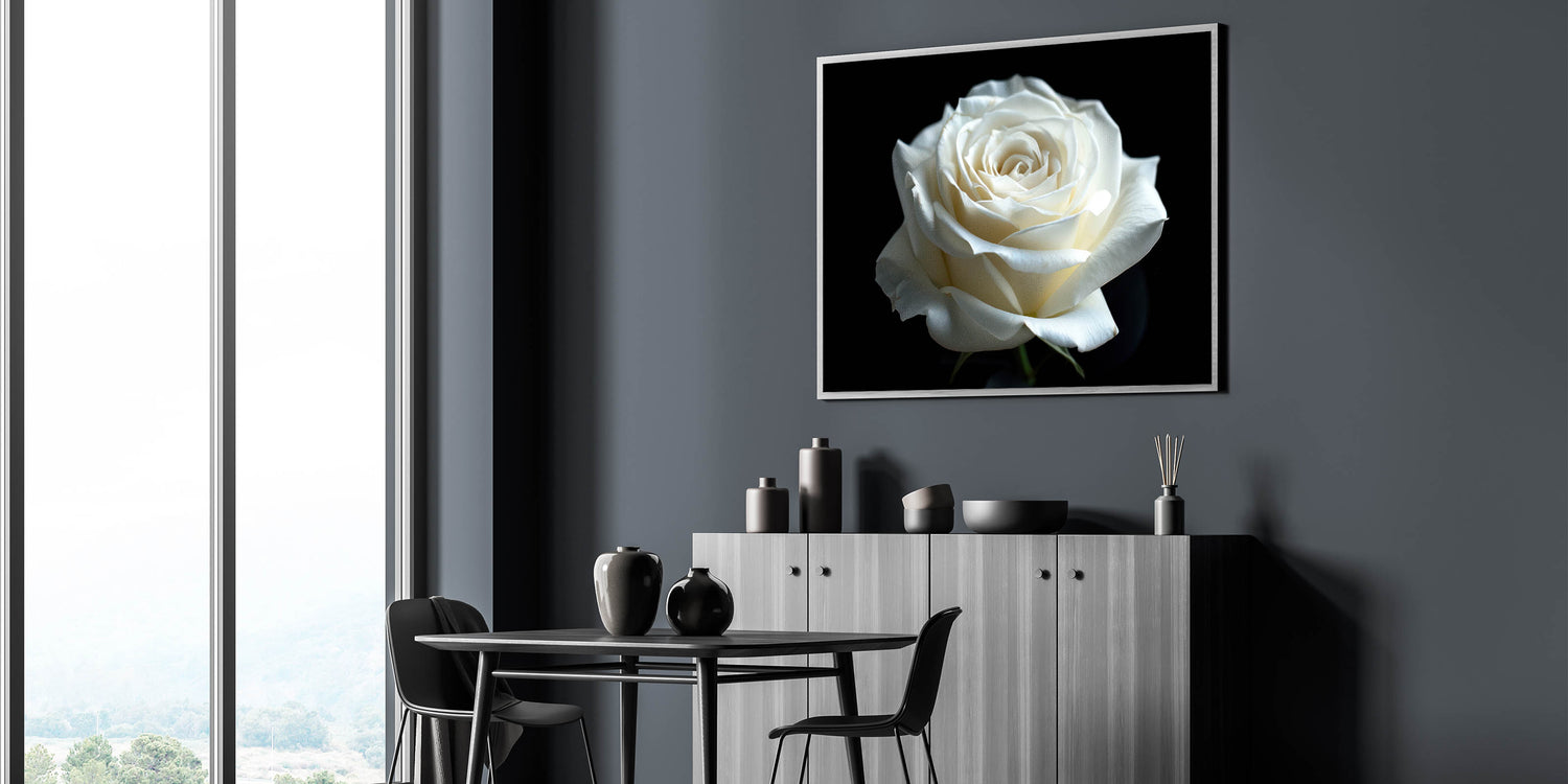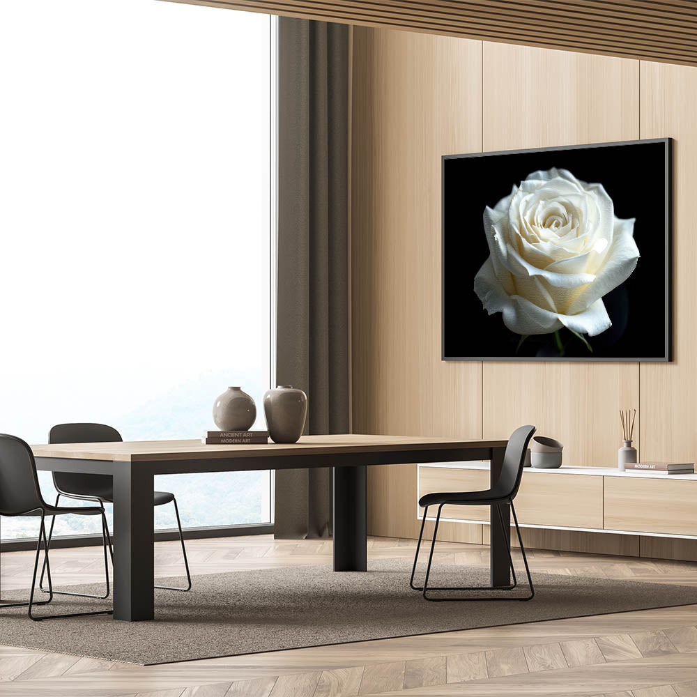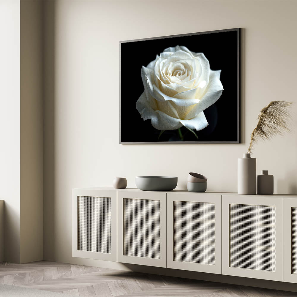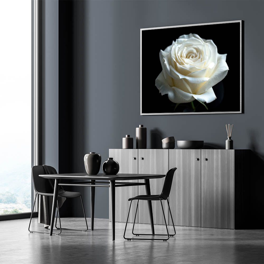 Bring timeless beauty into your home with this elegant white rose wall art. The soft, glowing petals of the white rose stand out against a dark background, creating a striking and sophisticated look. This floral rose artwork adds a touch of serenity and grace to any room, making it ideal for bedrooms, living rooms, or offices. The minimalist yet impactful design ensures that it will complement various interior styles, from contemporary to classic.