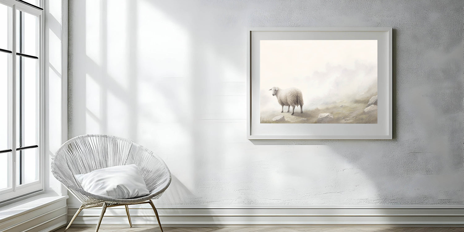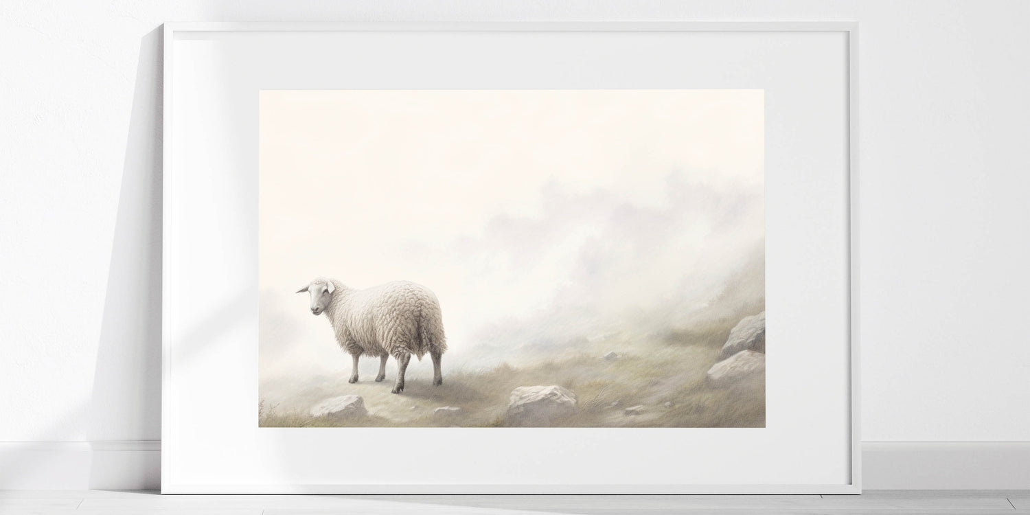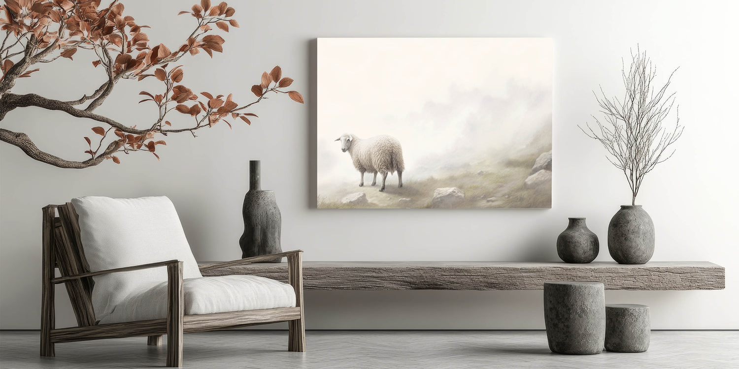 - Calming and Serene: The soft, misty background combined with the gentle presence of the sheep creates a peaceful and contemplative mood.