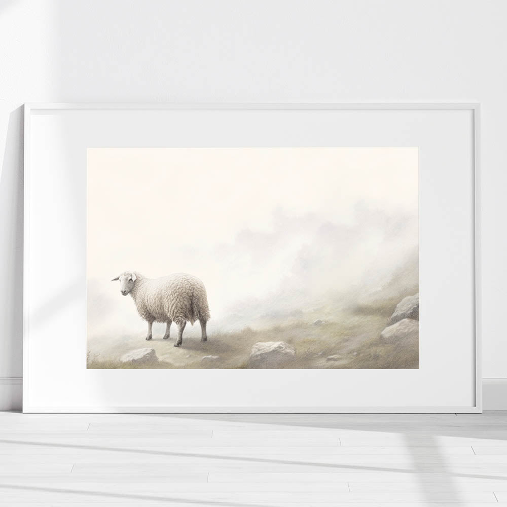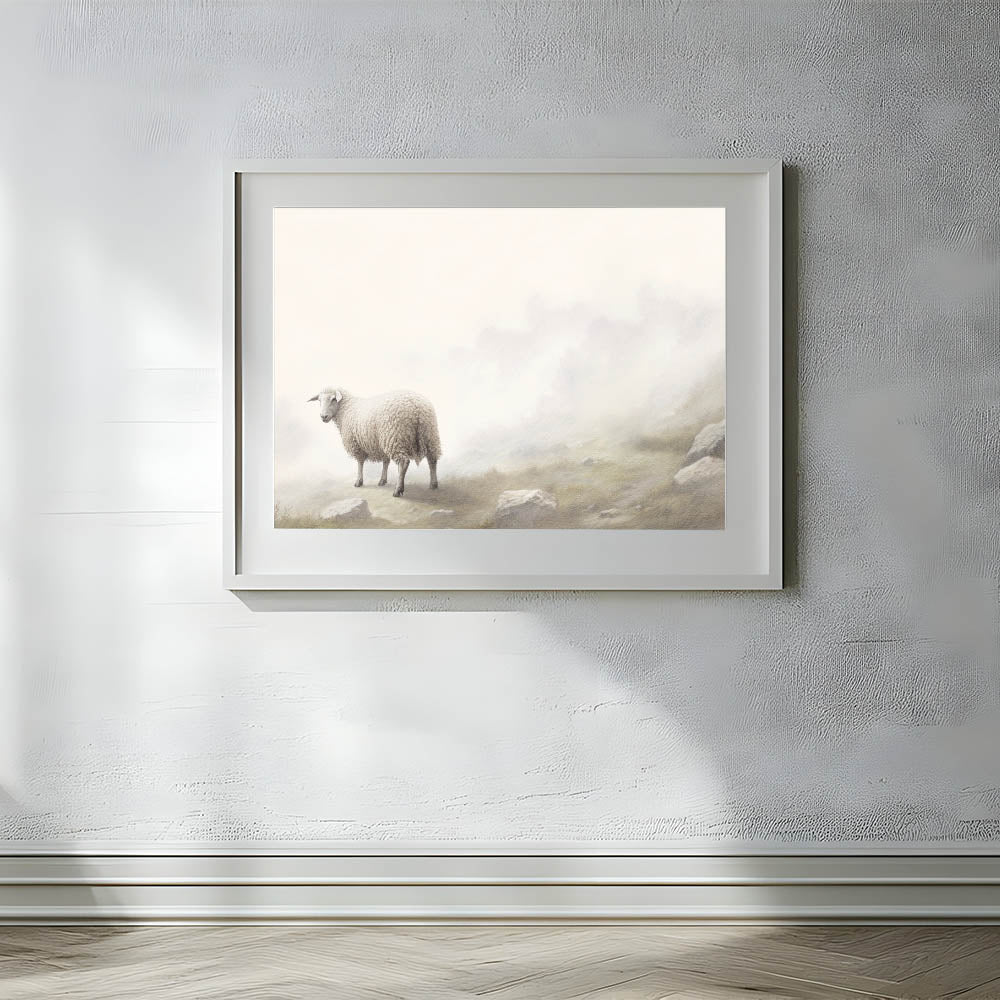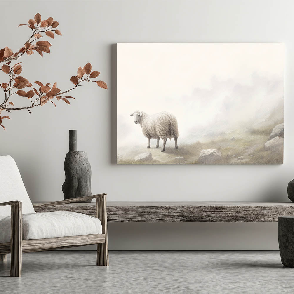 Immerse your home in tranquility with this Ethereal Sheep Wall Art. This artwork captures the serene beauty of a lone sheep in a misty pasture, evoking a sense of calm and solitude. The soft, muted tones create a dreamlike atmosphere, making this piece a perfect addition to any minimalist, rustic, or nature-inspired decor.