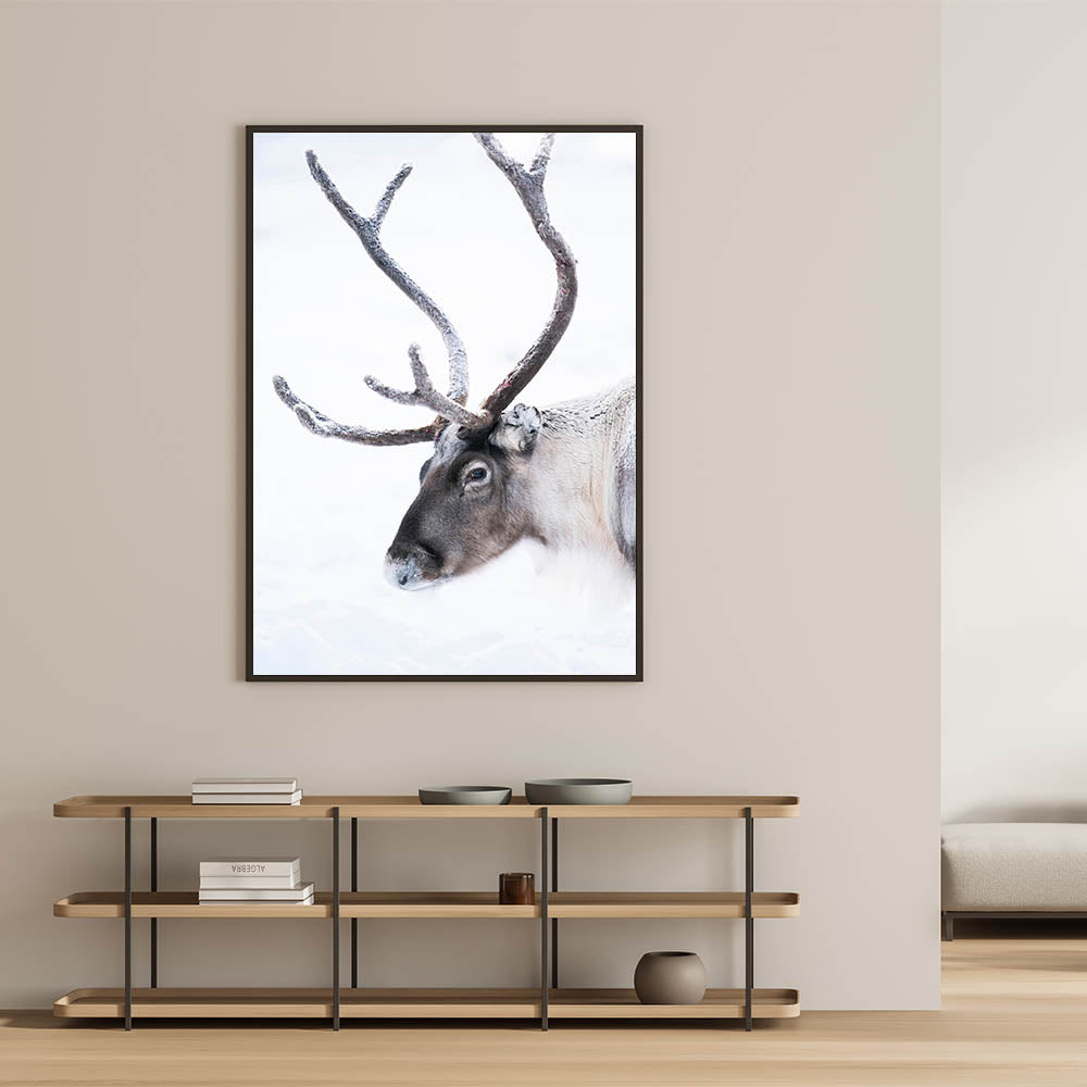 Celebrate the beauty of Finland’s wildlife with this captivating wall art, featuring a majestic reindeer standing in a snow-covered landscape. This close-up image captures the fine details of the reindeer’s antlers, dusted with frost, against a crisp white backdrop. Perfect for nature lovers and fans of Nordic wildlife, this Finnish nature canvas adds a touch of serenity and natural wonder to any space.