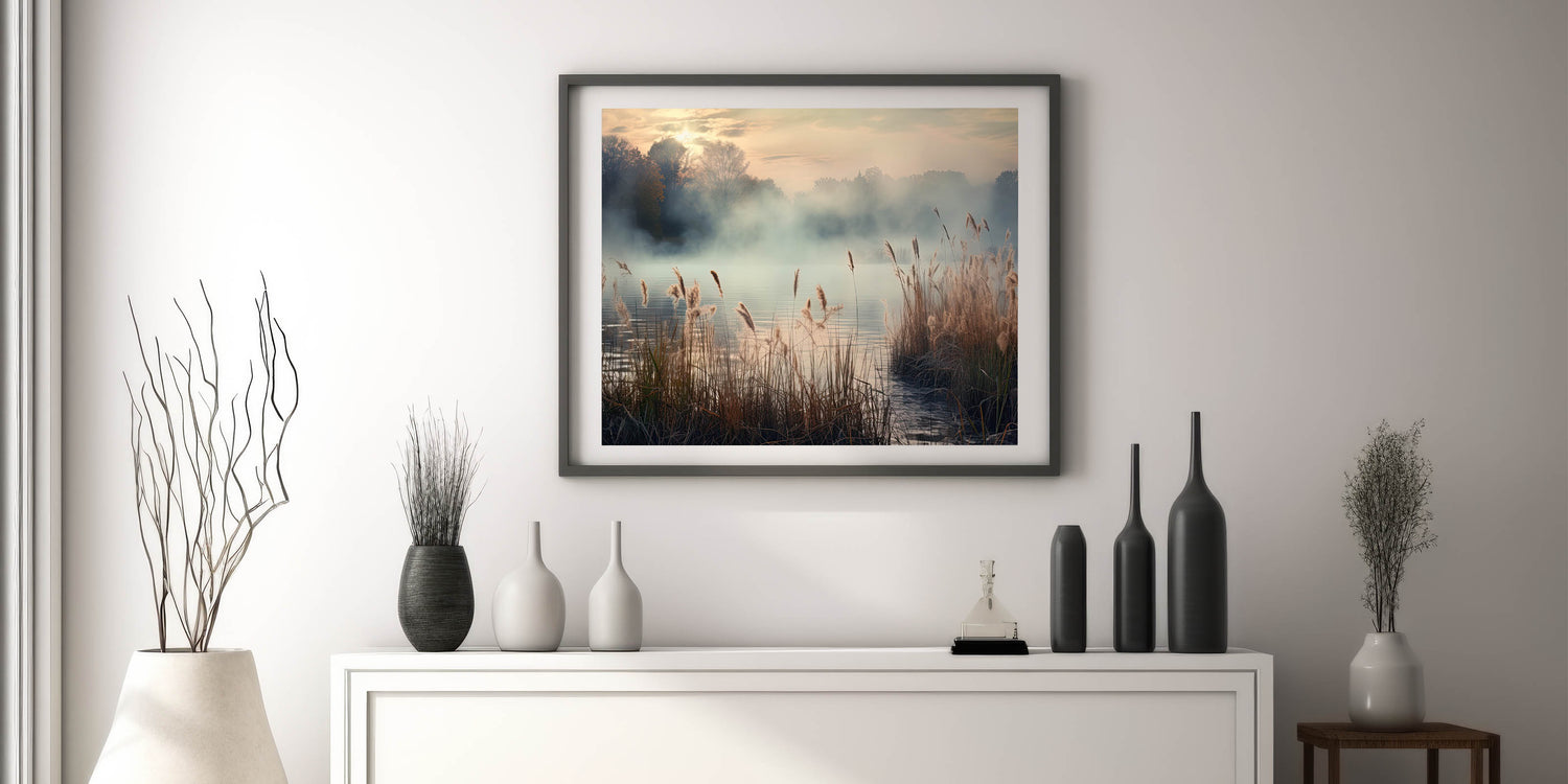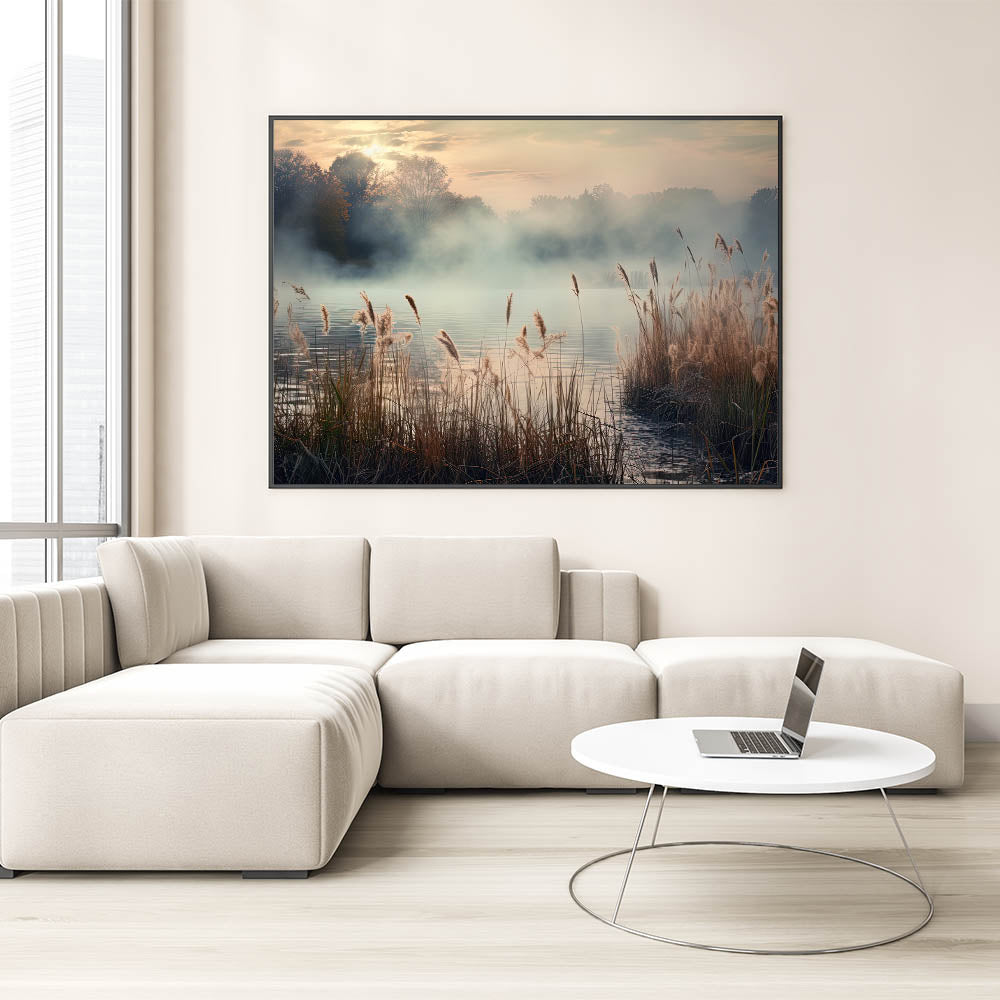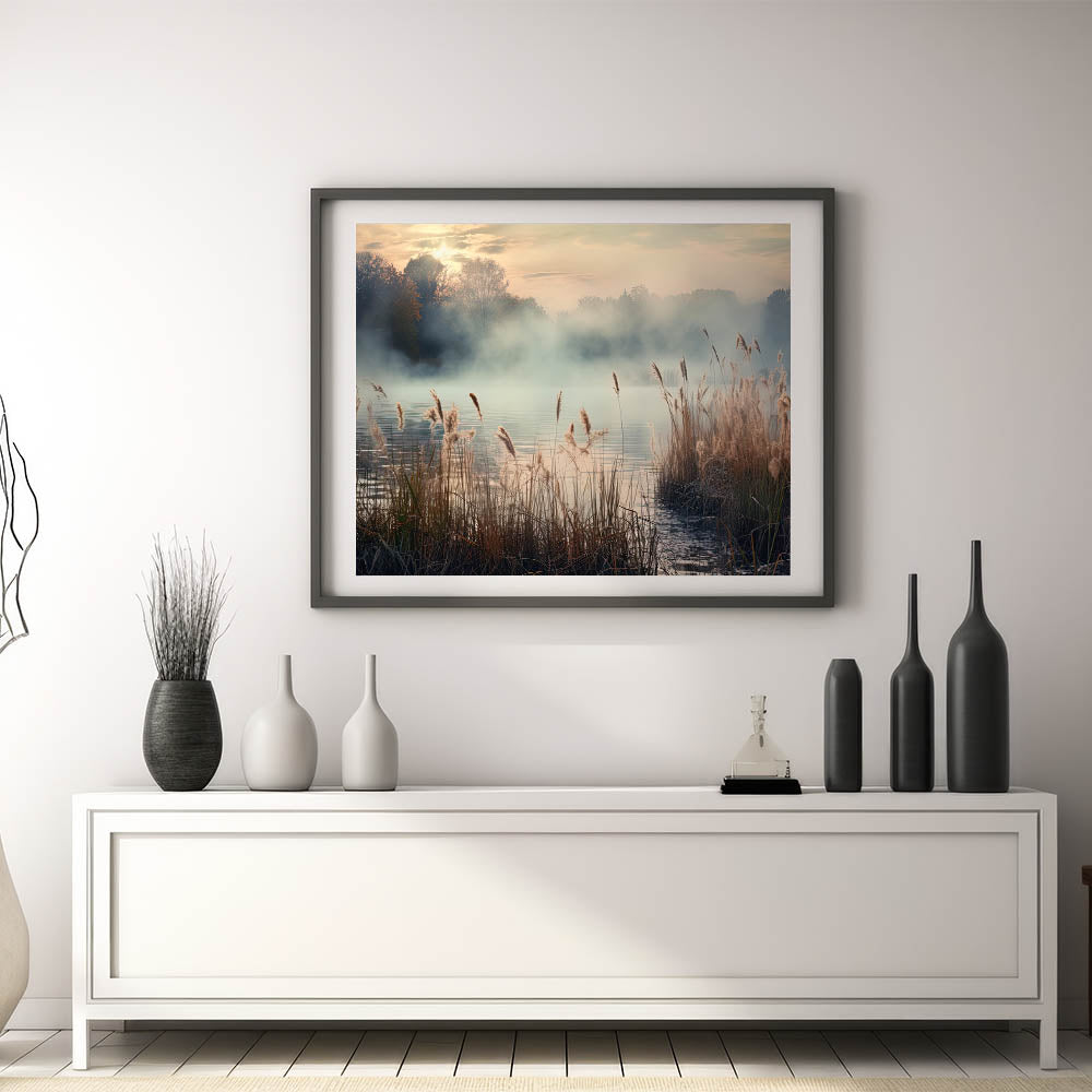 Enhance your living space with the tranquil beauty of this Foggy Morning Wall Art, featuring a serene misty landscape that captures the soft, golden hues of dawn. The gentle fog rolling over the water, combined with the delicate reeds swaying in the breeze, creates a calming atmosphere that evokes a sense of peace and serenity.