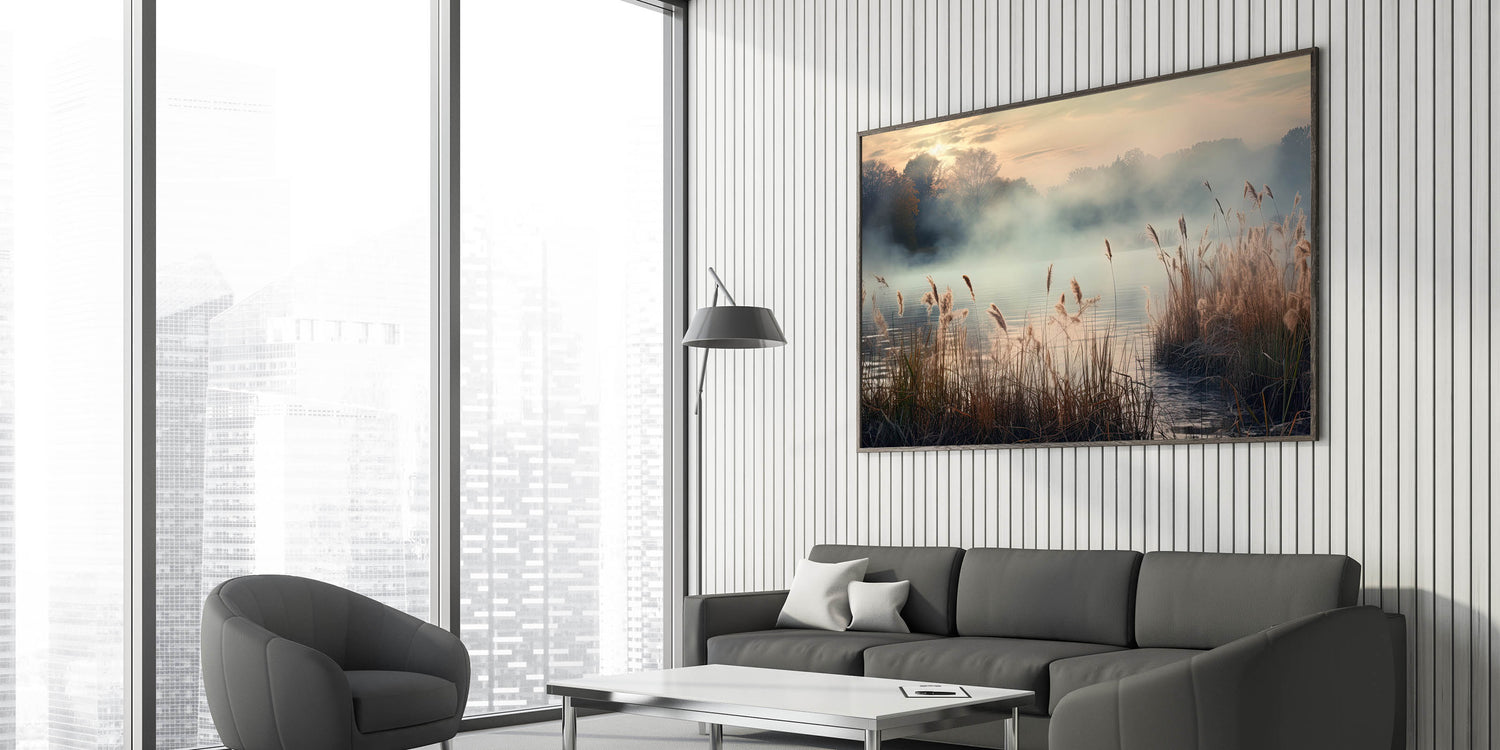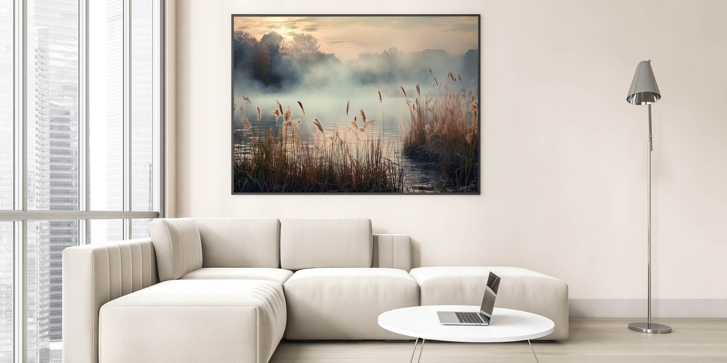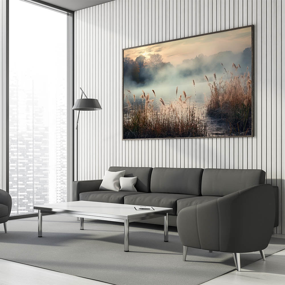 Enhance your living space with the tranquil beauty of this Foggy Morning Wall Art, featuring a serene misty landscape that captures the soft, golden hues of dawn. The gentle fog rolling over the water, combined with the delicate reeds swaying in the breeze, creates a calming atmosphere that evokes a sense of peace and serenity.