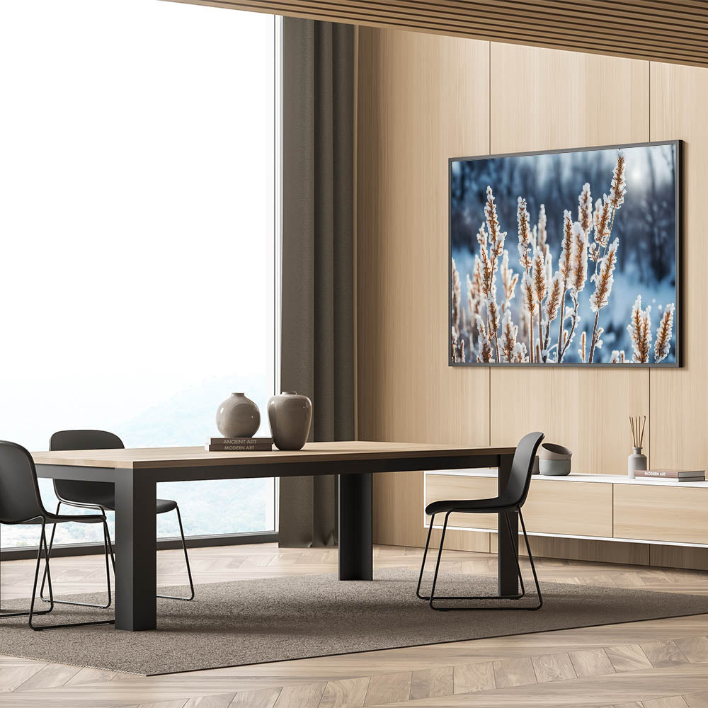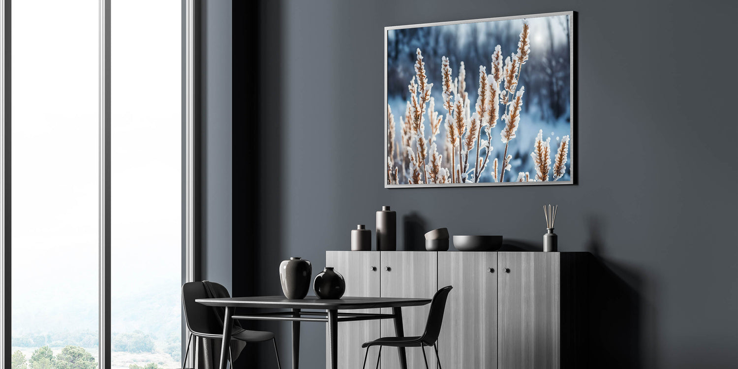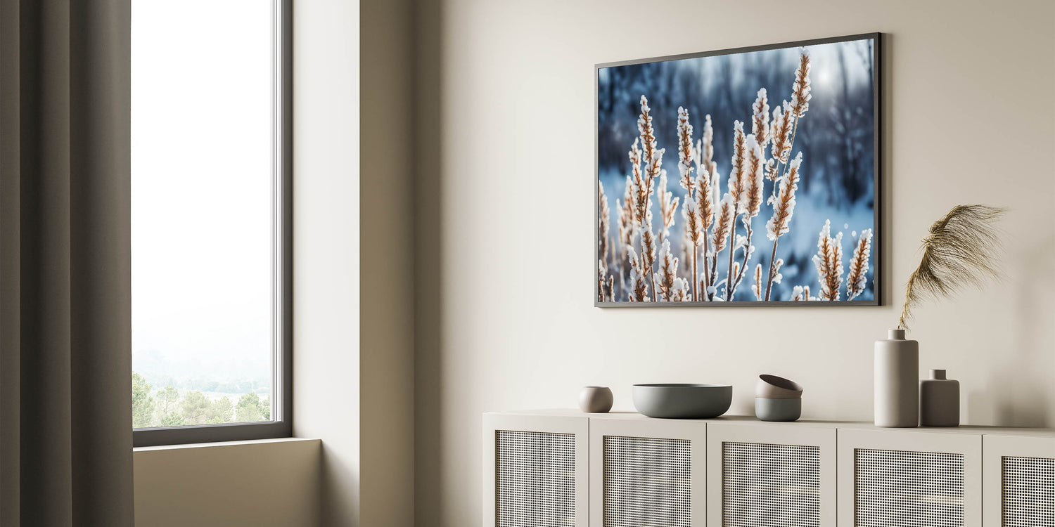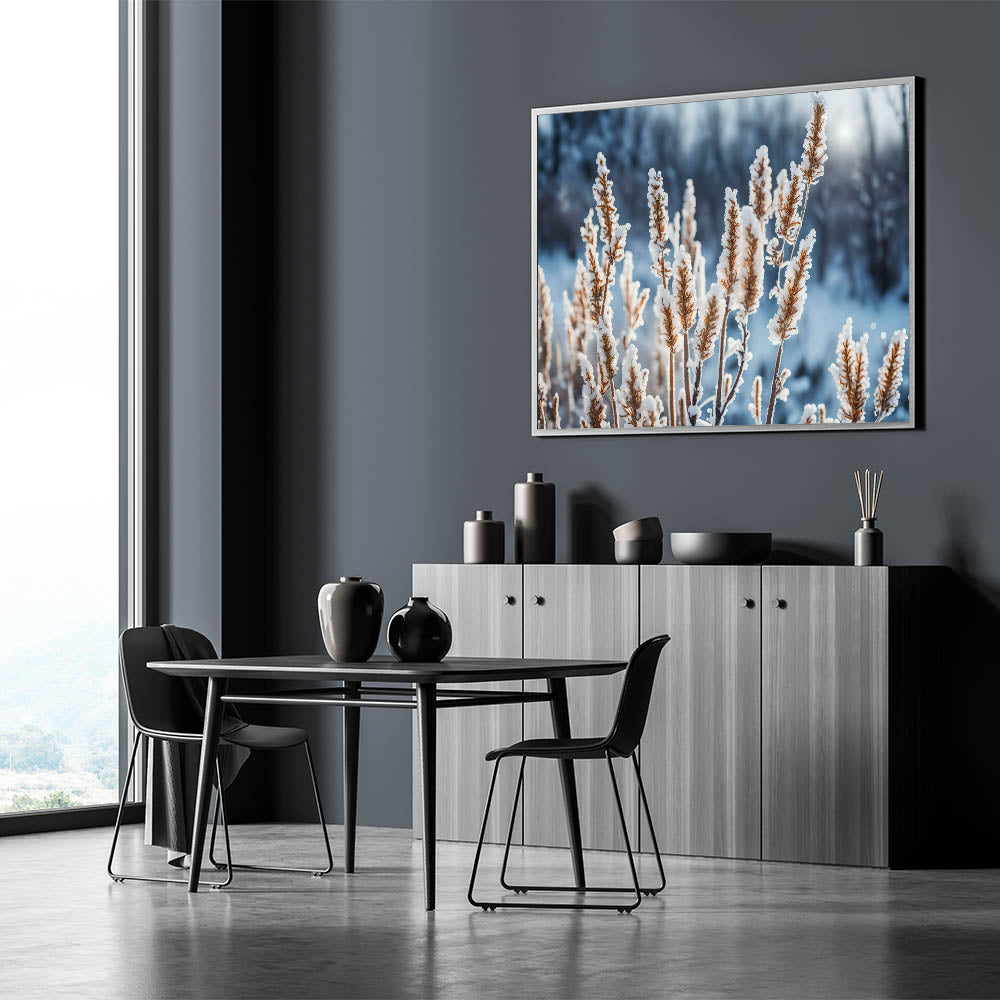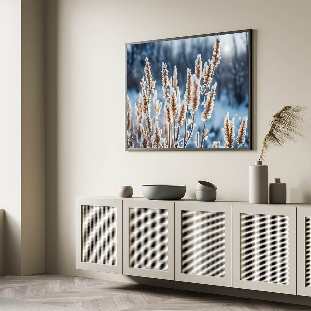 This captivating nature close-up art piece showcases frost-covered plants bathed in the soft winter sun. The icy crystals delicately cling to each stem, creating a striking visual contrast between the warm browns of the plants and the cool blues of the surrounding snow. The gentle sunlight filters through the scene, adding a touch of warmth to the frozen landscape. This artwork brings a sense of calm and serenity, perfect for anyone looking to add a peaceful, wintery touch to their home or office decor.