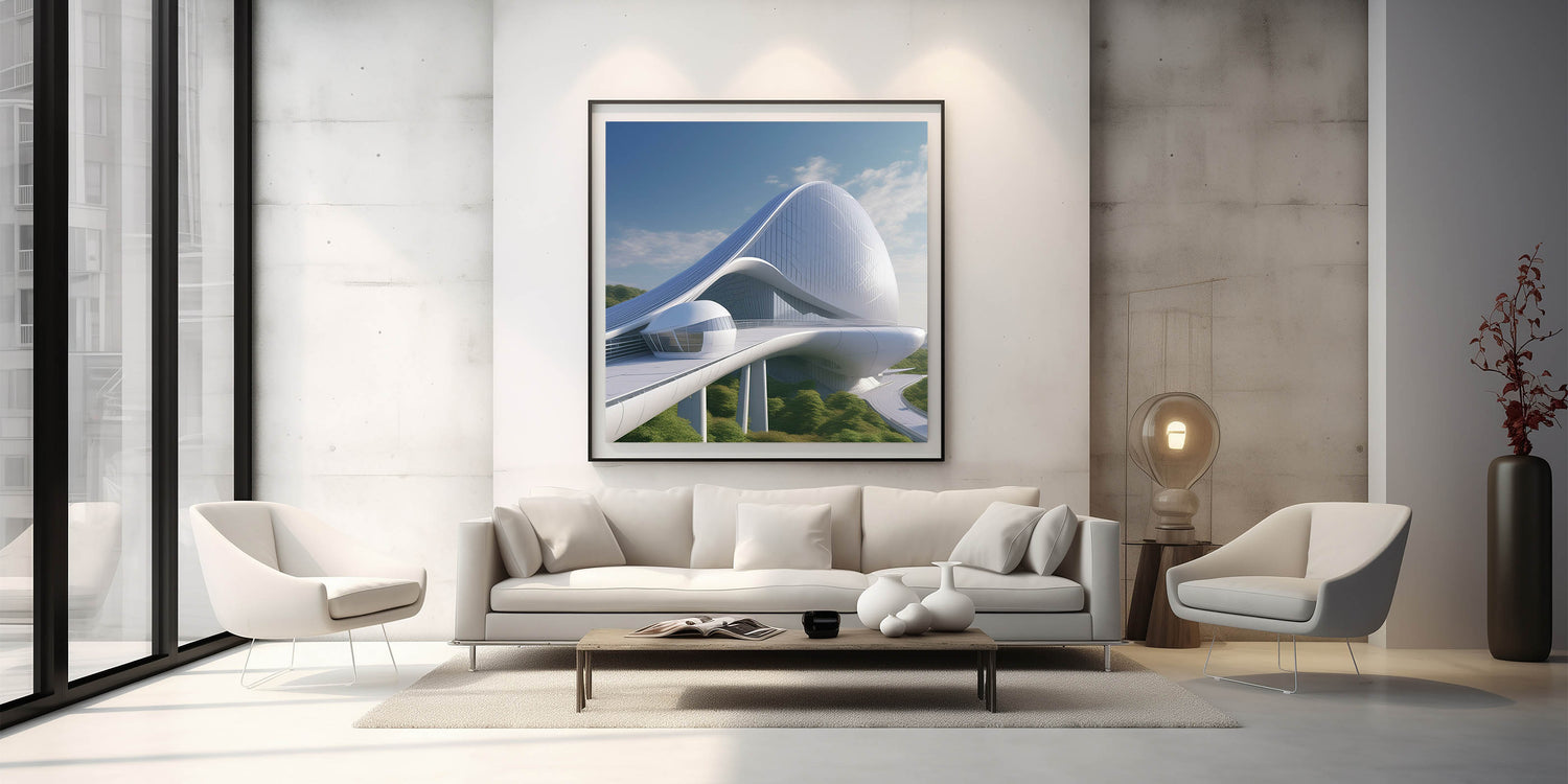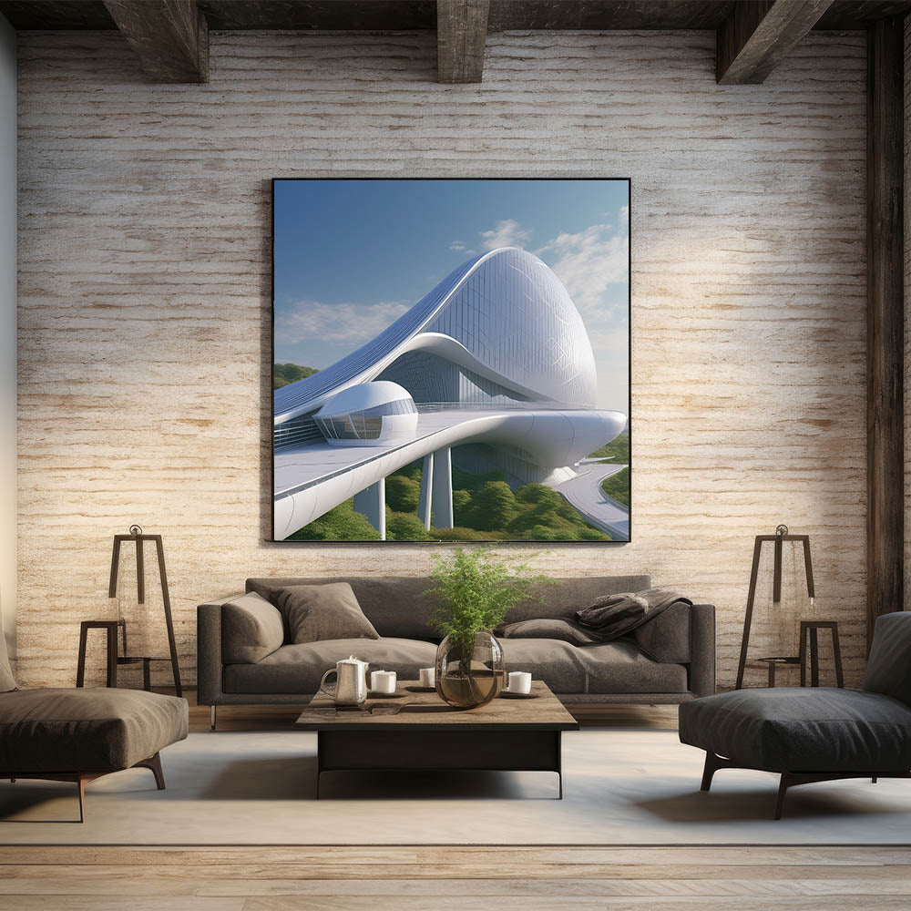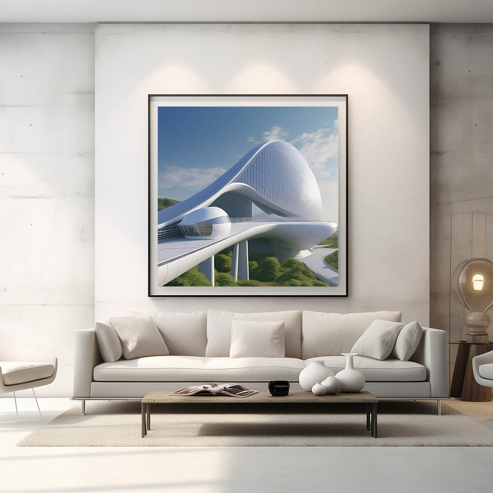 - High-quality museum wall art that captures the essence of futuristic architectural design.