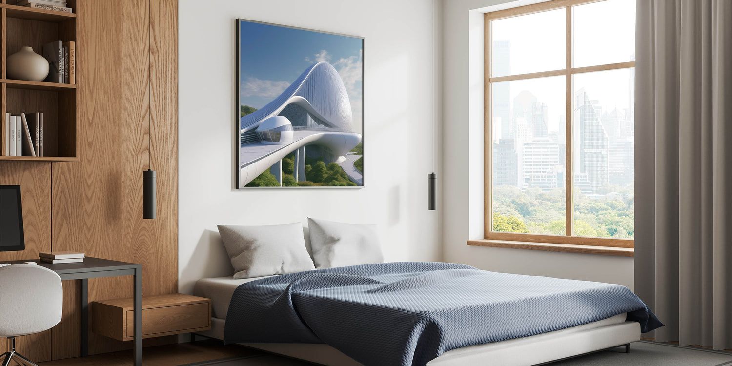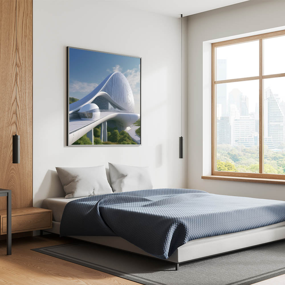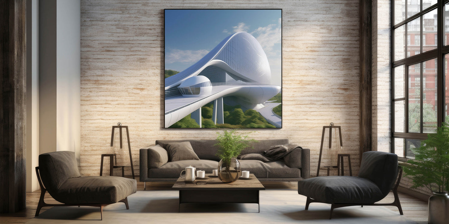 - High-quality museum wall art that captures the essence of futuristic architectural design.