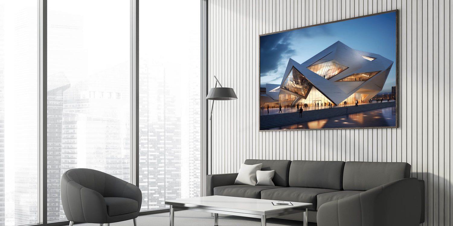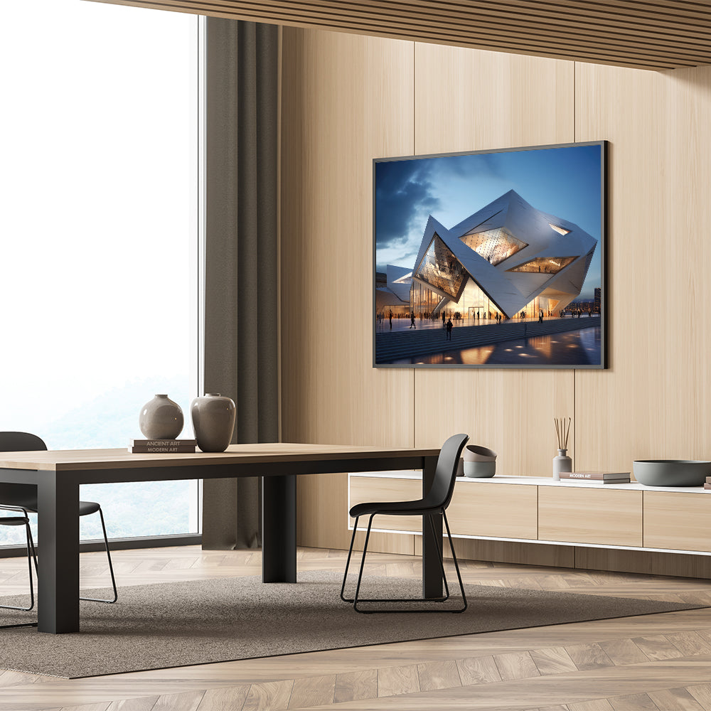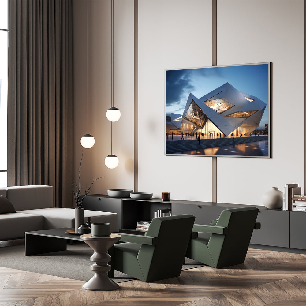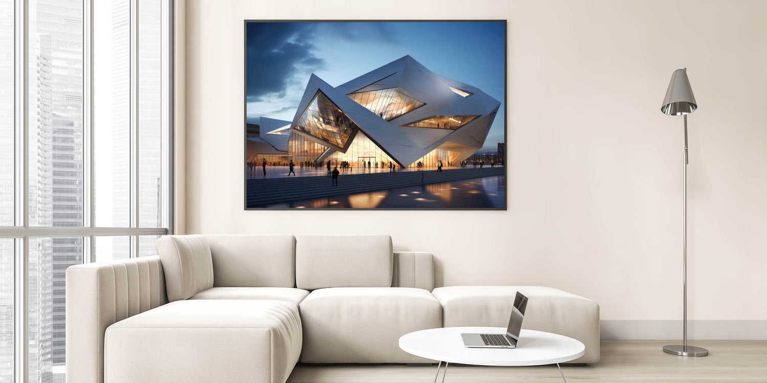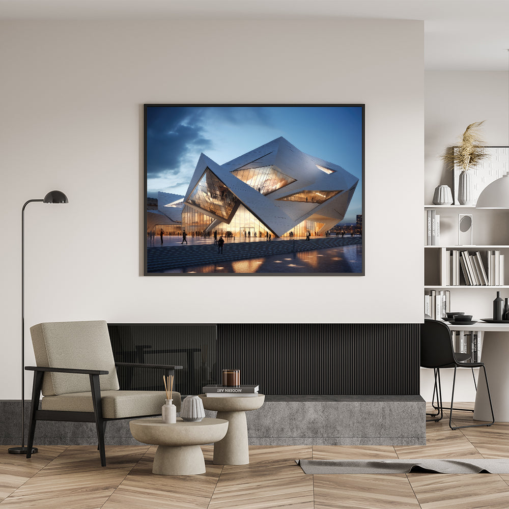 Immerse yourself in the captivating beauty of futuristic architecture with this stunning wall art, featuring a modern museum illuminated by the soft glow of evening light. The sharp, angular design of the building creates a striking contrast against the darkening sky, making this piece an ideal choice for those who appreciate bold, contemporary design. The intricate play of light and reflection across the glass surfaces adds depth and dimension, bringing the artwork to life.