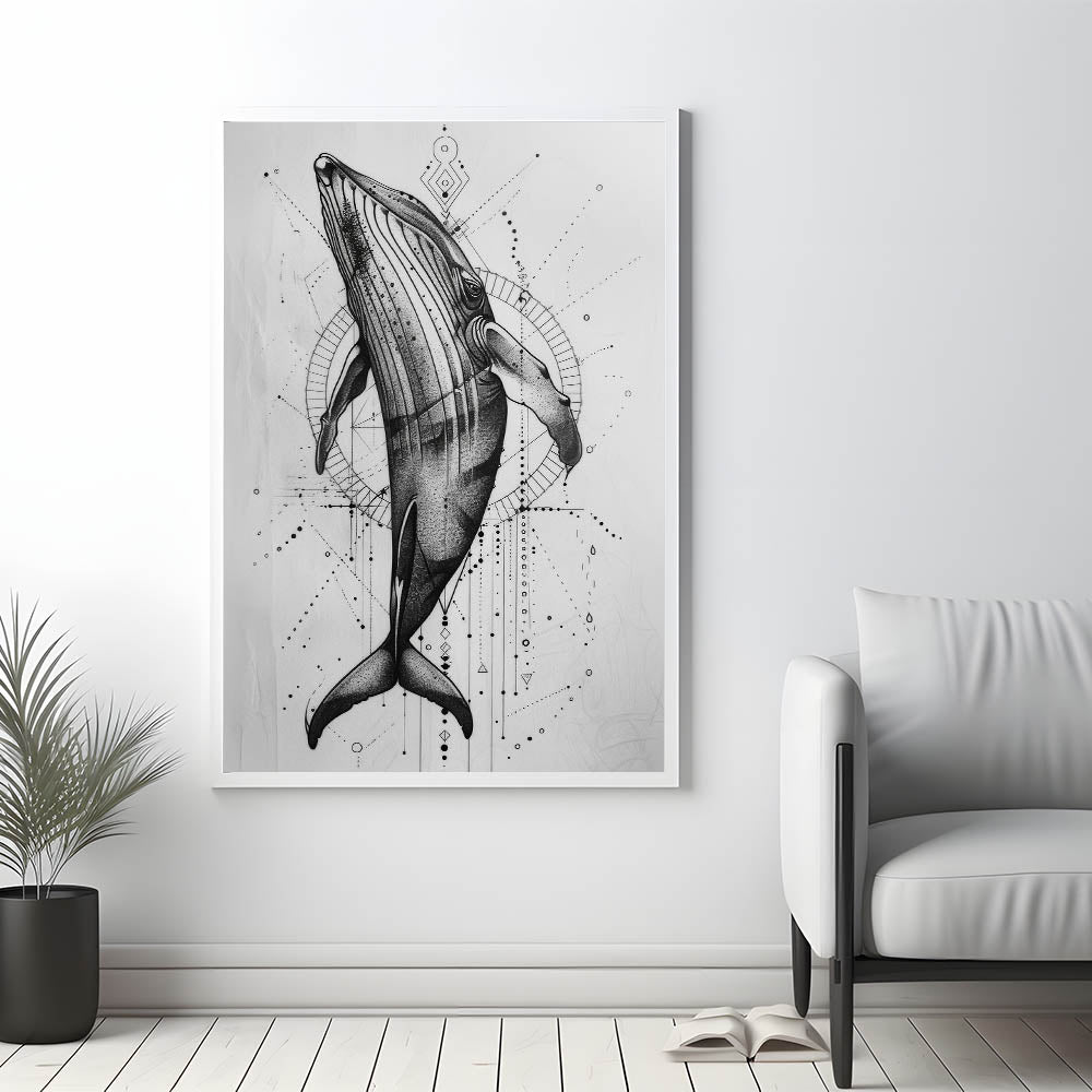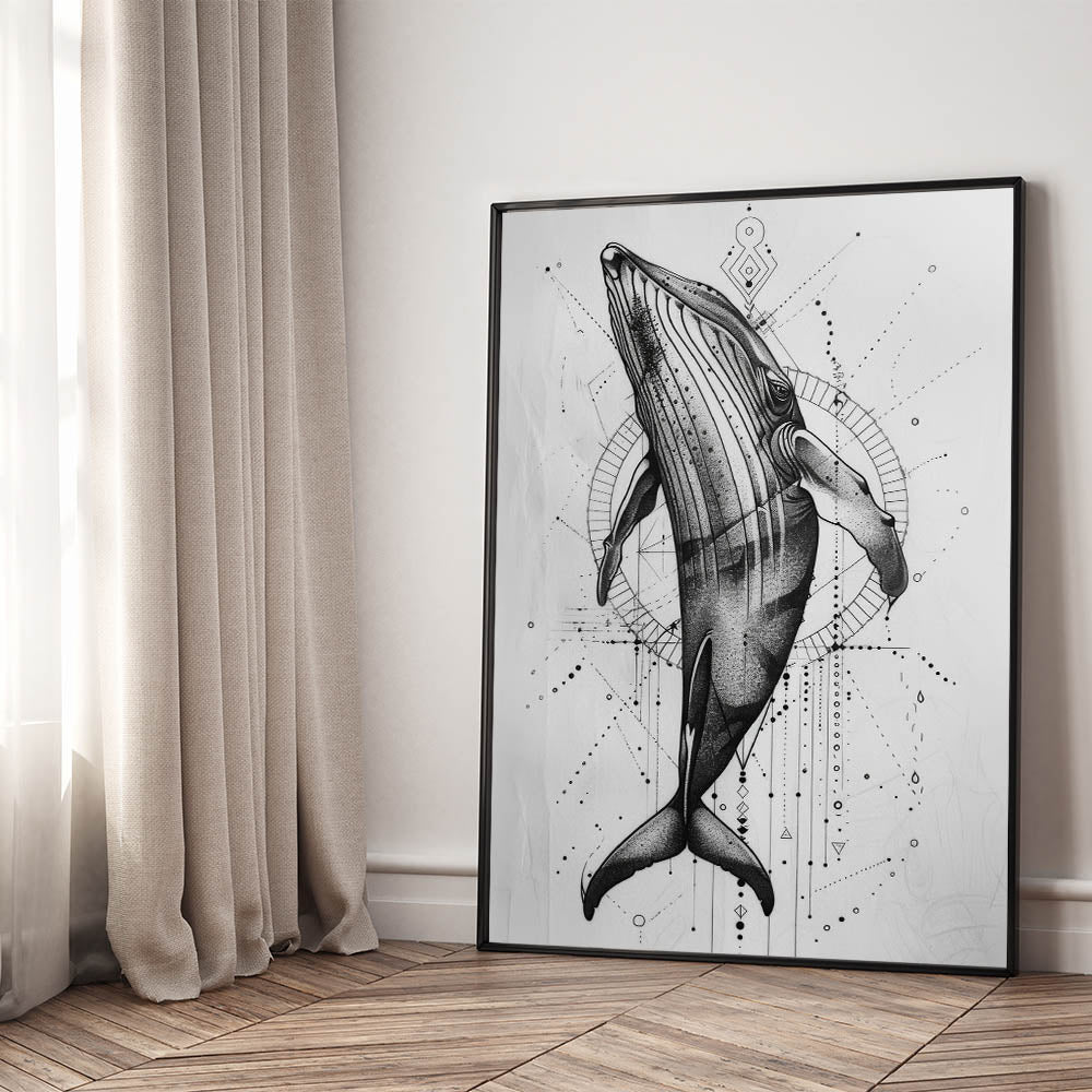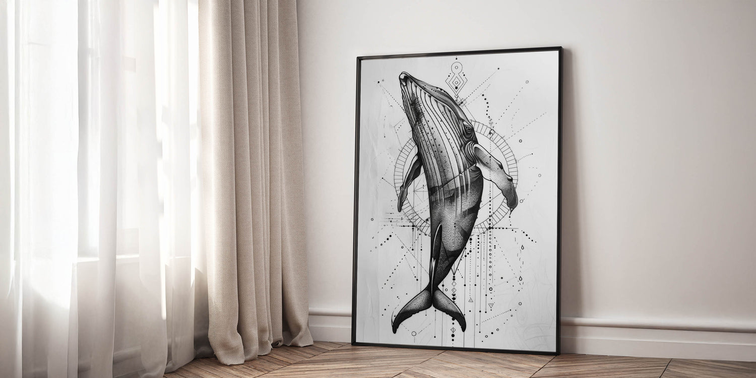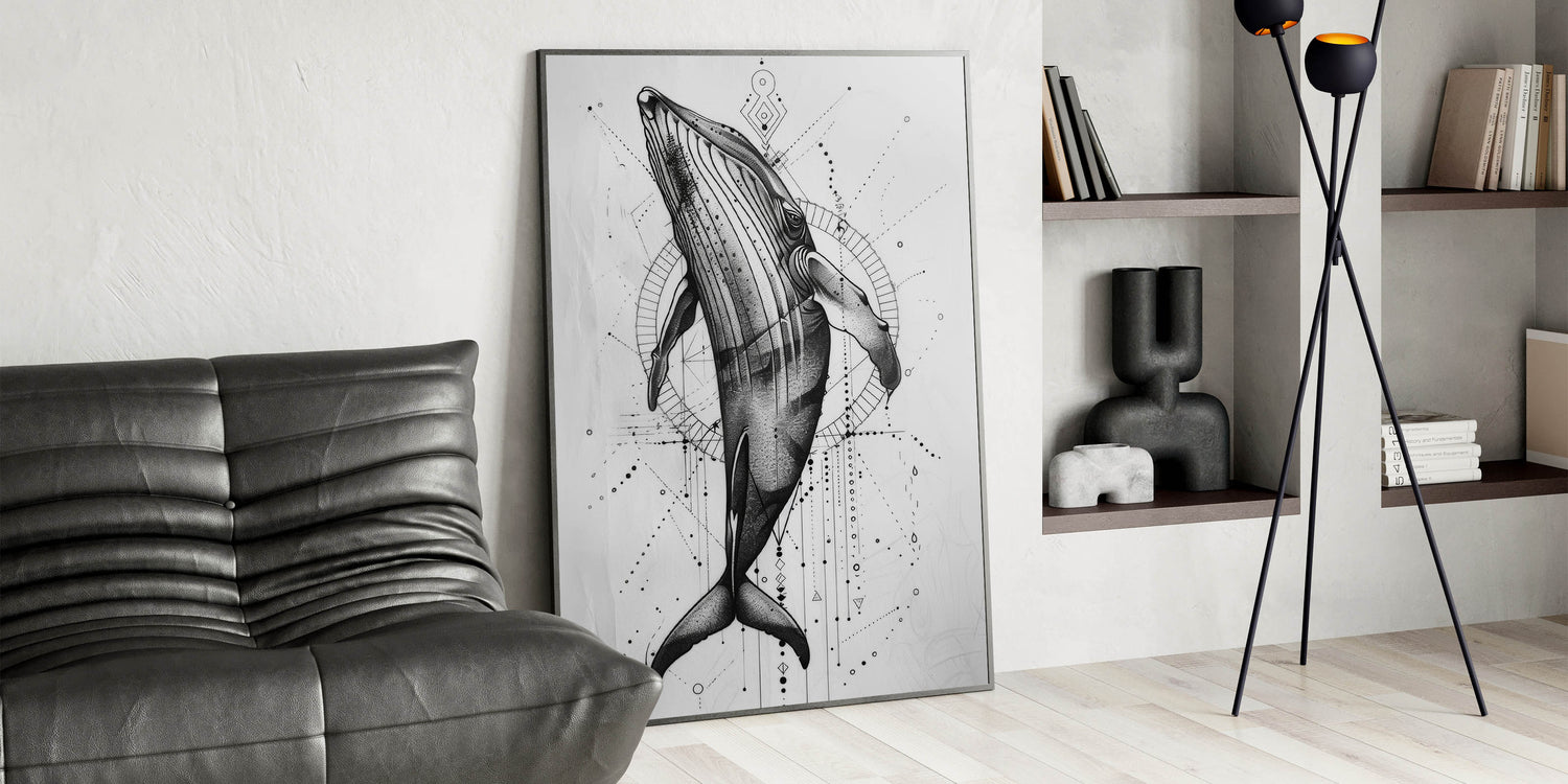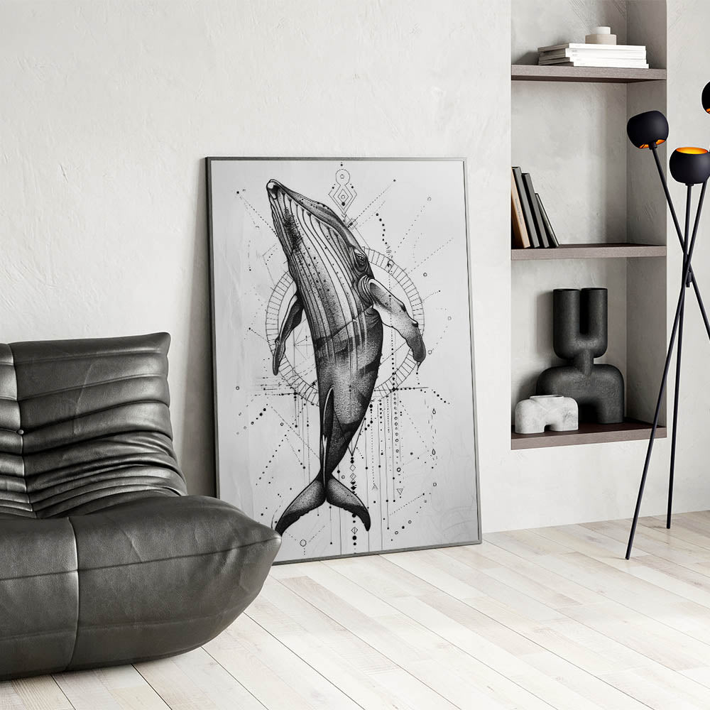 Immerse yourself in the beauty of the deep blue with this Geometric Whale Wall Art, a captivating piece that blends modern geometric patterns with the graceful form of a whale. This artwork, with its intricate black and white design, is perfect for those looking to add a touch of marine life elegance to their space. Whether you’re an ocean lover or a fan of contemporary art, this piece offers a unique way to bring the ocean’s majesty into your home. Available in a range of formats including stretched canvas, framed canvas, acrylic glass, and more, it’s easy to find the perfect fit for your decor.