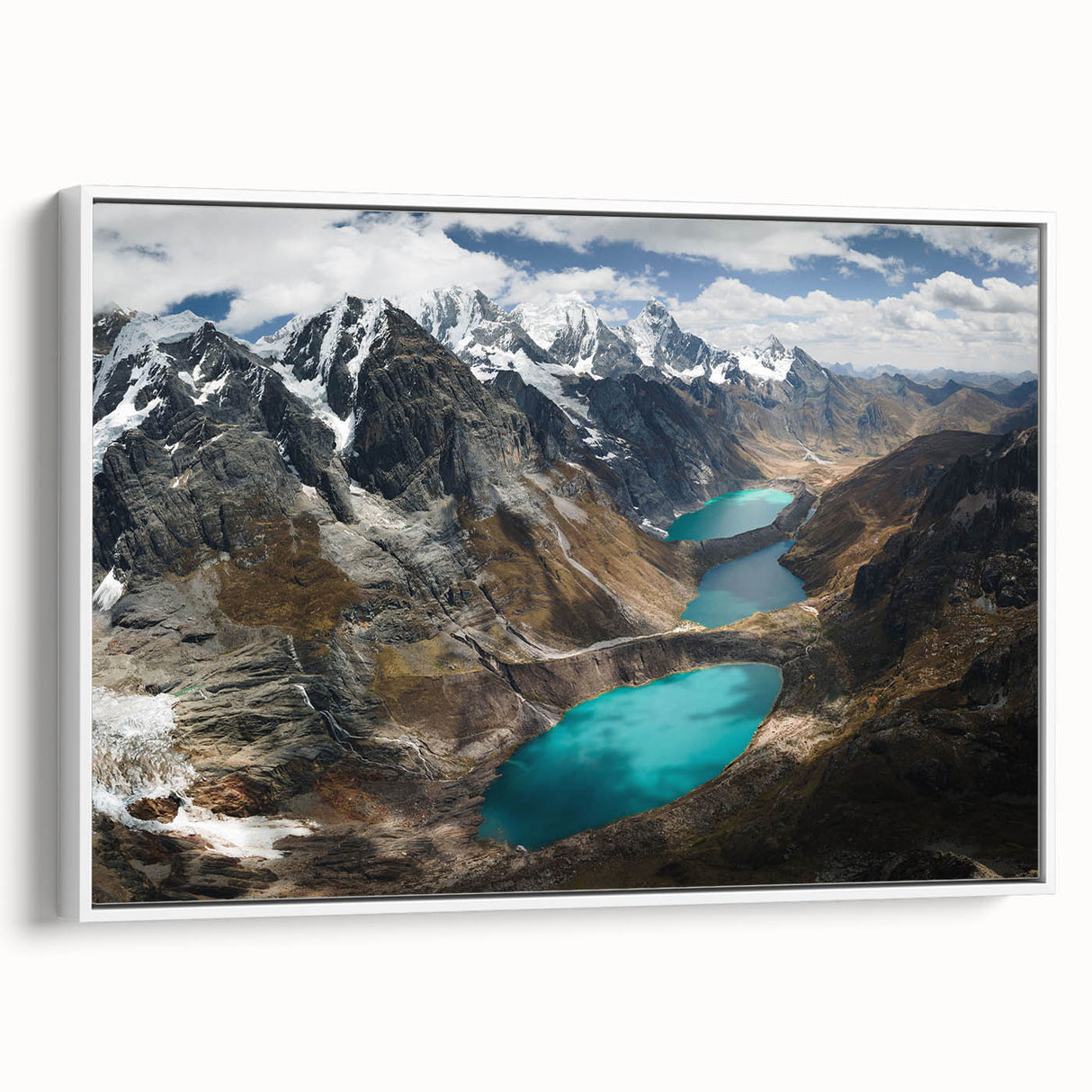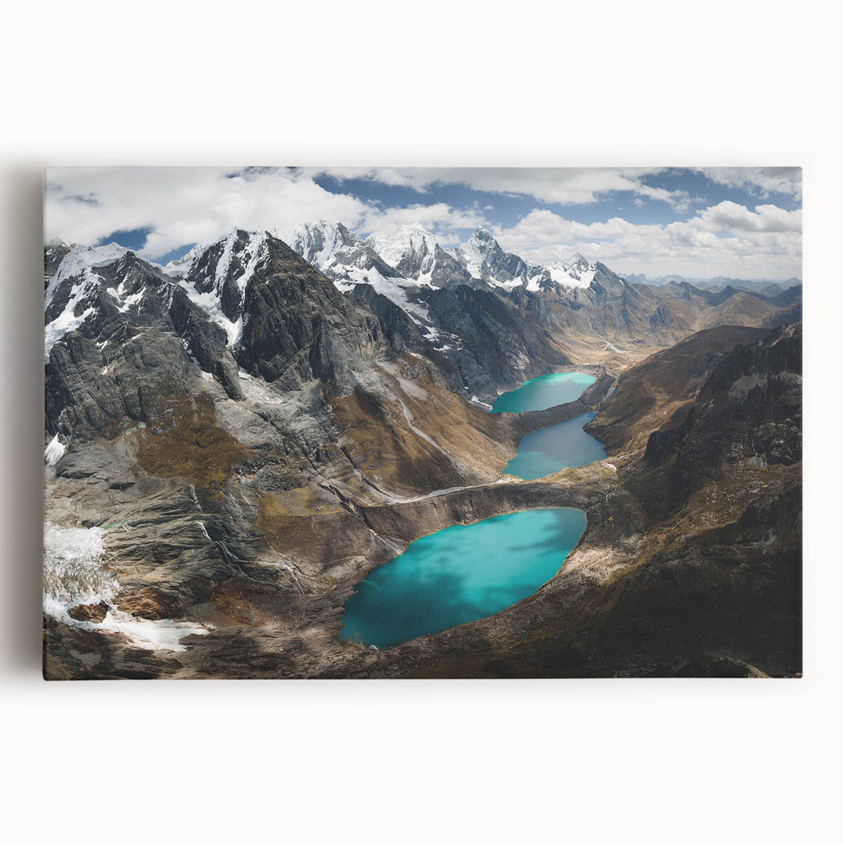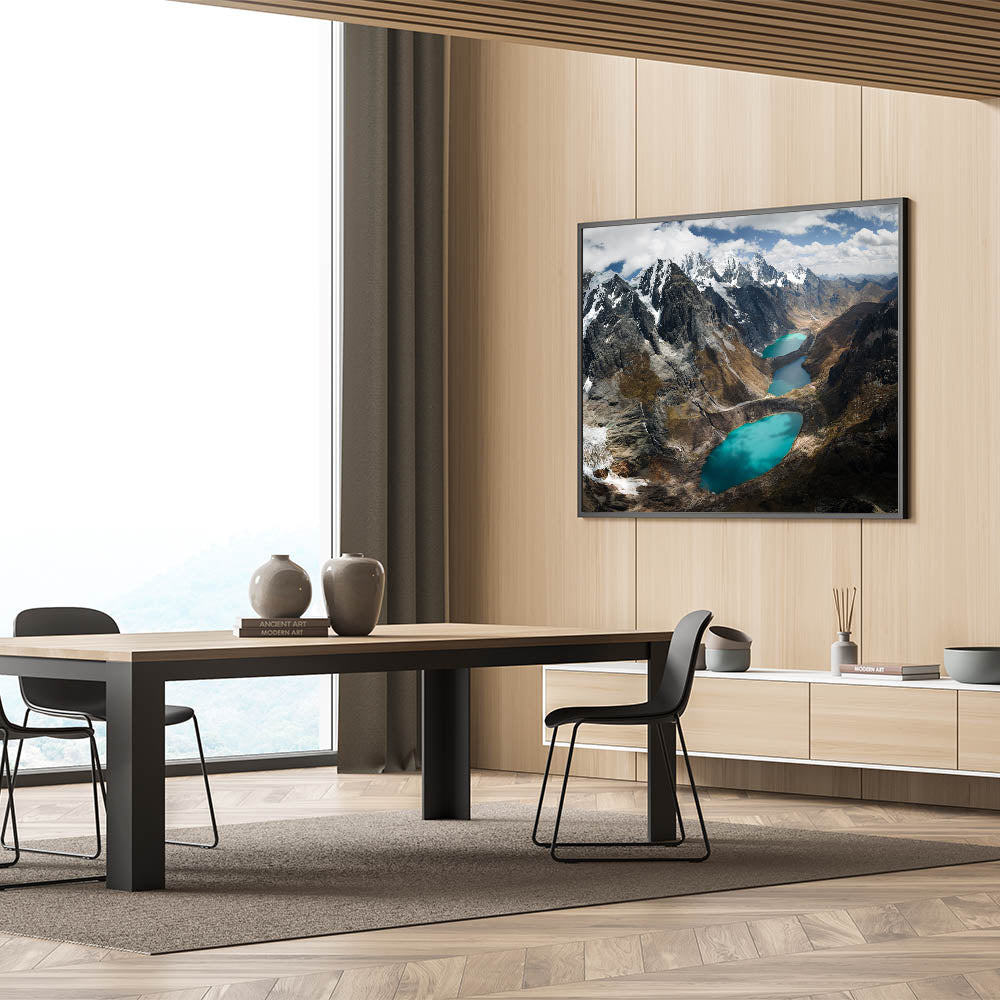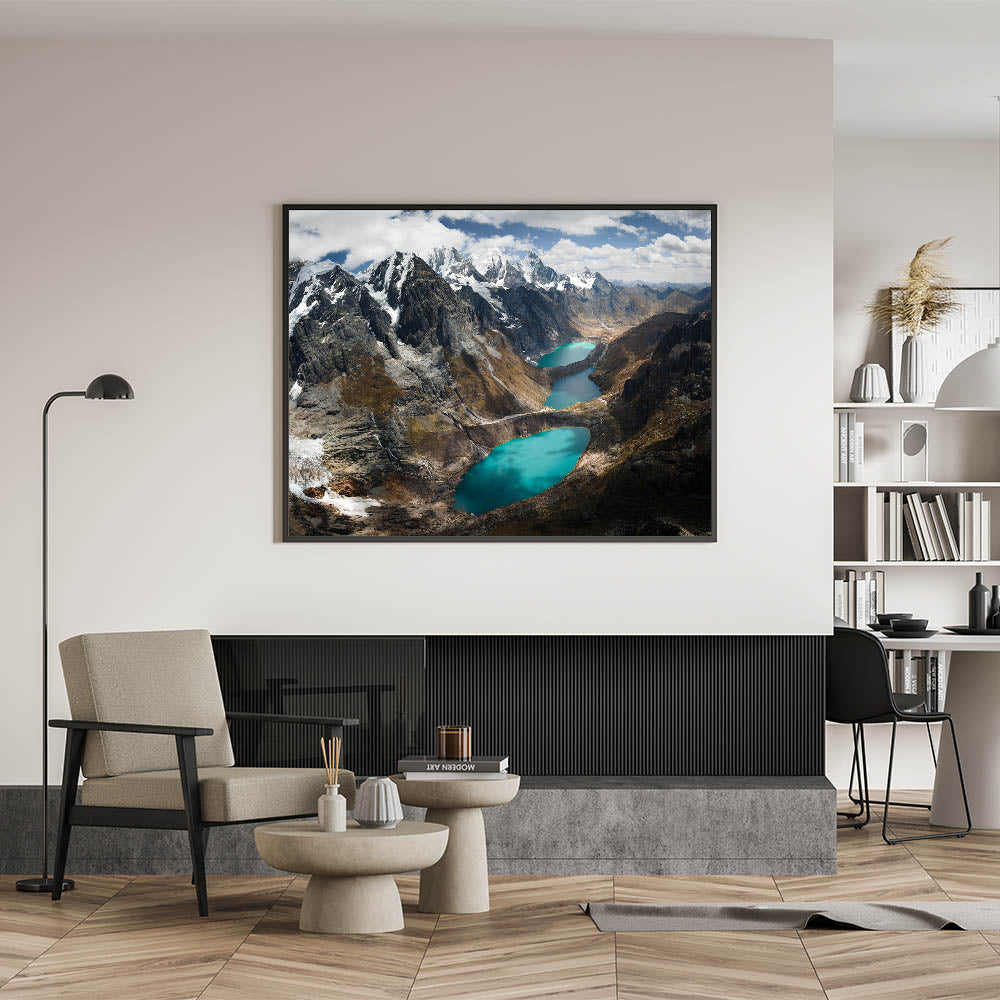 Experience the serene grandeur of the "Glacial Lakes of the Peruvian Andes Canvas Art." This striking piece showcases the awe-inspiring beauty of Peru’s high-altitude lakes, nestled among rugged mountains under a vast, cloud-strewn sky.