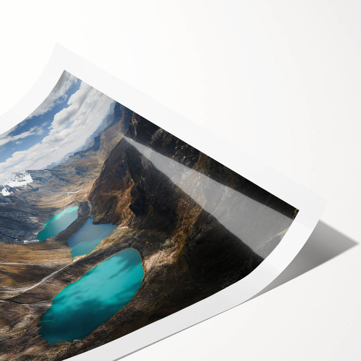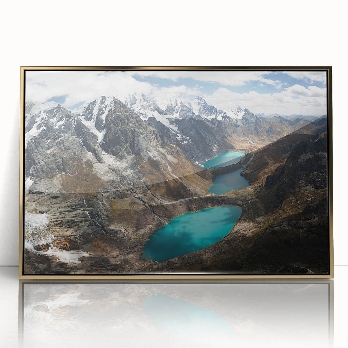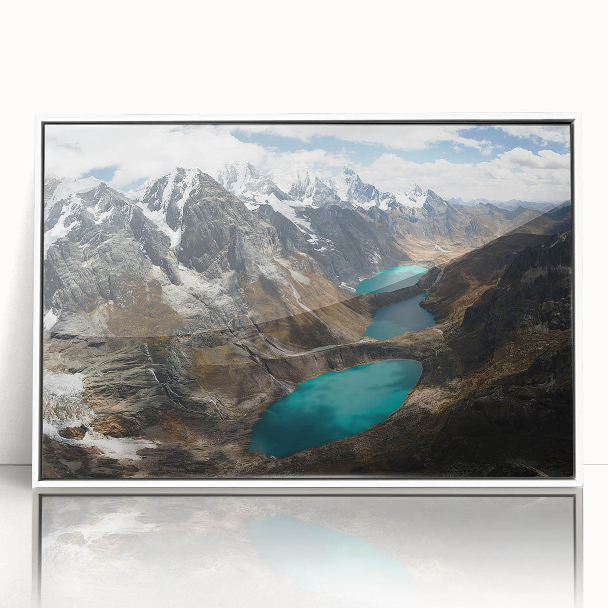 Experience the serene grandeur of the "Glacial Lakes of the Peruvian Andes Canvas Art." This striking piece showcases the awe-inspiring beauty of Peru’s high-altitude lakes, nestled among rugged mountains under a vast, cloud-strewn sky.