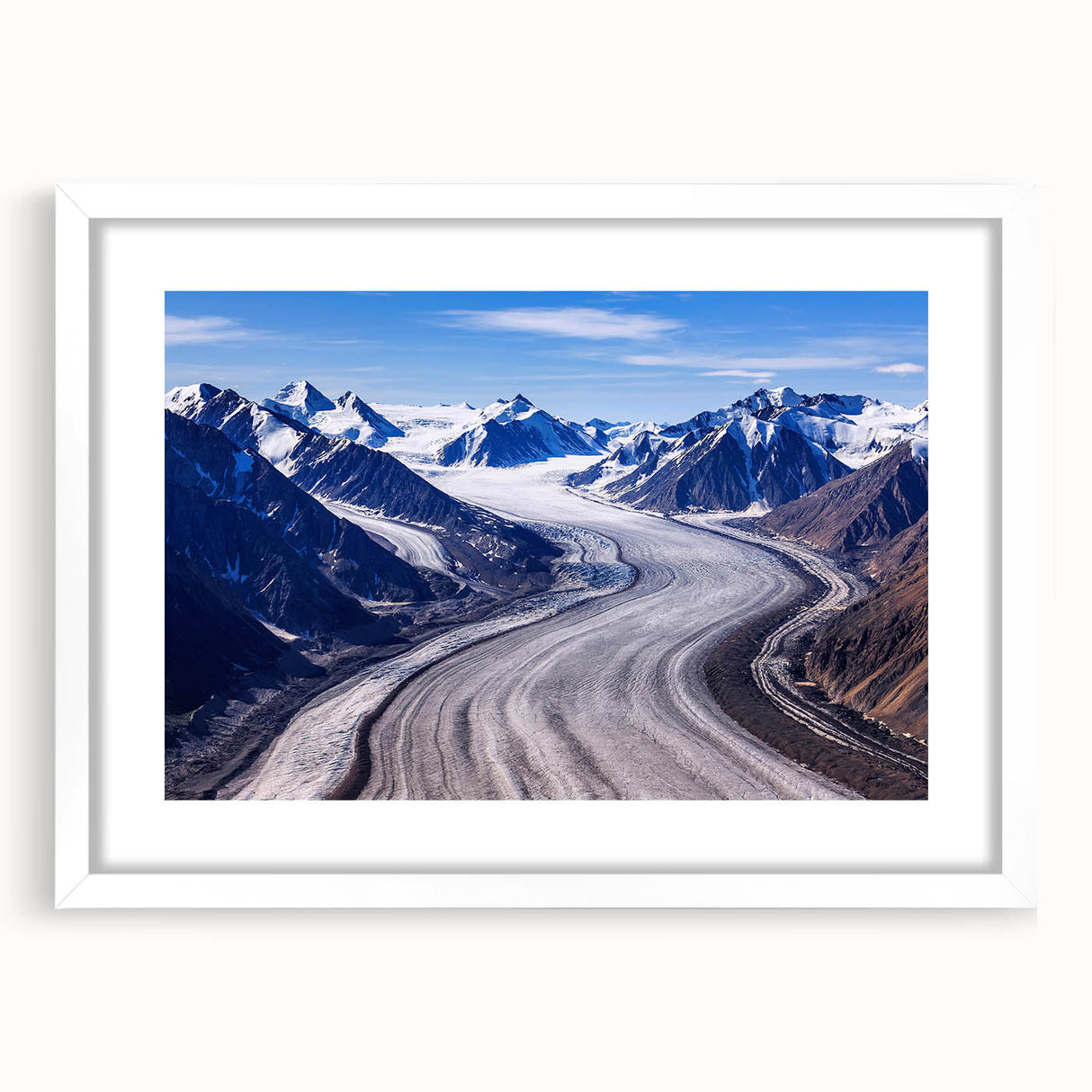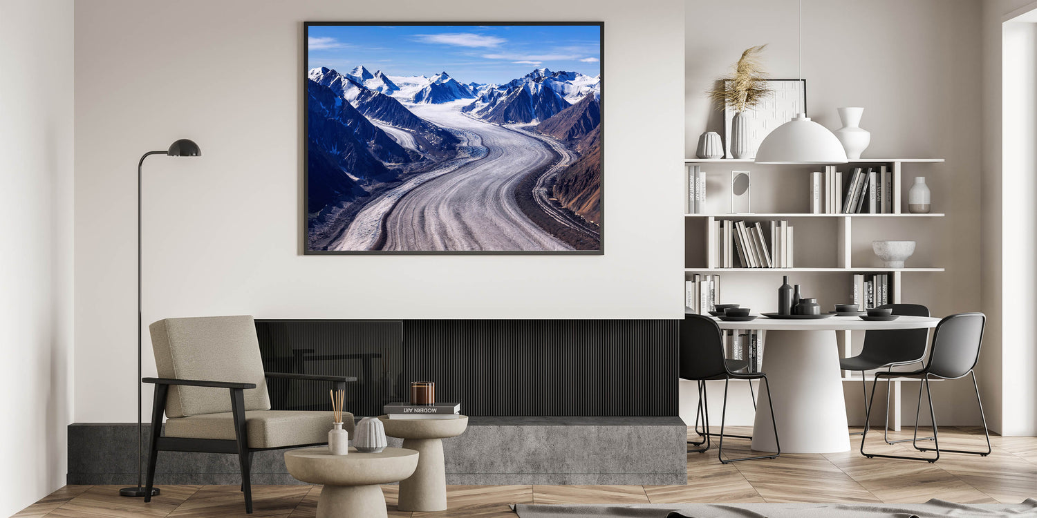 Witness the awe-inspiring grandeur of Yukon's glaciers with our 'Glacial Majesty of Yukon' canvas print. This piece beautifully captures the expansive ice flows set against a backdrop of rugged mountain peaks, providing a breathtaking view of nature's power and beauty.