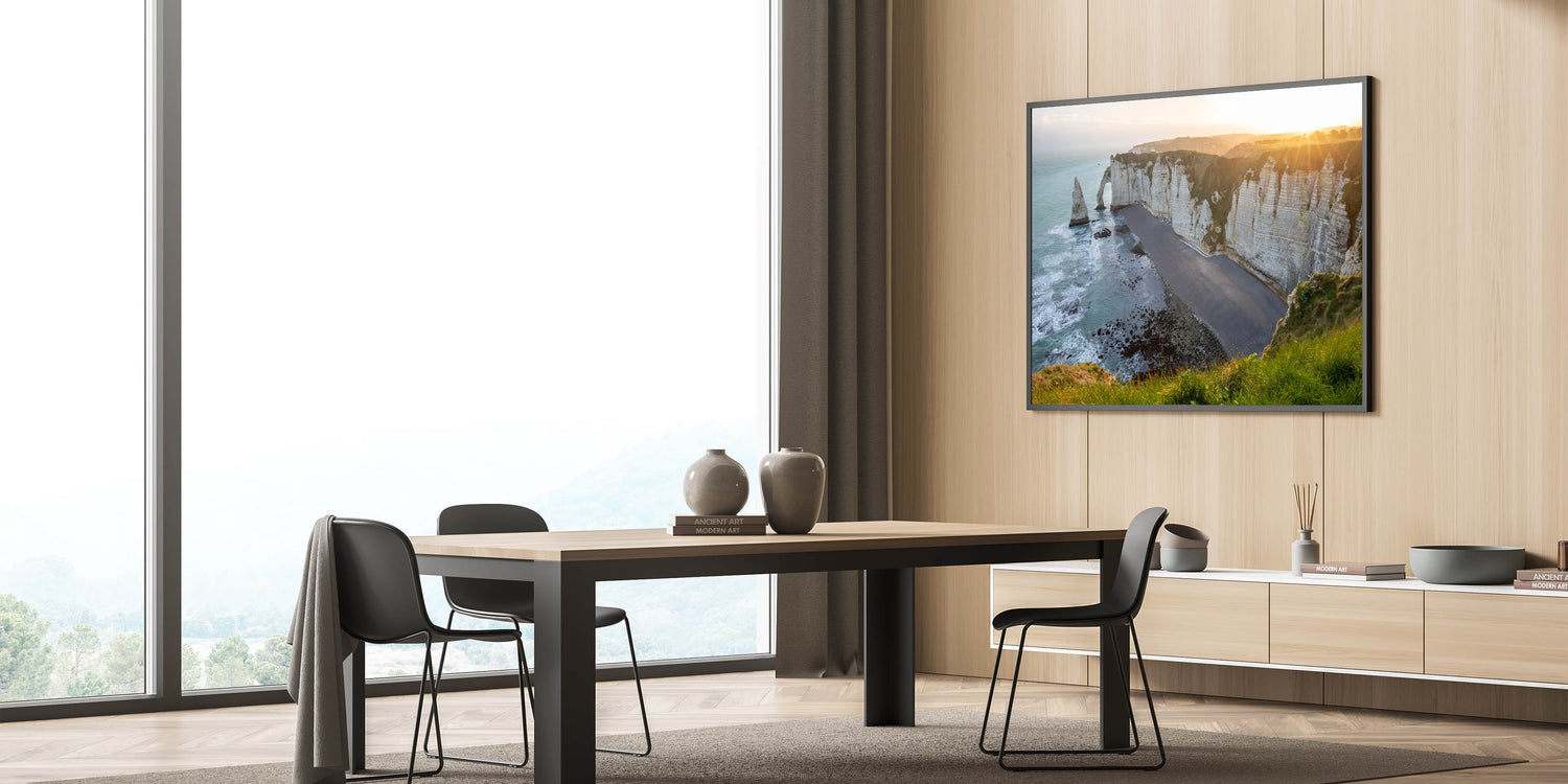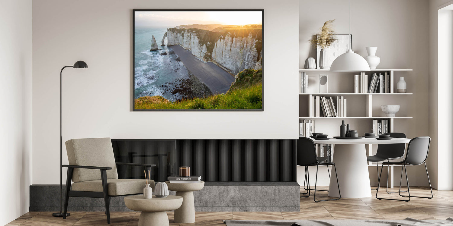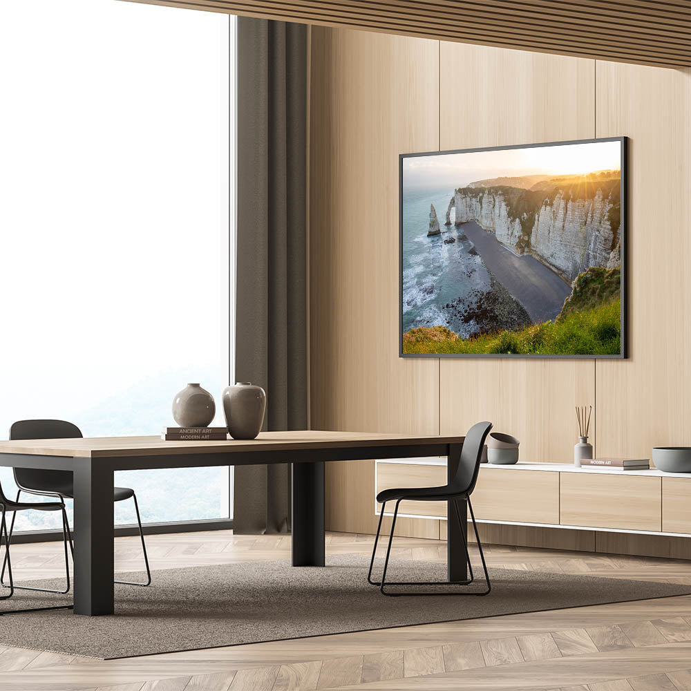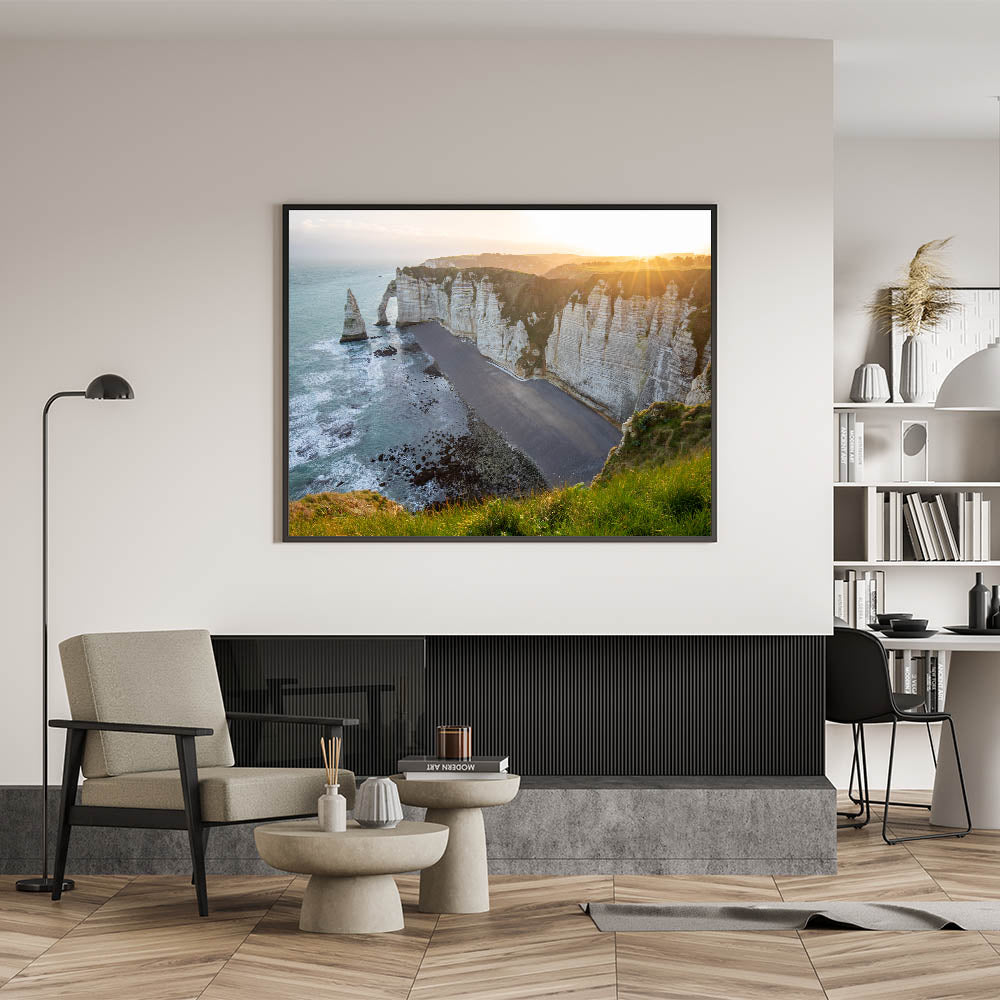 - Captivating Coastal Colors: The combination of warm golden light, white cliffs, and blue ocean creates a visually stunning piece that brings the tranquility of the coast to your home.