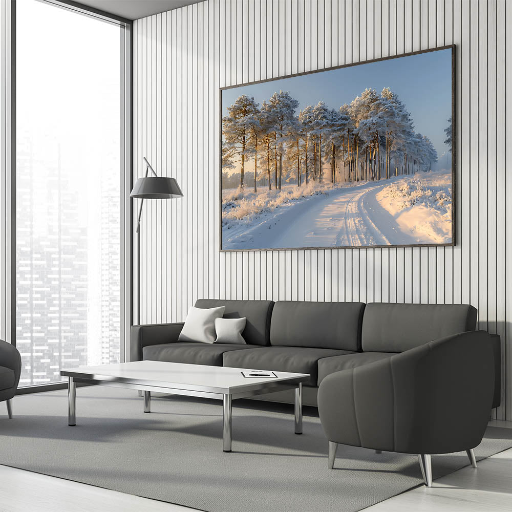 Capture the tranquil beauty of a winter morning with this exquisite golden hour winter path tree wall art. This artwork features a serene, snow-covered path winding through a forest of tall pines, gently kissed by the warm light of the rising sun. The golden sunlight contrasts beautifully with the crisp white snow and the soft blue sky, creating a peaceful and inviting atmosphere.