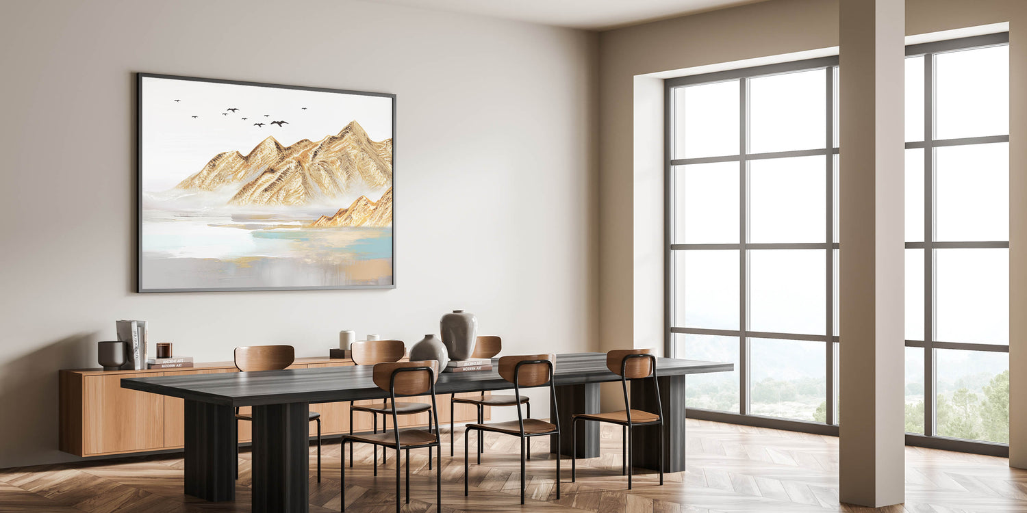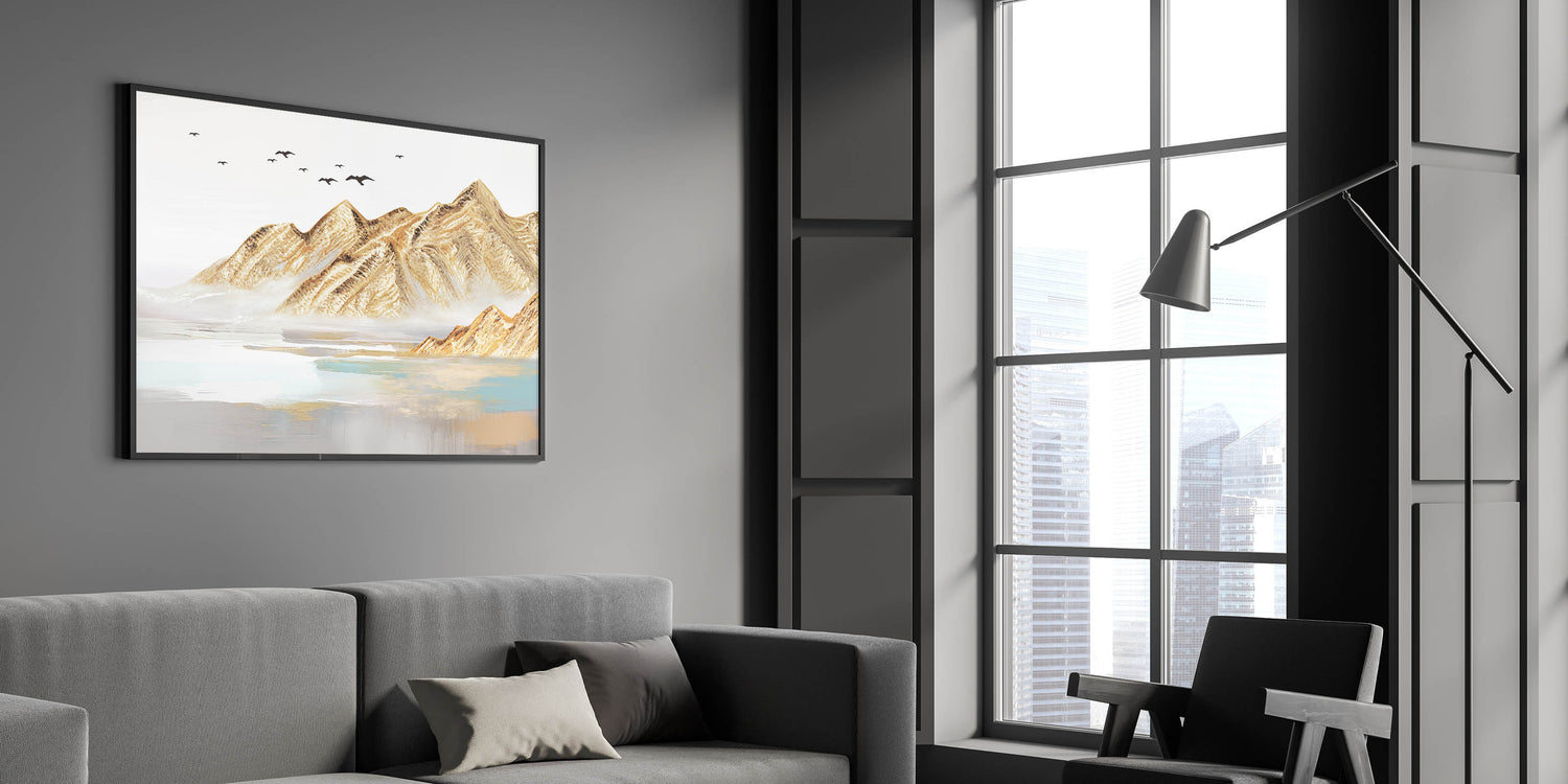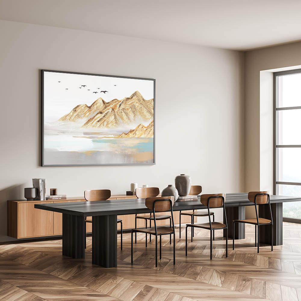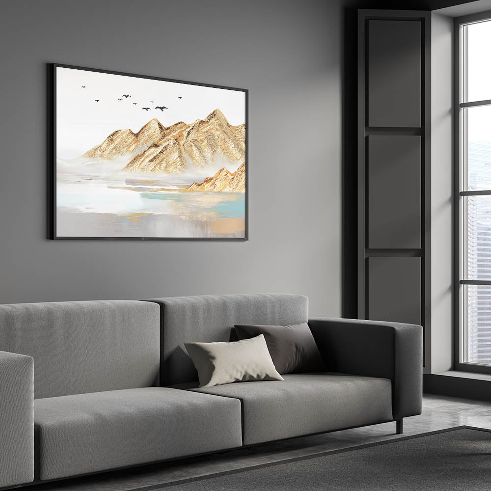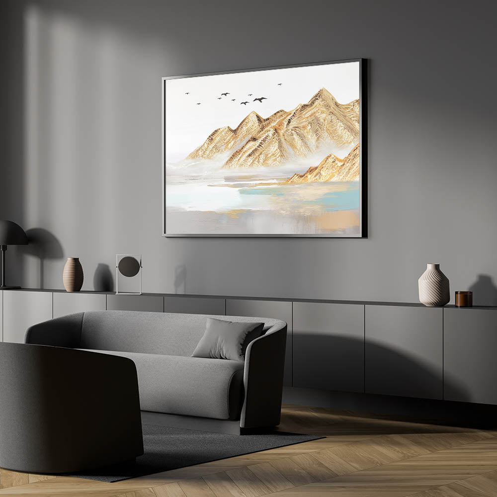 Add a touch of elegance and sophistication to your home or office with this captivating mountain landscape. The blend of gold and soft tones creates a calming atmosphere, making it a perfect addition to any decor style.