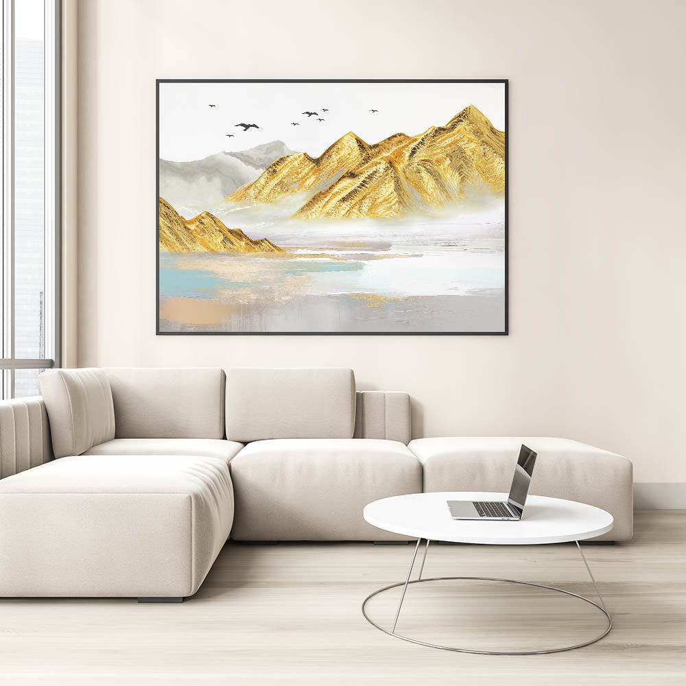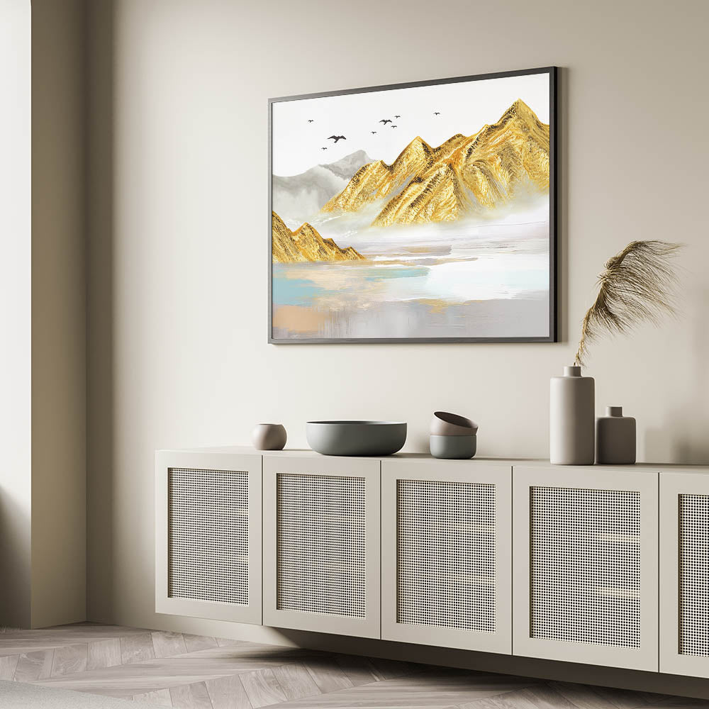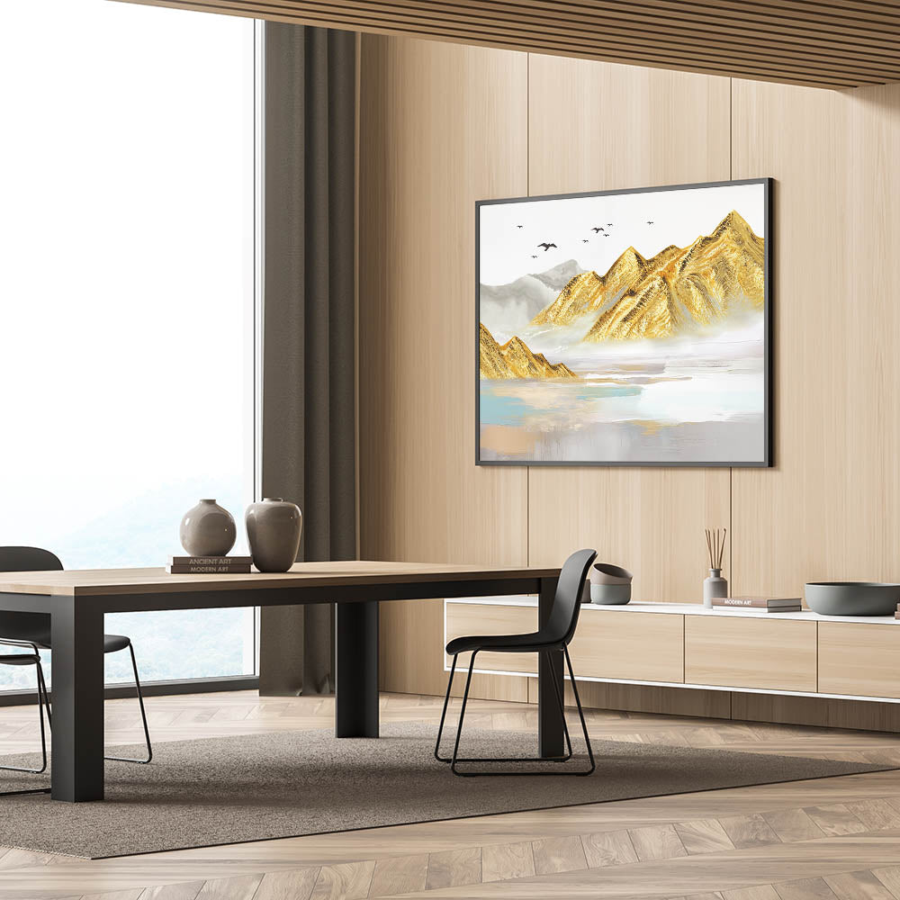 Elevate your home decor with this exquisite golden mountain abstract landscape, a perfect focal point for living rooms, offices, or any space that seeks a touch of opulence and nature-inspired serenity.