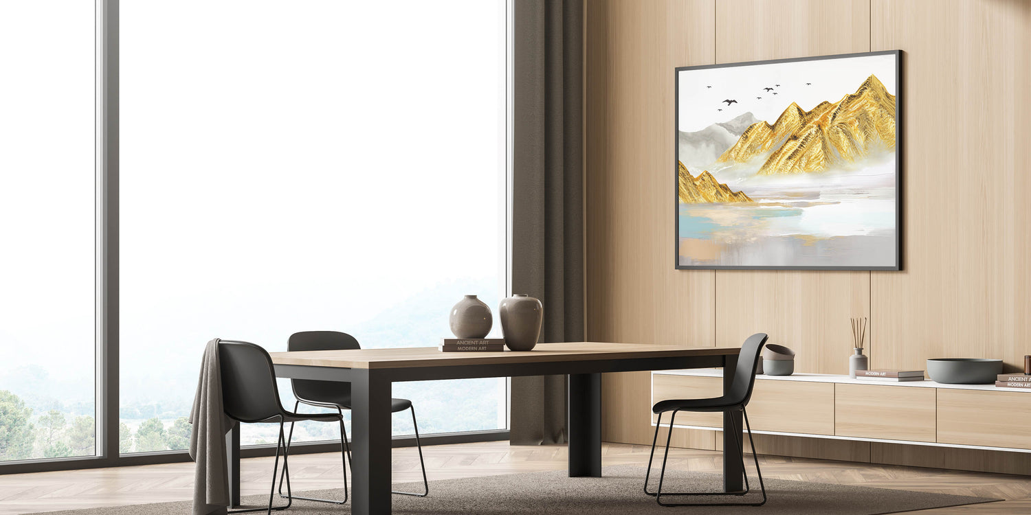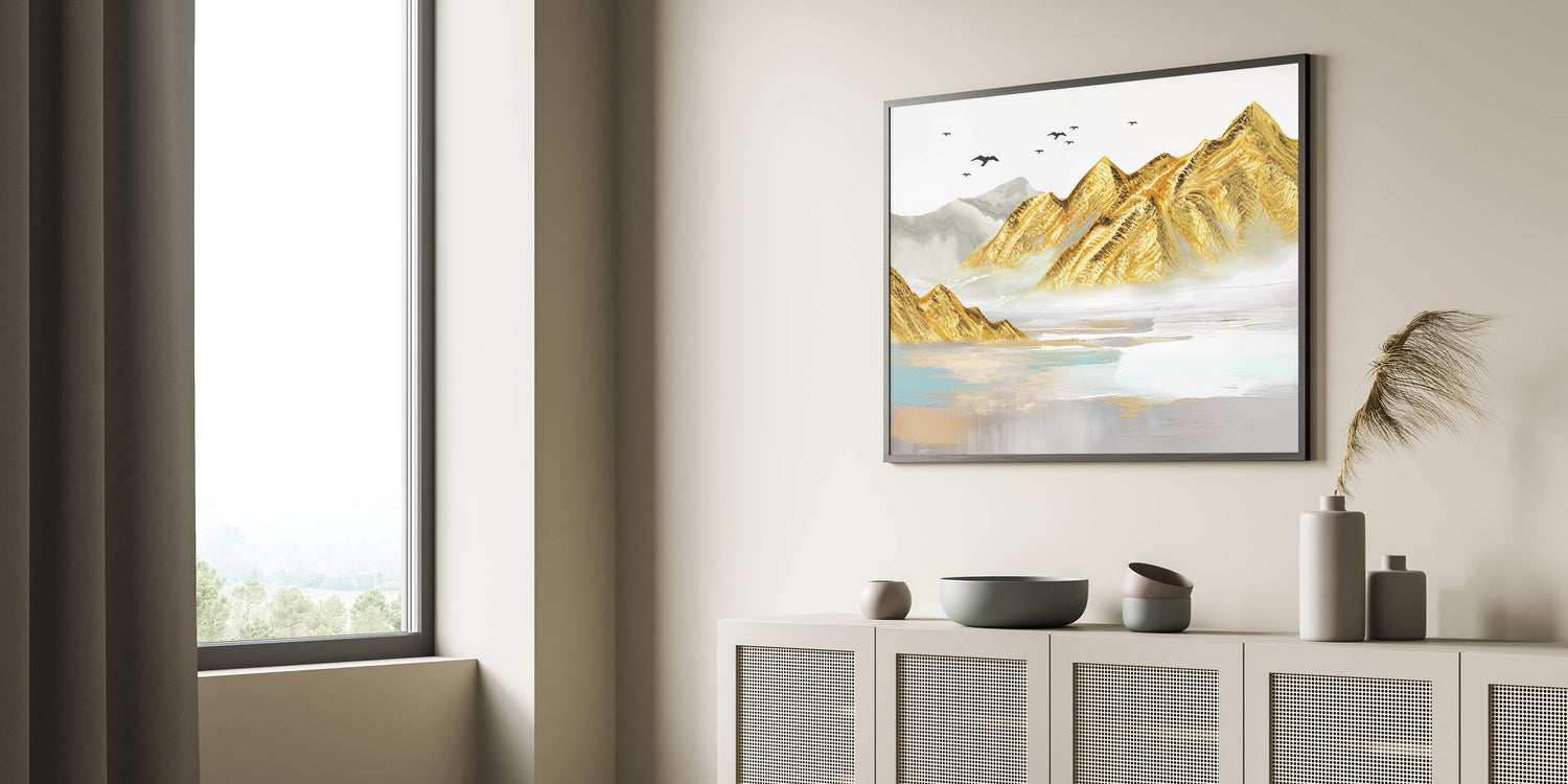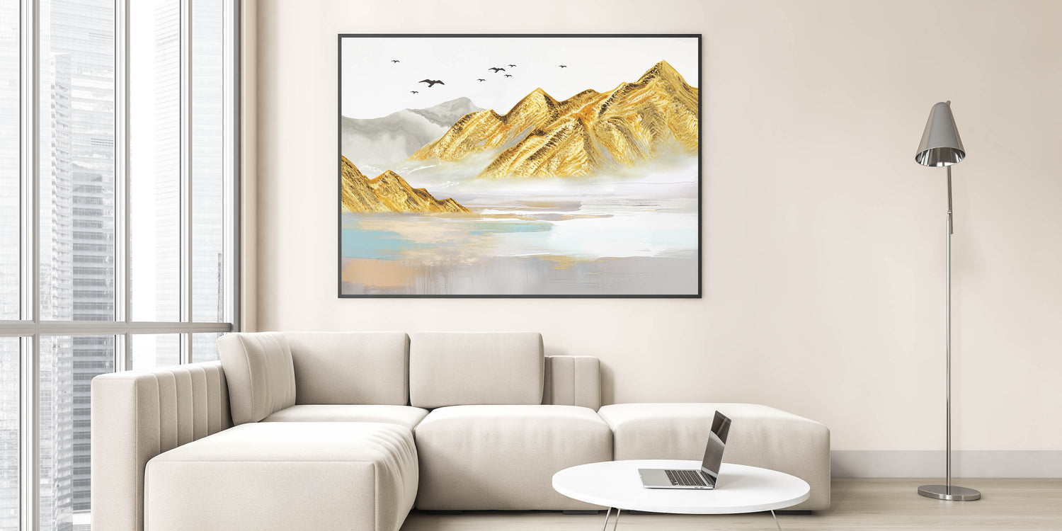 Elevate your home decor with this exquisite golden mountain abstract landscape, a perfect focal point for living rooms, offices, or any space that seeks a touch of opulence and nature-inspired serenity.