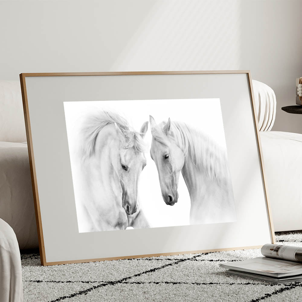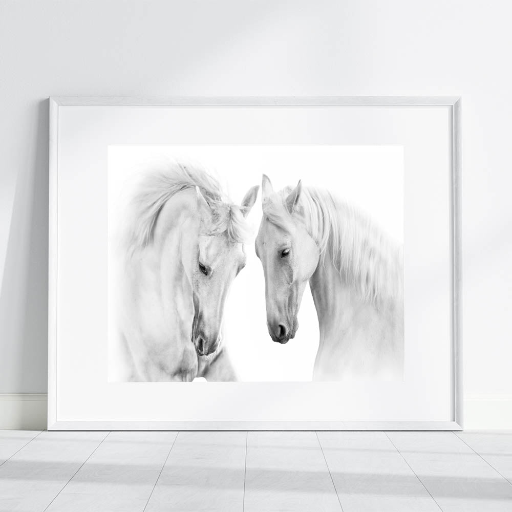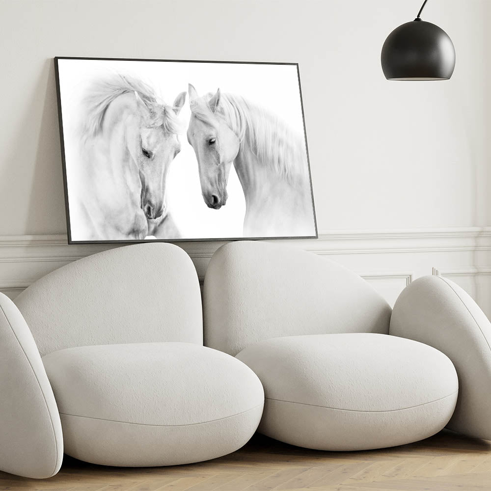 Bring a touch of elegance to your space with this captivating horse wall art. This stunning black and white canvas print features two beautifully detailed horses captured in a moment of serene connection. The monochromatic palette enhances the natural grace of the horses, making this piece a timeless addition to any room.
