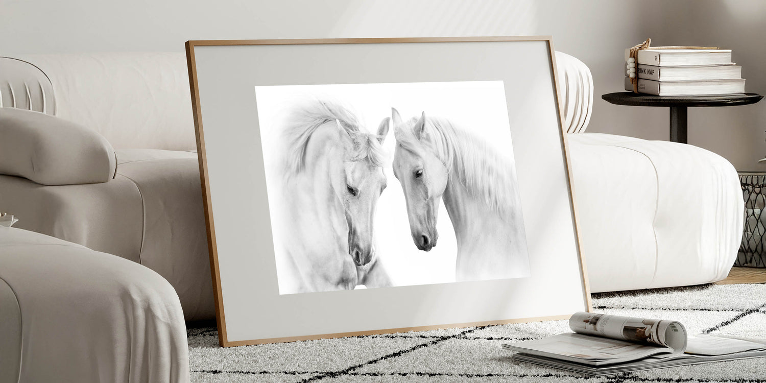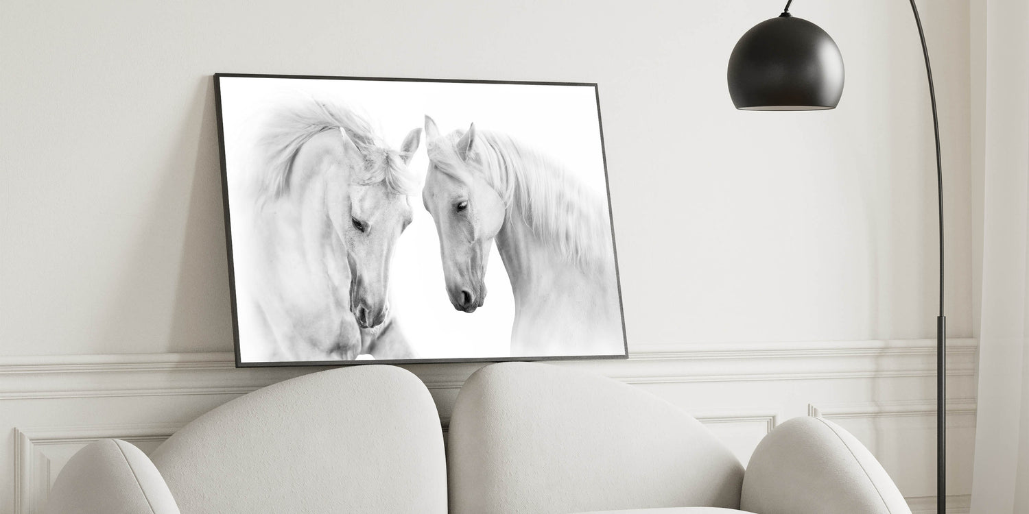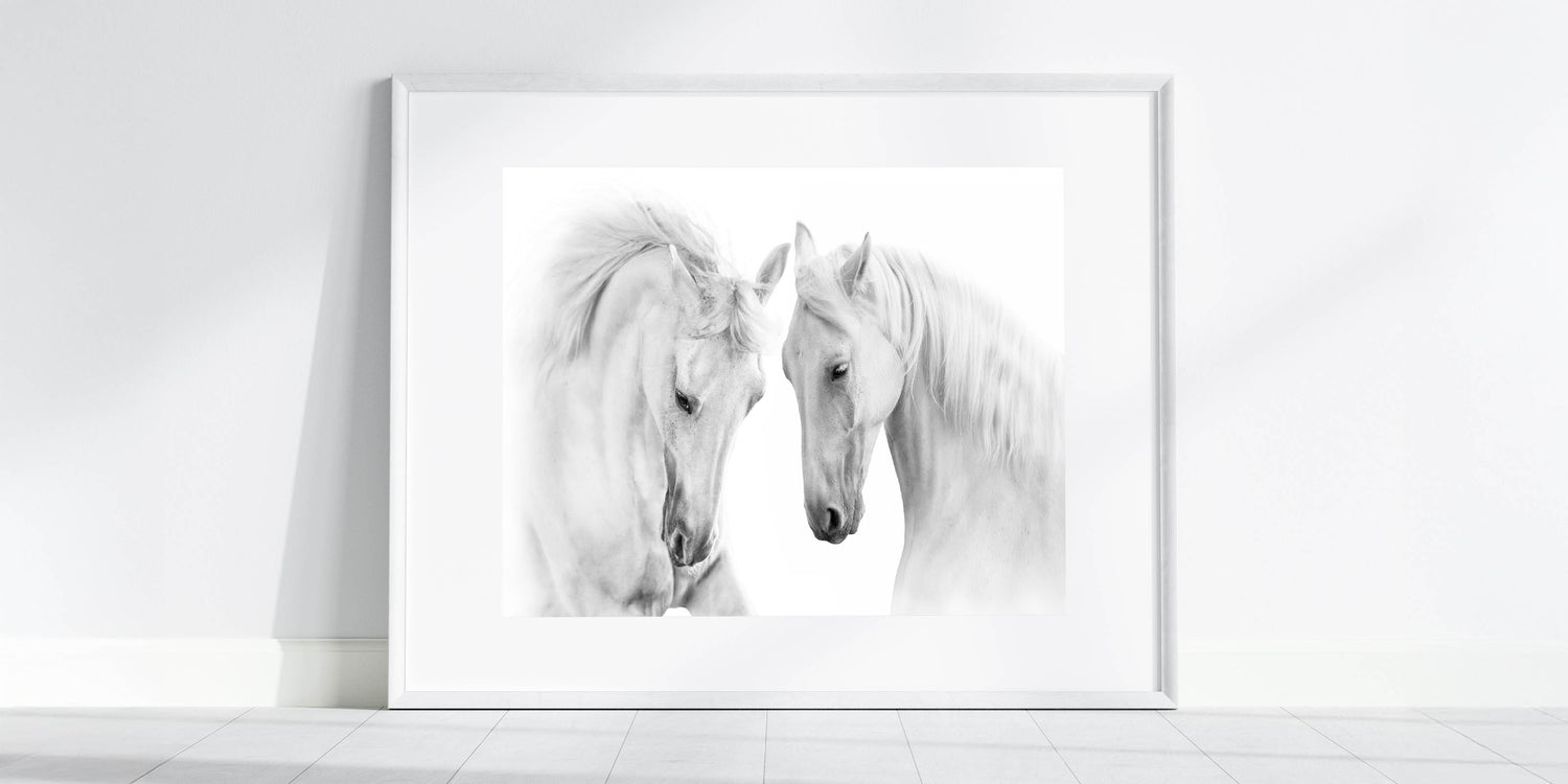 Bring a touch of elegance to your space with this captivating horse wall art. This stunning black and white canvas print features two beautifully detailed horses captured in a moment of serene connection. The monochromatic palette enhances the natural grace of the horses, making this piece a timeless addition to any room.