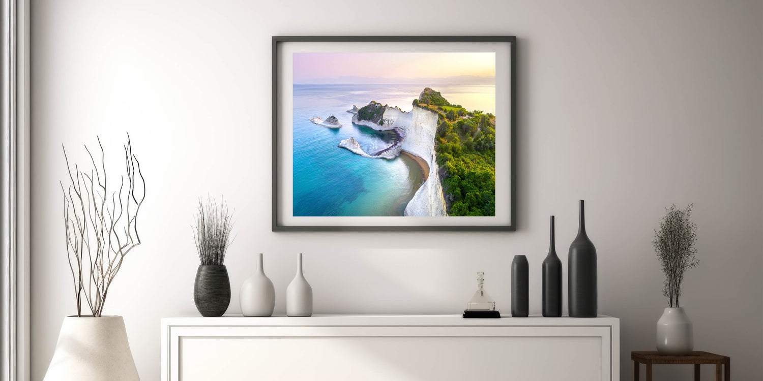 Explore the captivating beauty of Greece’s coastline with this striking Greek Coastline art featuring the dramatic cliffs and serene waters of Corfu. This artwork showcases the breathtaking landscape where steep white cliffs meet calm turquoise seas, capturing the peaceful yet awe-inspiring essence of Greece’s natural beauty. Perfect for lovers of coastal landscapes and Mediterranean charm, this piece adds a touch of tranquility to any space.
