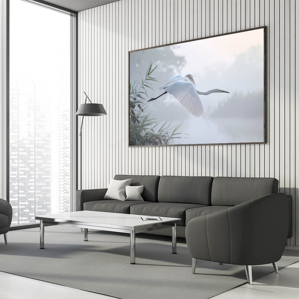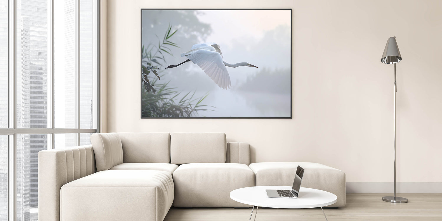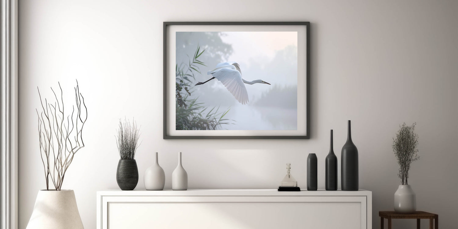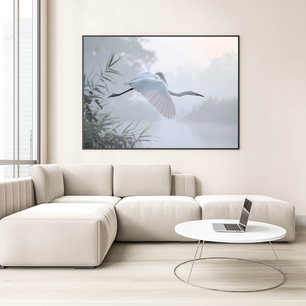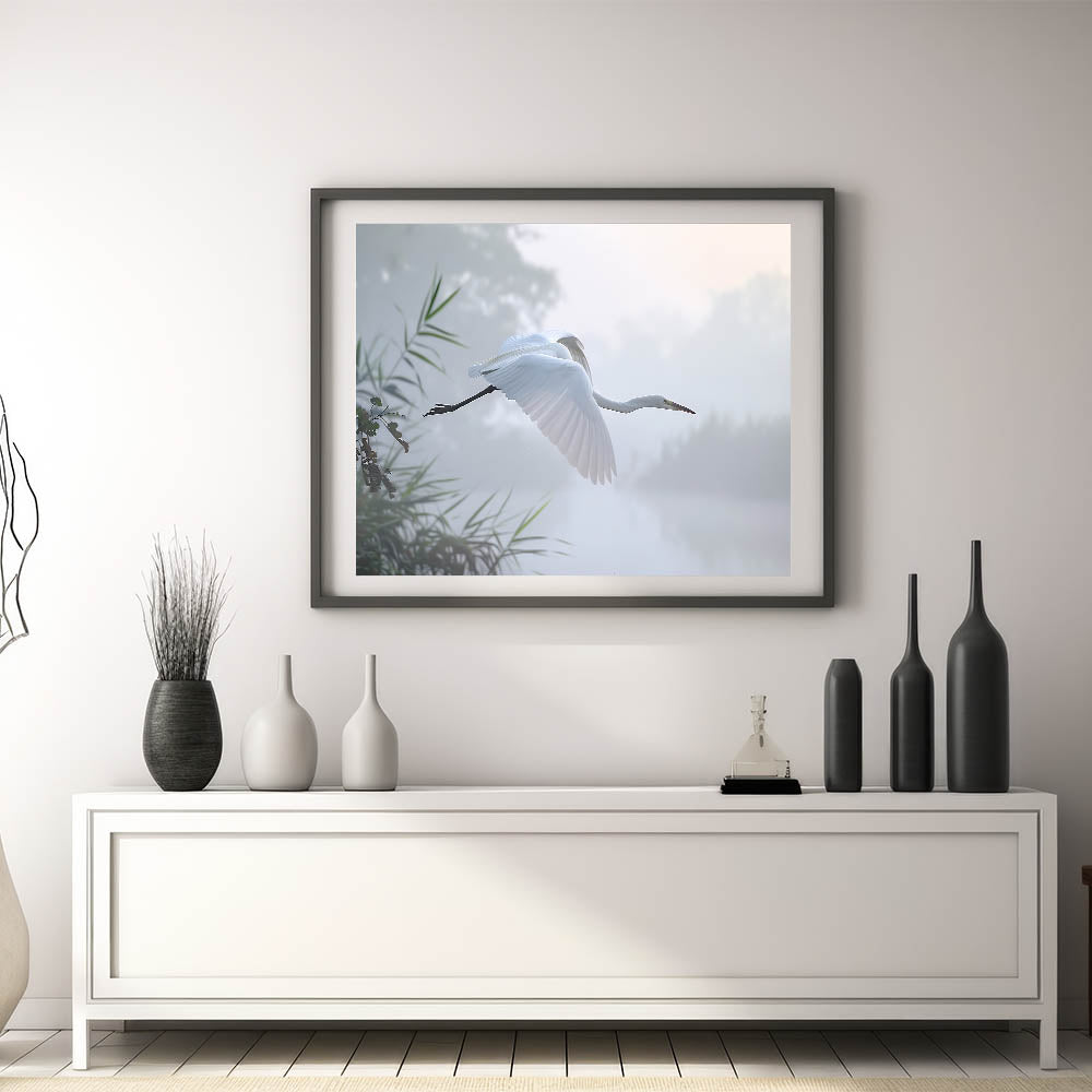 Transform your space with this stunning depiction of a heron in flight through a misty marsh, where the interplay of light and fog creates a serene and ethereal ambiance. Perfect for nature lovers and those looking to add a peaceful, wildlife-inspired element to their decor. Explore our collection of marsh and swamp wall art to find the perfect piece for your home.
