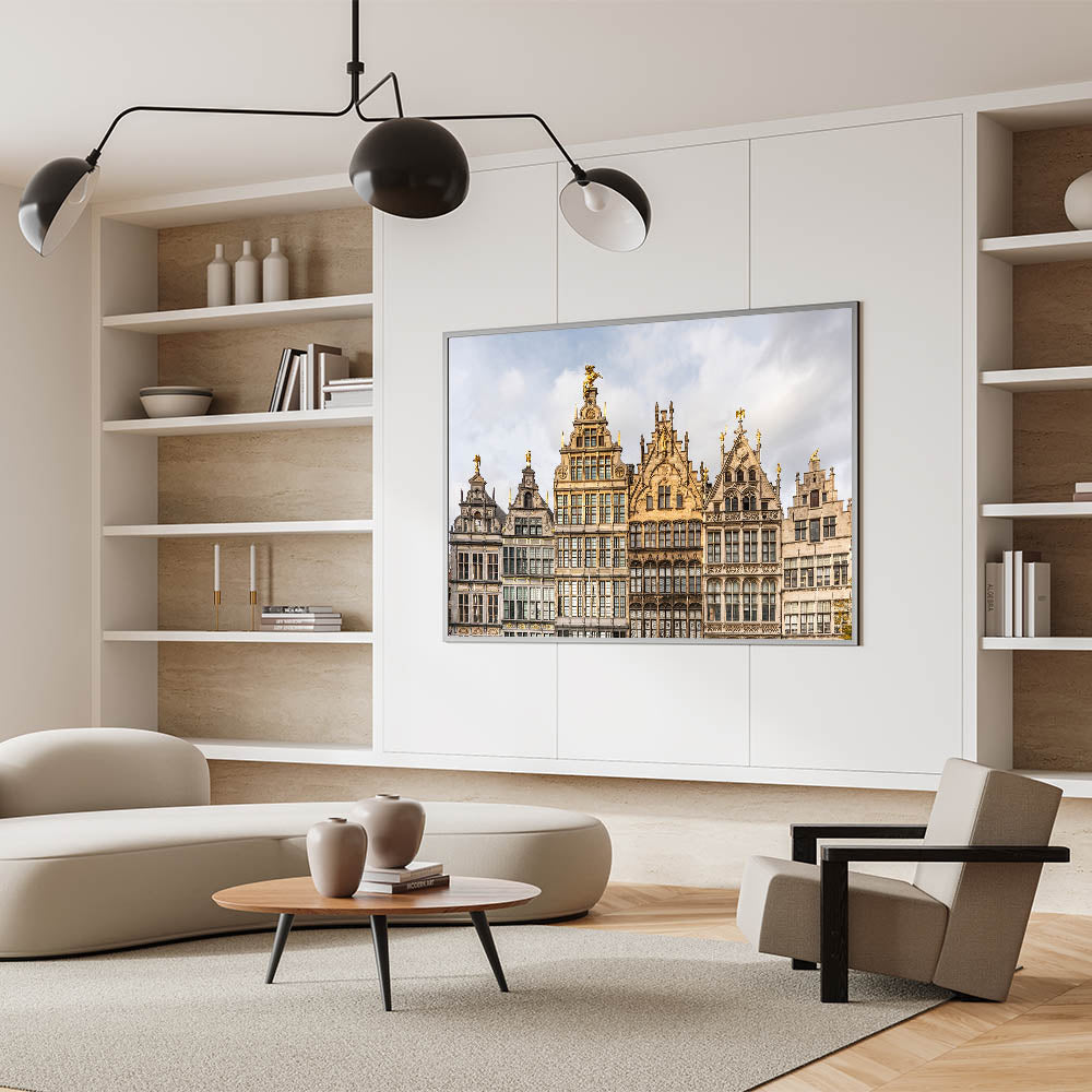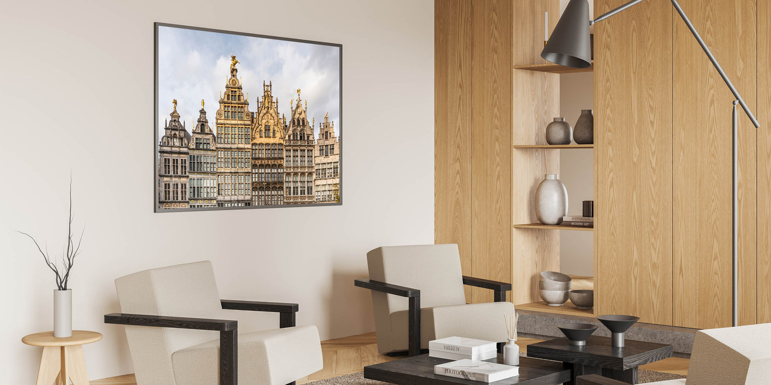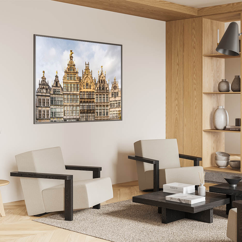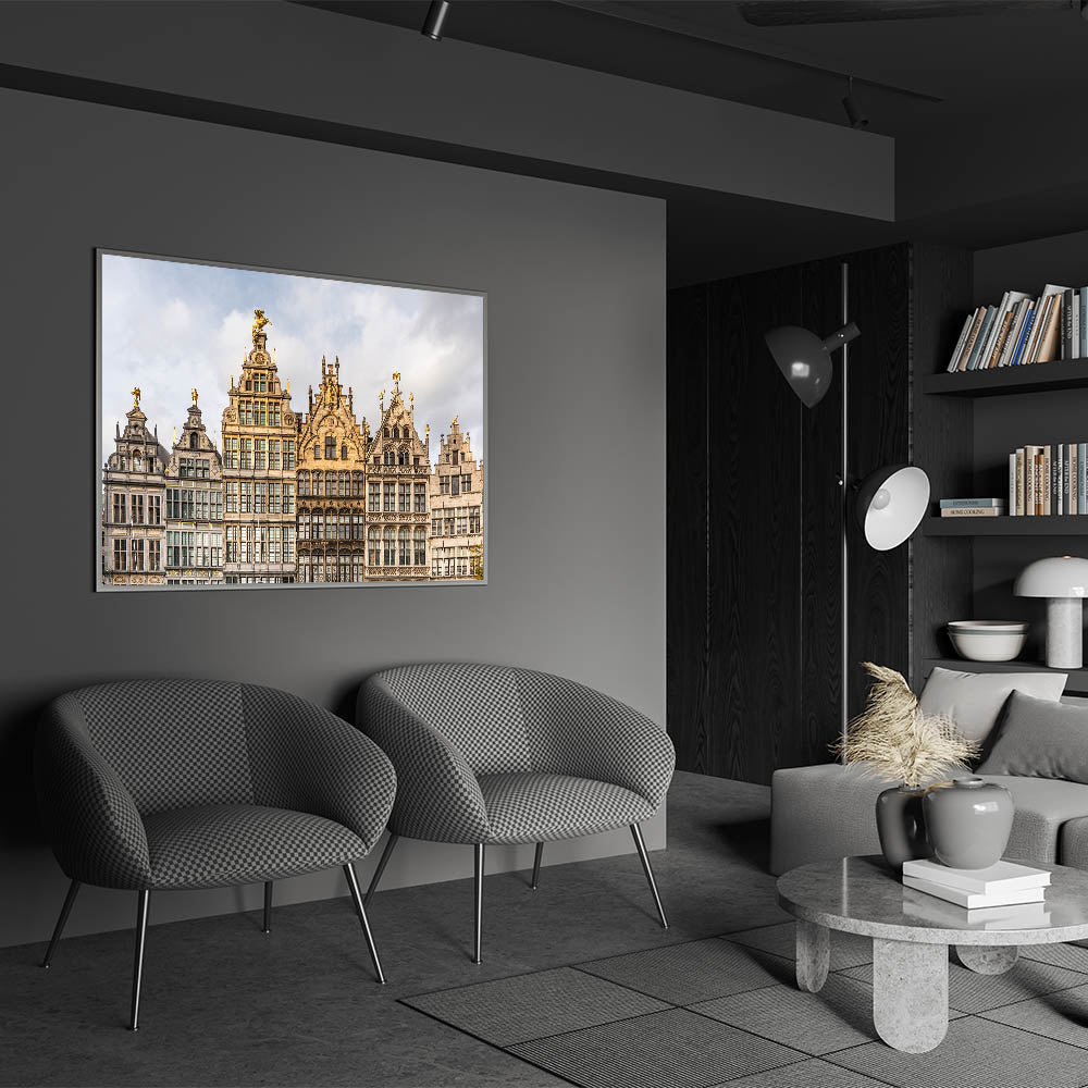 Celebrate Belgium’s rich architectural heritage with this stunning print featuring the famous guildhalls of Antwerp. These historic buildings, adorned with intricate details and golden sculptures, represent the grandeur of Belgium's past. This Belgium wall art beautifully captures the elegant facade of the guildhalls, making it a perfect addition to your home decor. Whether you’re a fan of European history or architectural beauty, this print will transport you to the heart of Antwerp.