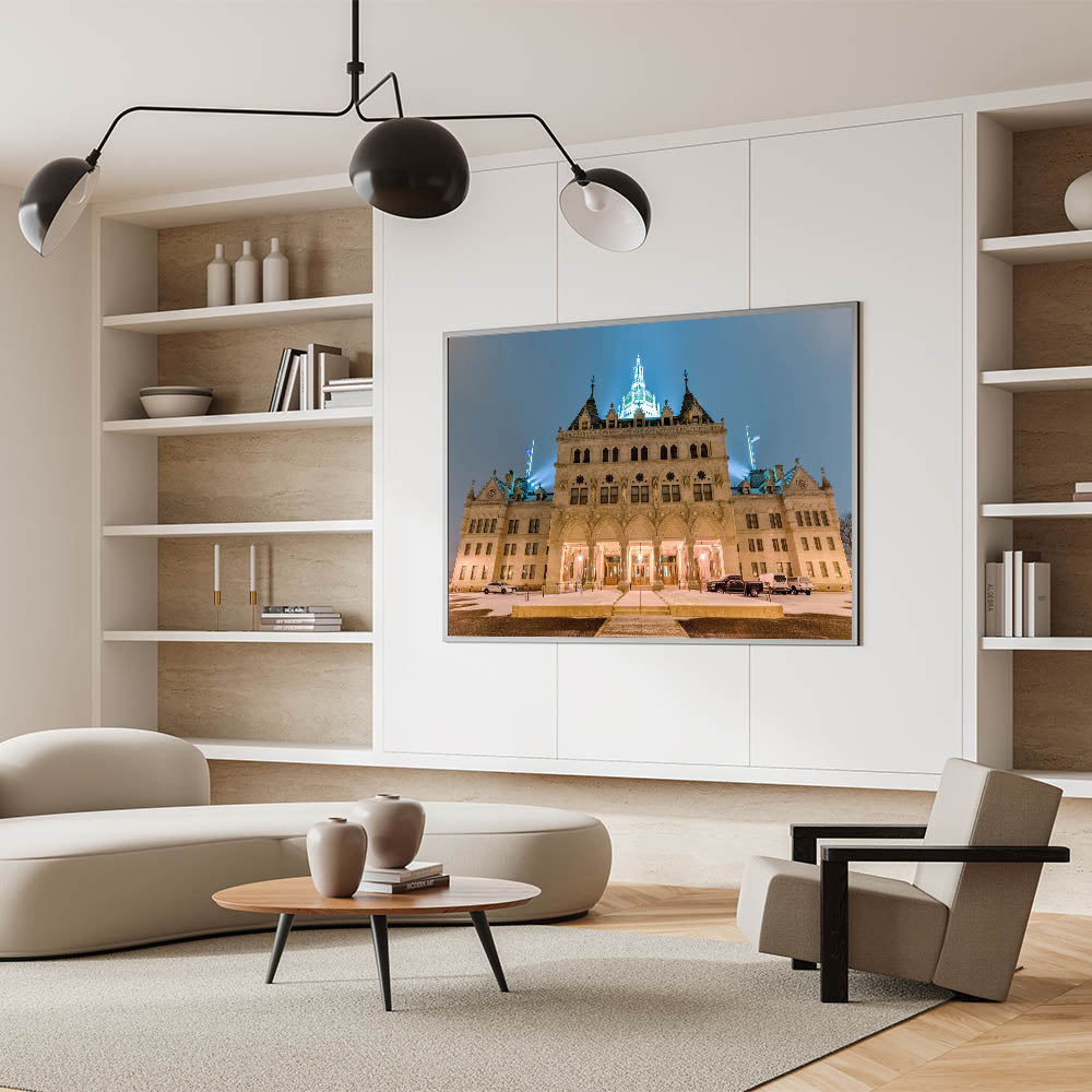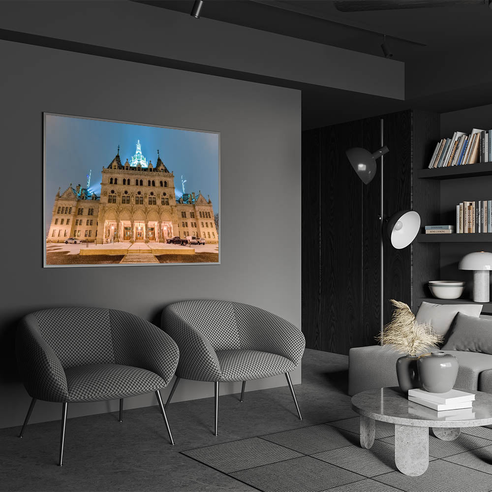 Celebrate the architectural grandeur of Connecticut with this stunning photograph of the state’s historic Capitol Building. This Connecticut art print captures the Capitol’s intricate design and stunning illumination against the evening sky, creating a timeless piece that reflects the rich history and beauty of the state. Ideal for lovers of architecture, history, or those looking to add a touch of elegance to their decor.