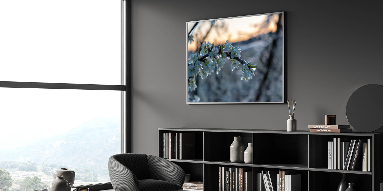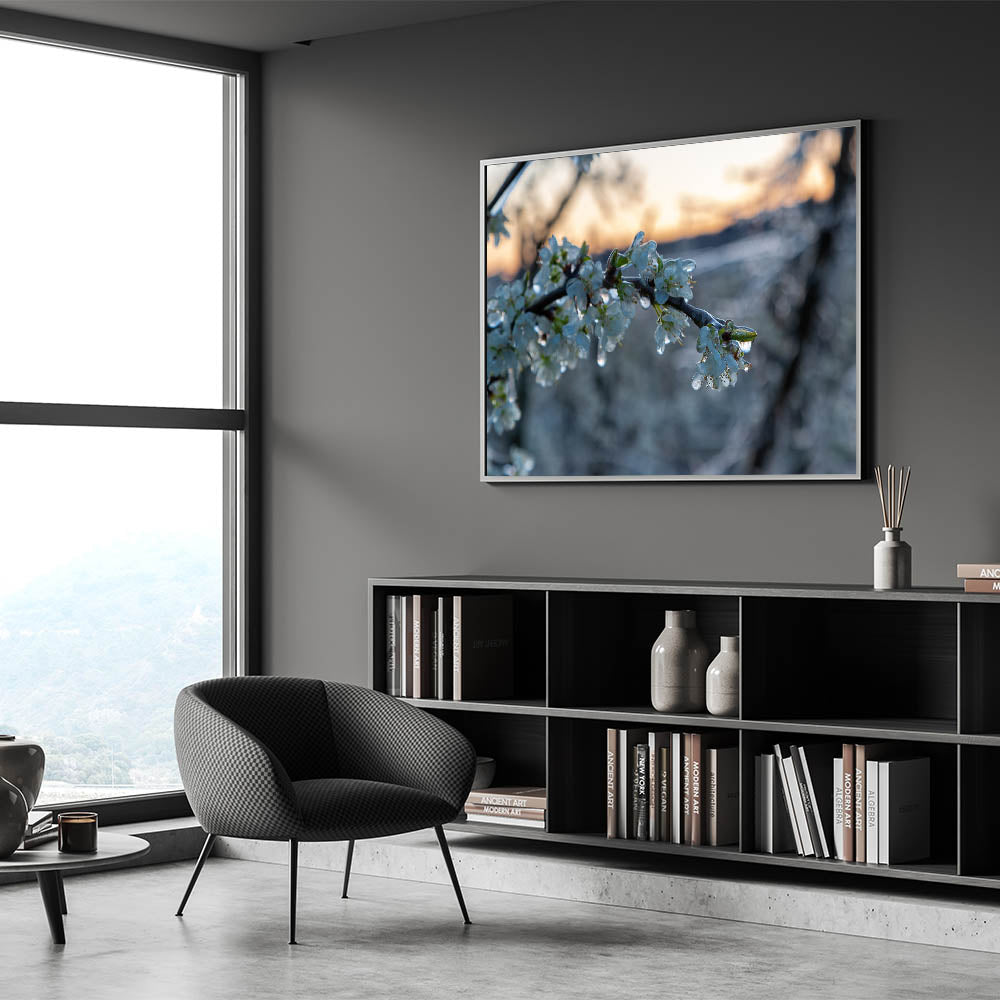 Capture the serene beauty of winter’s touch on nature with this Ice and Frost art piece. The delicate frost settling on early spring blossoms creates a striking contrast between the cold and the warmth of life emerging beneath it. This close-up photography piece brings out the intricate details of frozen droplets clinging to each petal, illustrating nature's fleeting beauty during the coldest months. Ideal for any space, this art piece evokes a sense of calm, elegance, and wonder at nature's ability to thrive even under the harshest conditions.