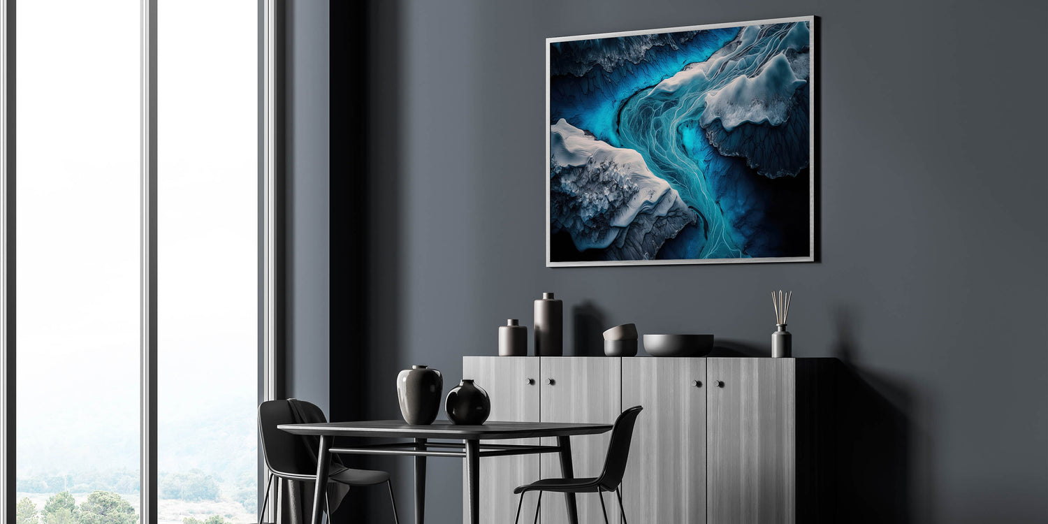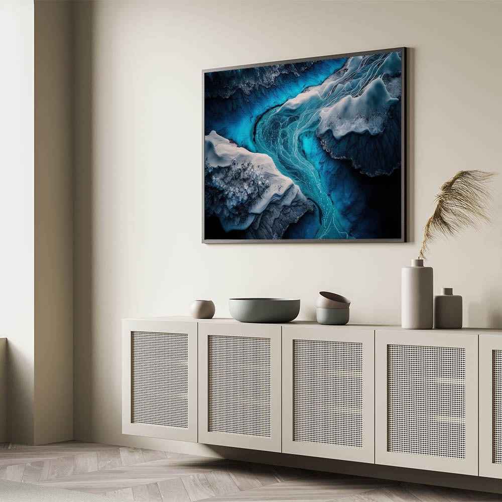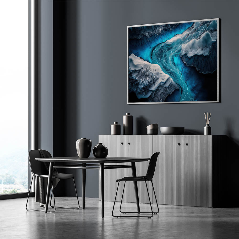 Admire the breathtaking beauty of Iceland's glacial rivers with this stunning aerial photography artwork. Capturing the winding paths of icy blue waters against white, snow-covered terrain, this piece evokes the serenity and power of Icelandic nature. The intricate textures and vivid colors bring the abstract beauty of nature to life, making it a perfect centerpiece for any space that celebrates the raw beauty of the natural world.
