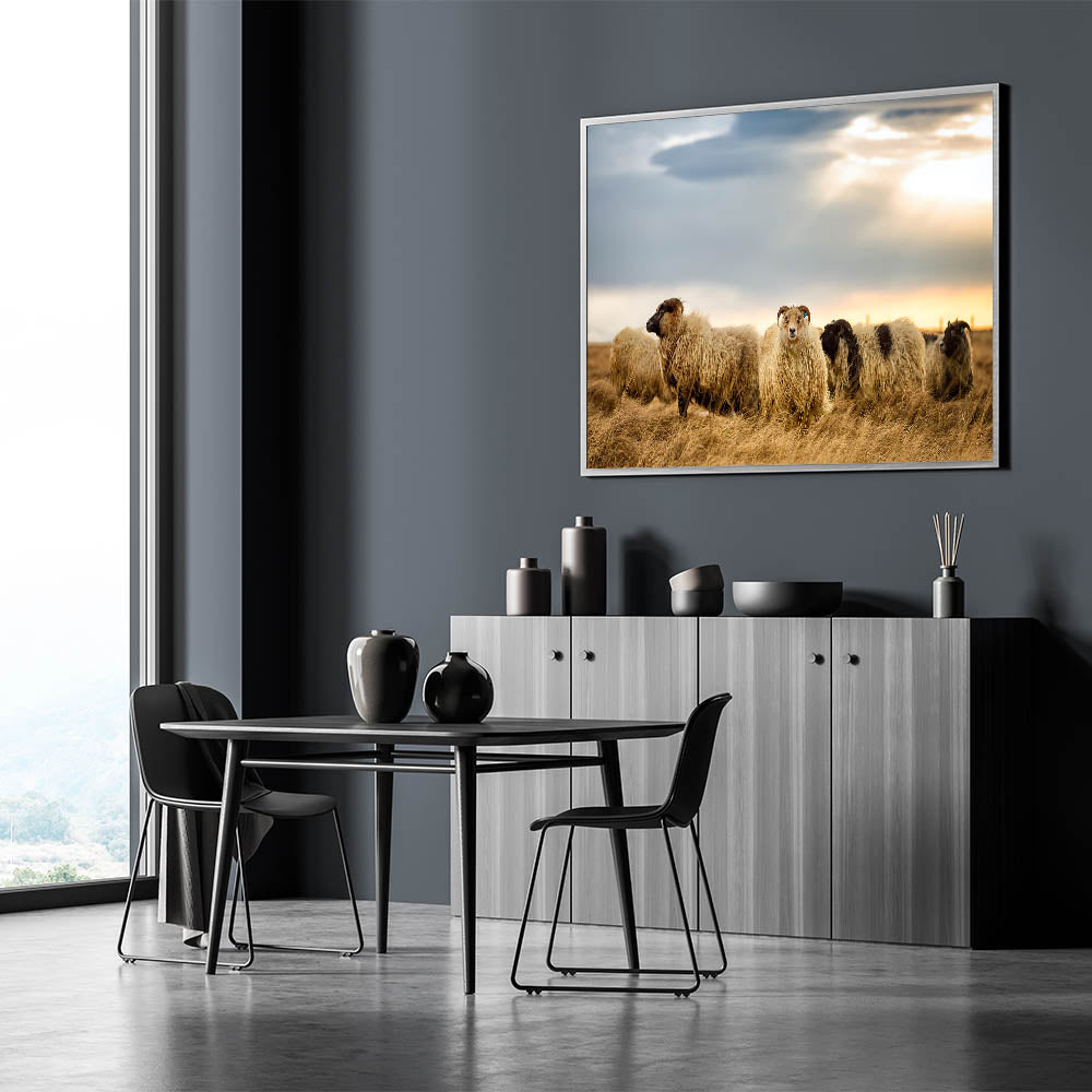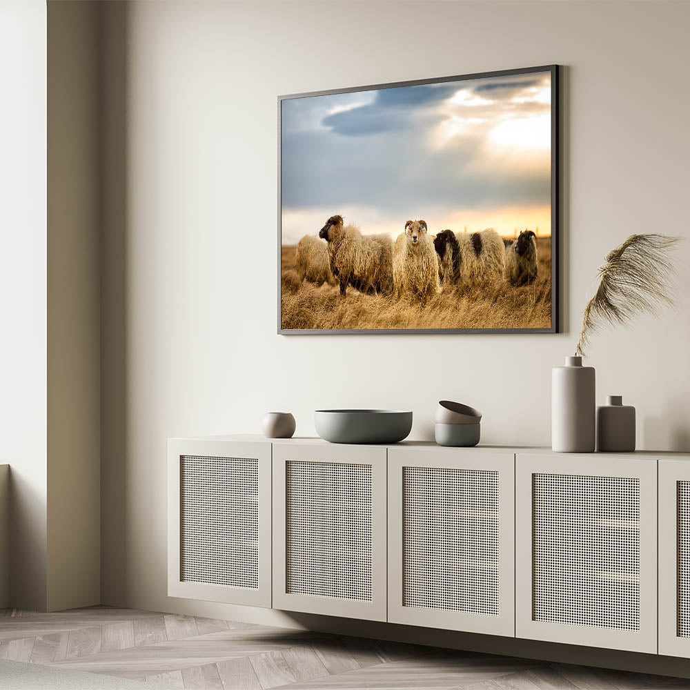 Capture the charm of Iceland’s countryside with this captivating Iceland Photography print featuring Icelandic sheep in their natural landscape. This artwork beautifully showcases the rugged and serene beauty of Iceland, with the woolly sheep grazing peacefully under a soft, cloudy sky. It’s the perfect piece for anyone who loves rustic and nature-inspired art.