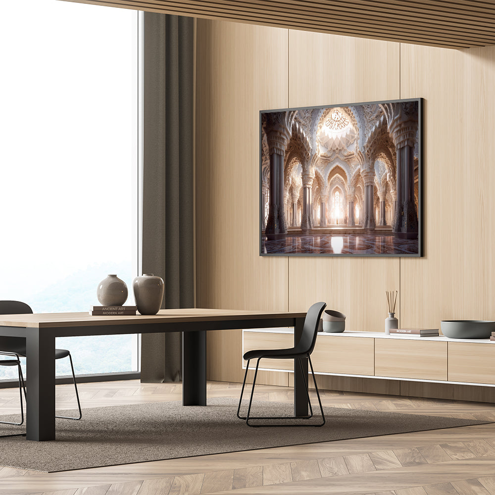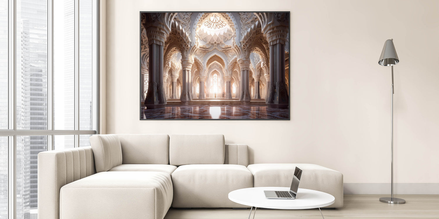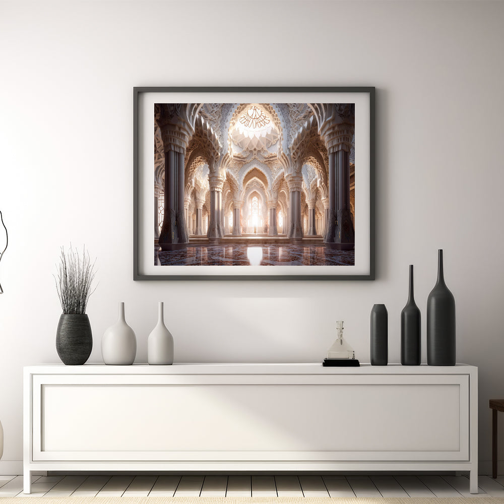 Elevate your space with this stunning depiction of a palace interior, where light and architecture combine to create a serene and majestic ambiance.