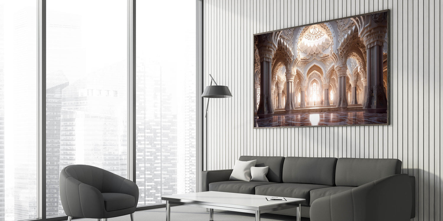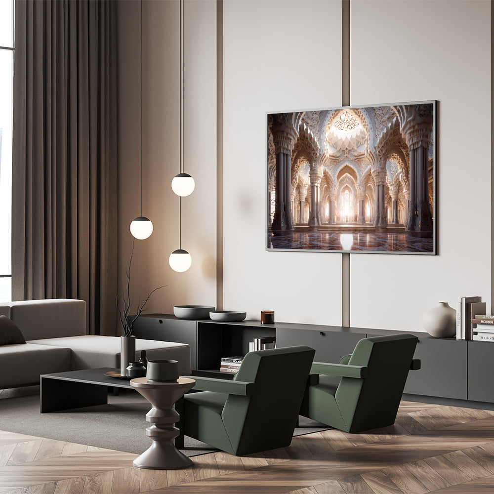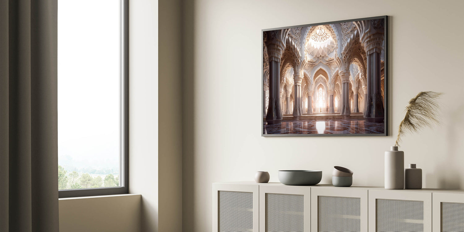 Elevate your space with this stunning depiction of a palace interior, where light and architecture combine to create a serene and majestic ambiance.