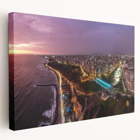 Immerse yourself in the vibrant energy of Peru's capital with our "Lima Skyline at Dusk - Panoramic Peru Cityscape Art." This breathtaking canvas captures the sprawling urban landscape of Lima as the day gives way to night, with lights twinkling against the sunset backdrop, offering a dynamic blend of natural and urban beauty.