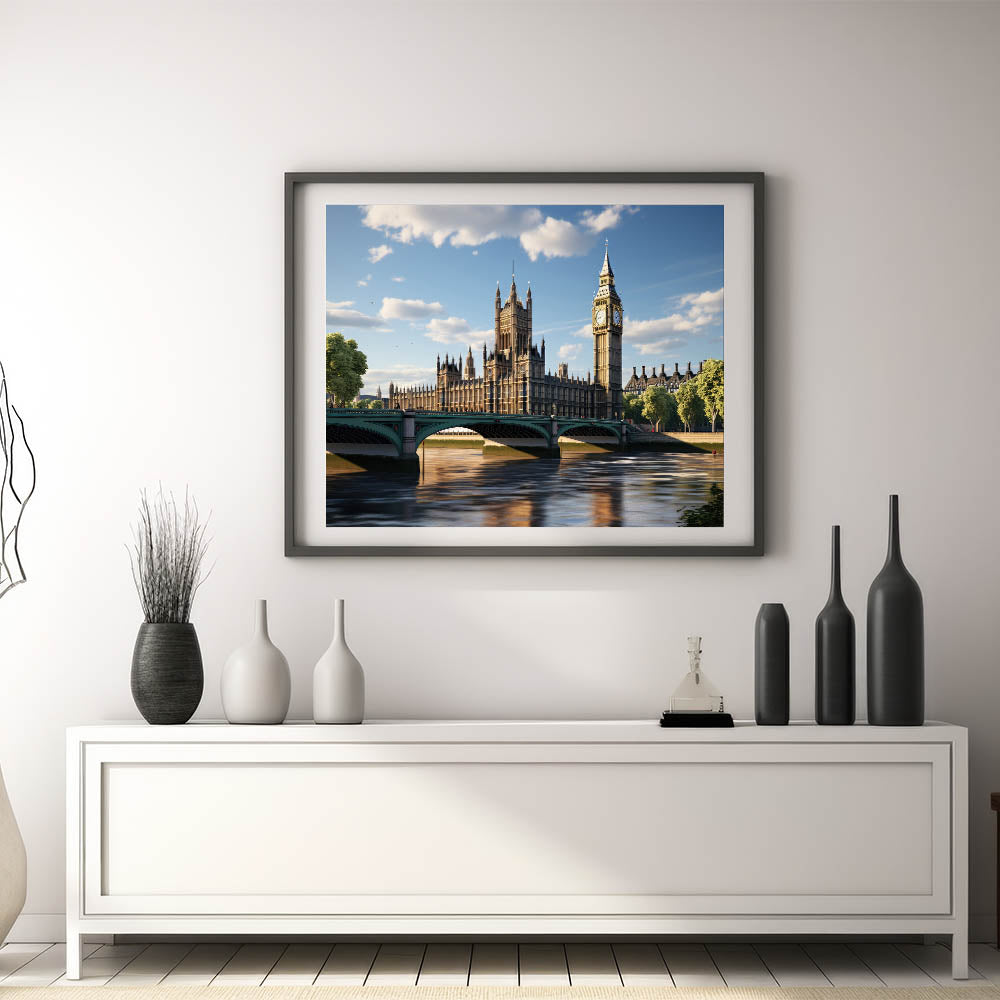 Embrace the grandeur of London with our "Parliament and Big Ben" photography art, capturing a serene view of these iconic landmarks under a clear sky. This timeless piece reflects the architectural elegance and historical significance of London, offering a majestic addition to any collection.