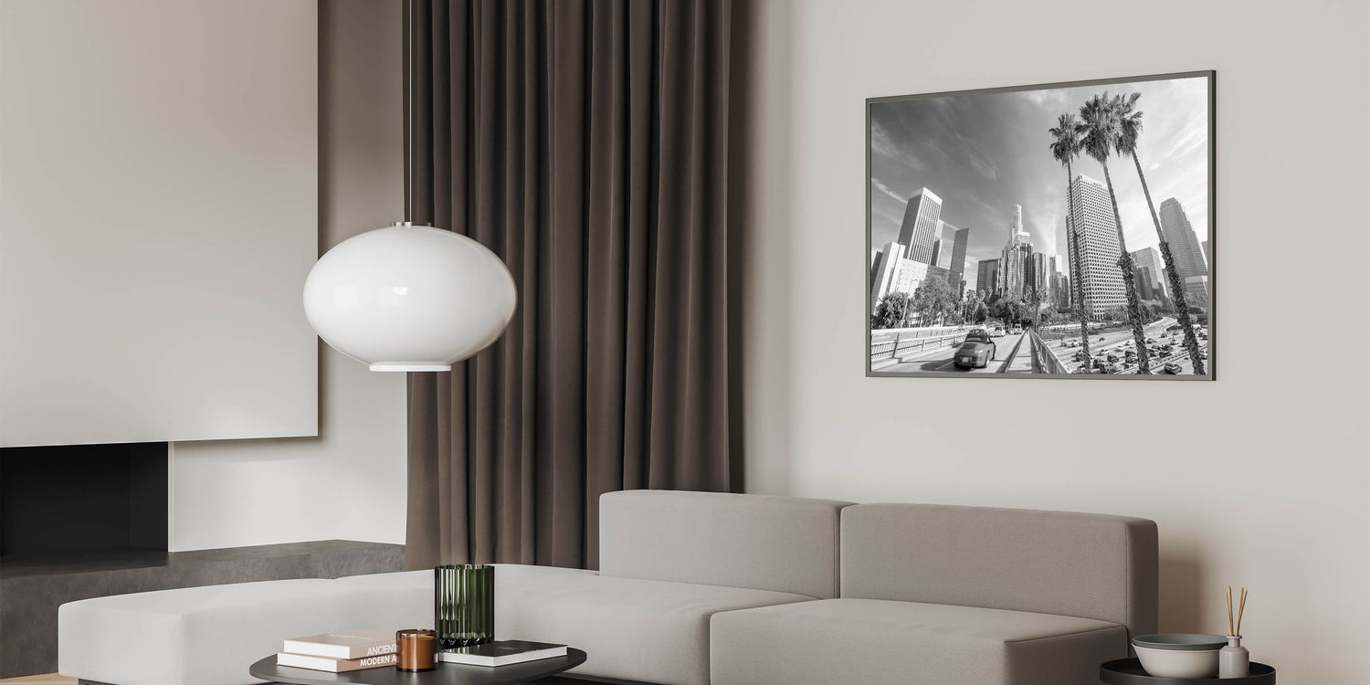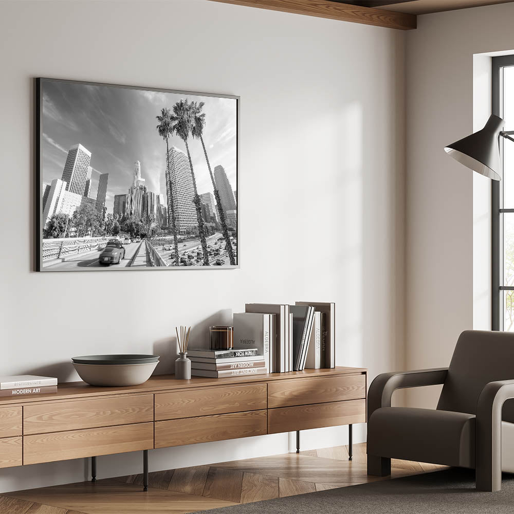 - Elegant black-and-white Los Angeles cityscape art prints in various sizes