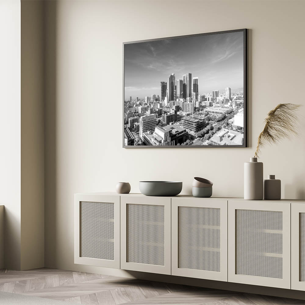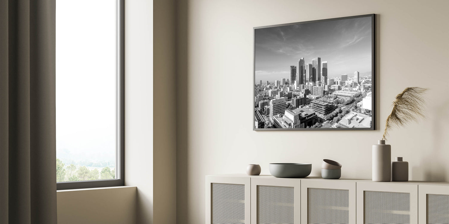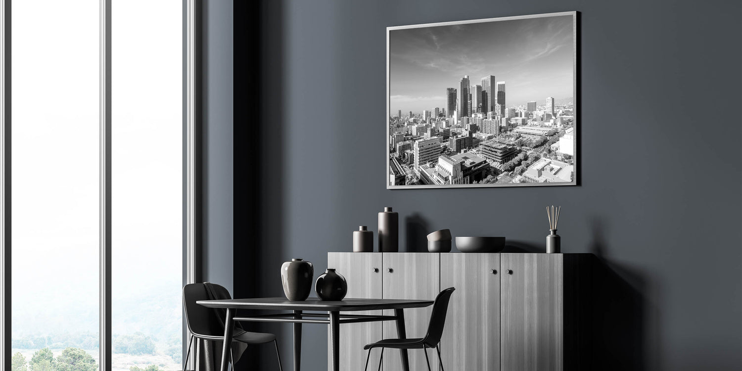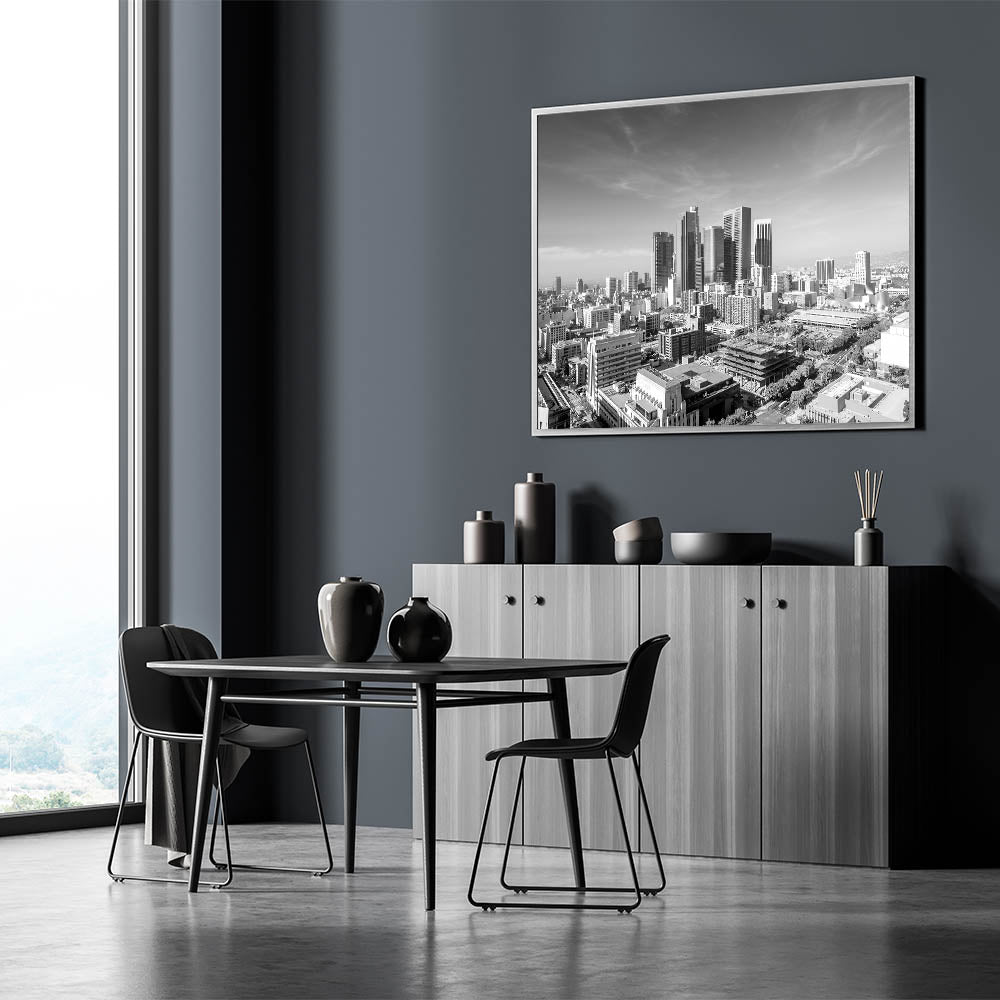 Capture the grandeur of Los Angeles with this striking black-and-white downtown skyline wall art. This piece beautifully highlights the architectural elegance of the city's skyscrapers, standing tall against a clear sky, creating a timeless and sophisticated look. Perfect for those who appreciate urban landscapes in a classic monochrome palette, this artwork will add a touch of modern elegance to any room. Available in a variety of formats, including stretched canvas, framed canvas, acrylic glass, and framed prints, this high-quality Los Angeles cityscape art print is versatile enough to complement any decor style.