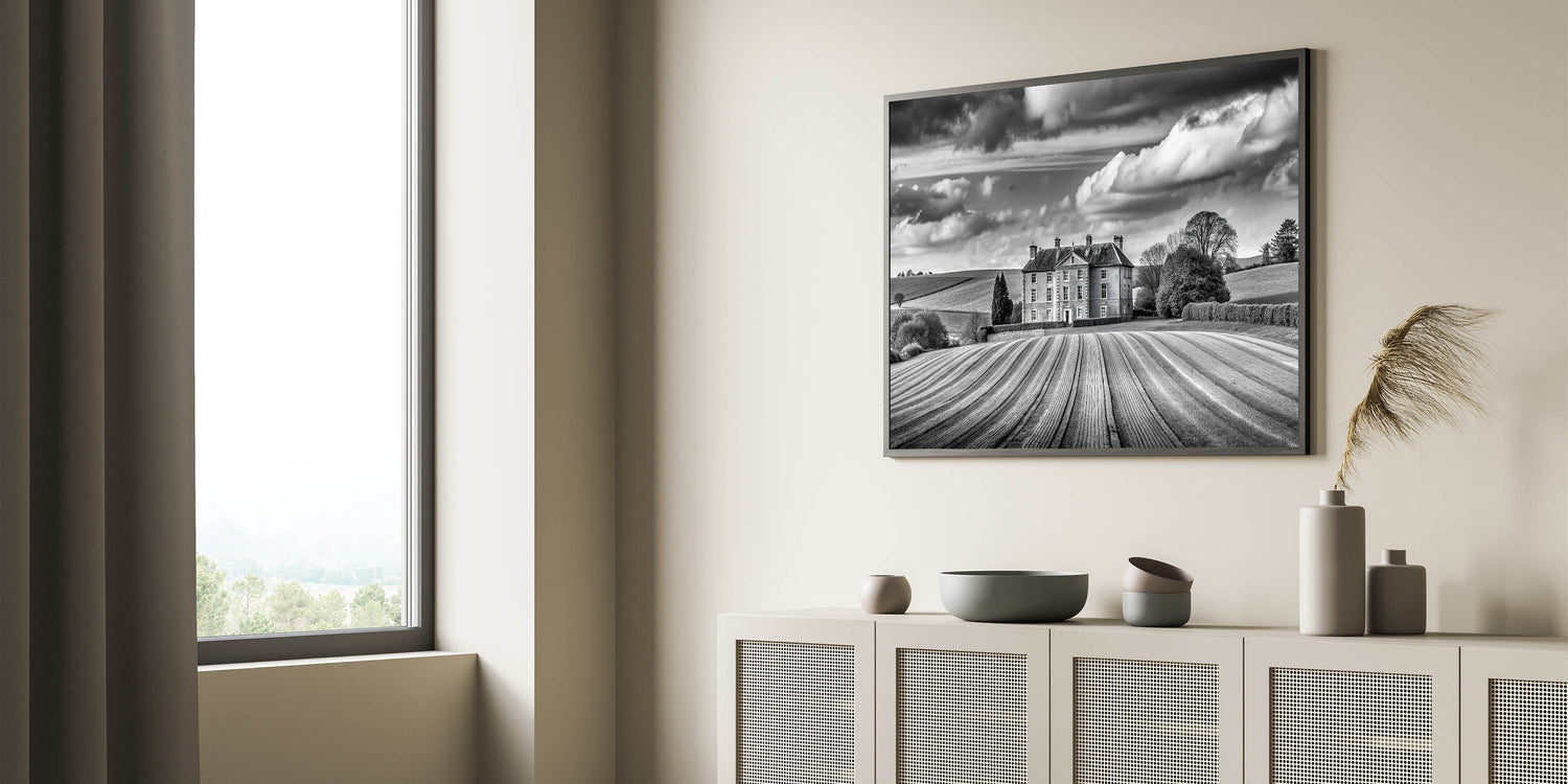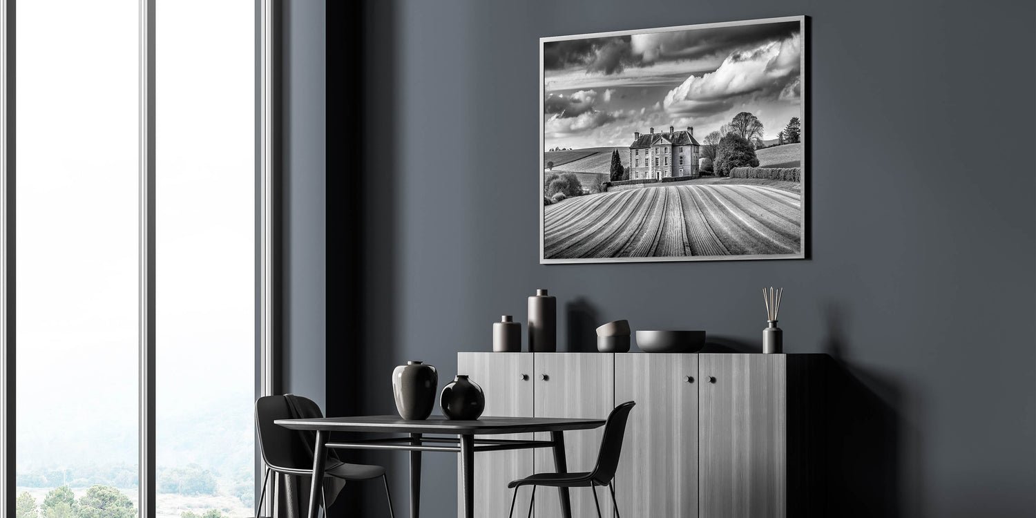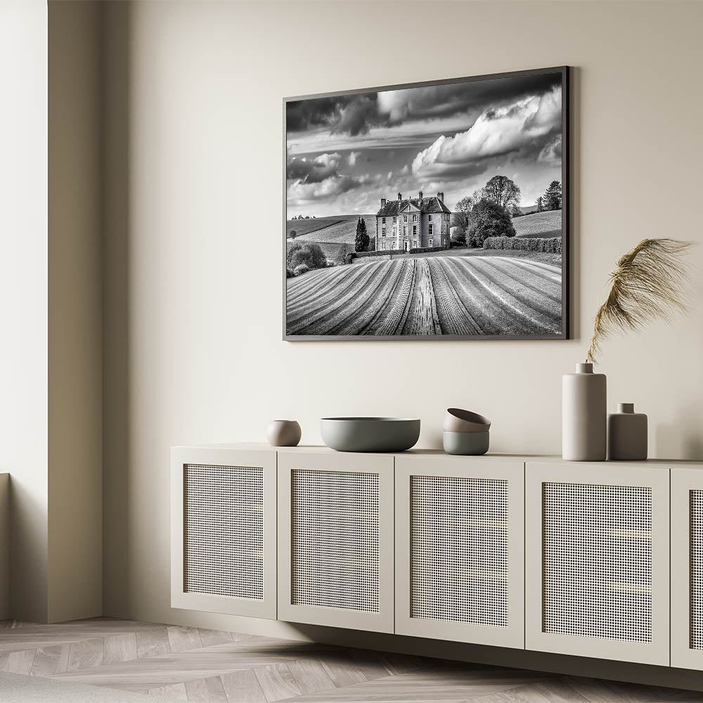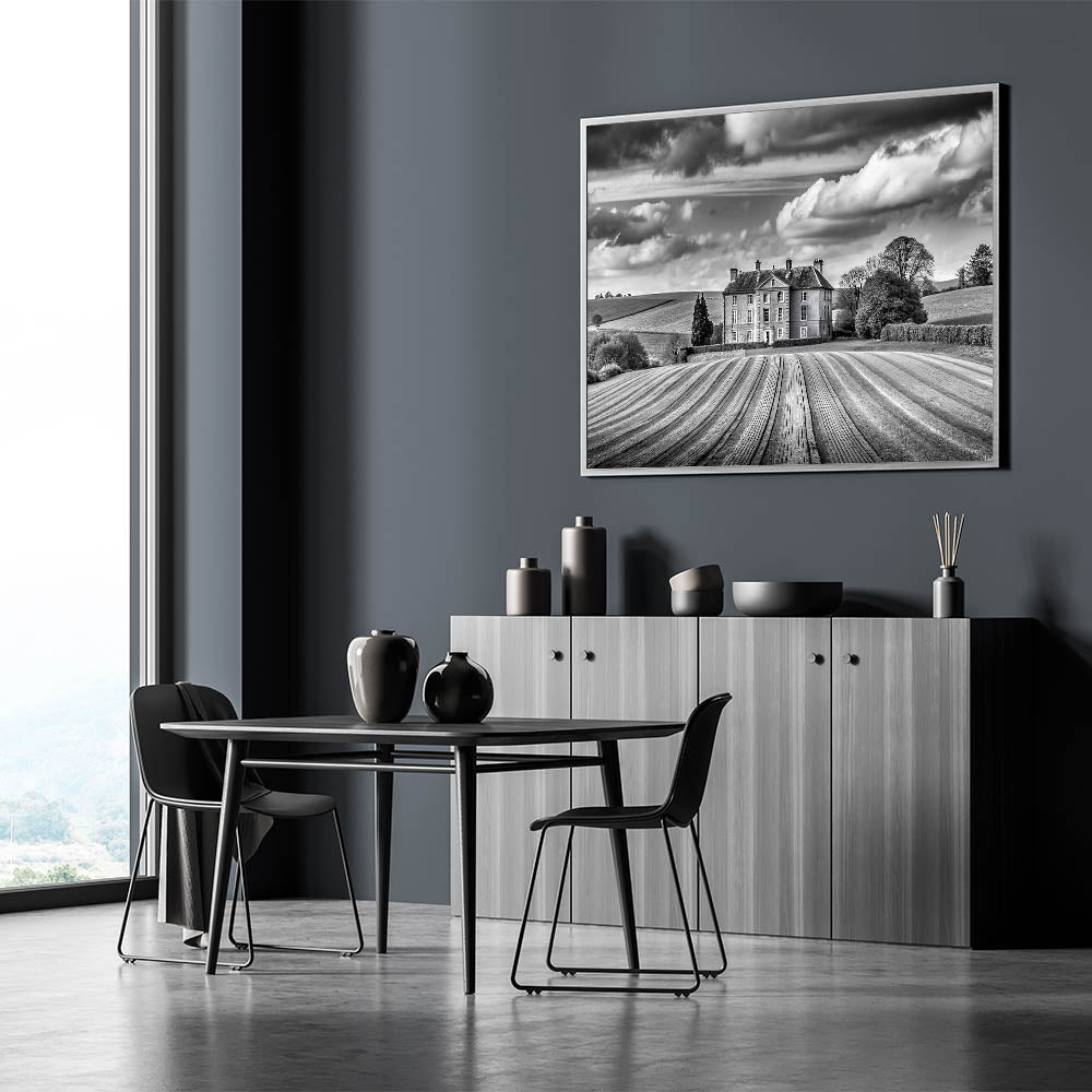 Enhance your home with this stunning Majestic Manor House Art, featuring a grand estate surrounded by meticulously cultivated rolling fields. The black and white palette adds a timeless elegance to the composition, highlighting the rich textures and contrasts between the sweeping fields, the stately architecture, and the dramatic clouds above. This artwork perfectly captures the essence of classic countryside charm and sophistication, making it a distinguished addition to any space.