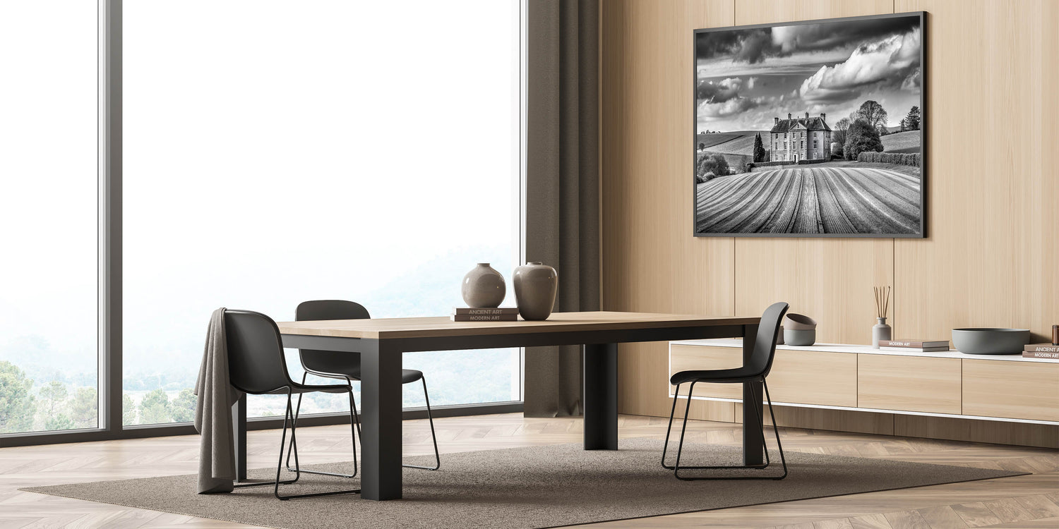 This countryside landscape art print is ideal for those who appreciate the elegance of traditional rural architecture and the beauty of monochrome photography. Whether displayed in a living room, study, or office, this piece will add a sense of grandeur and tranquility to your interior decor.