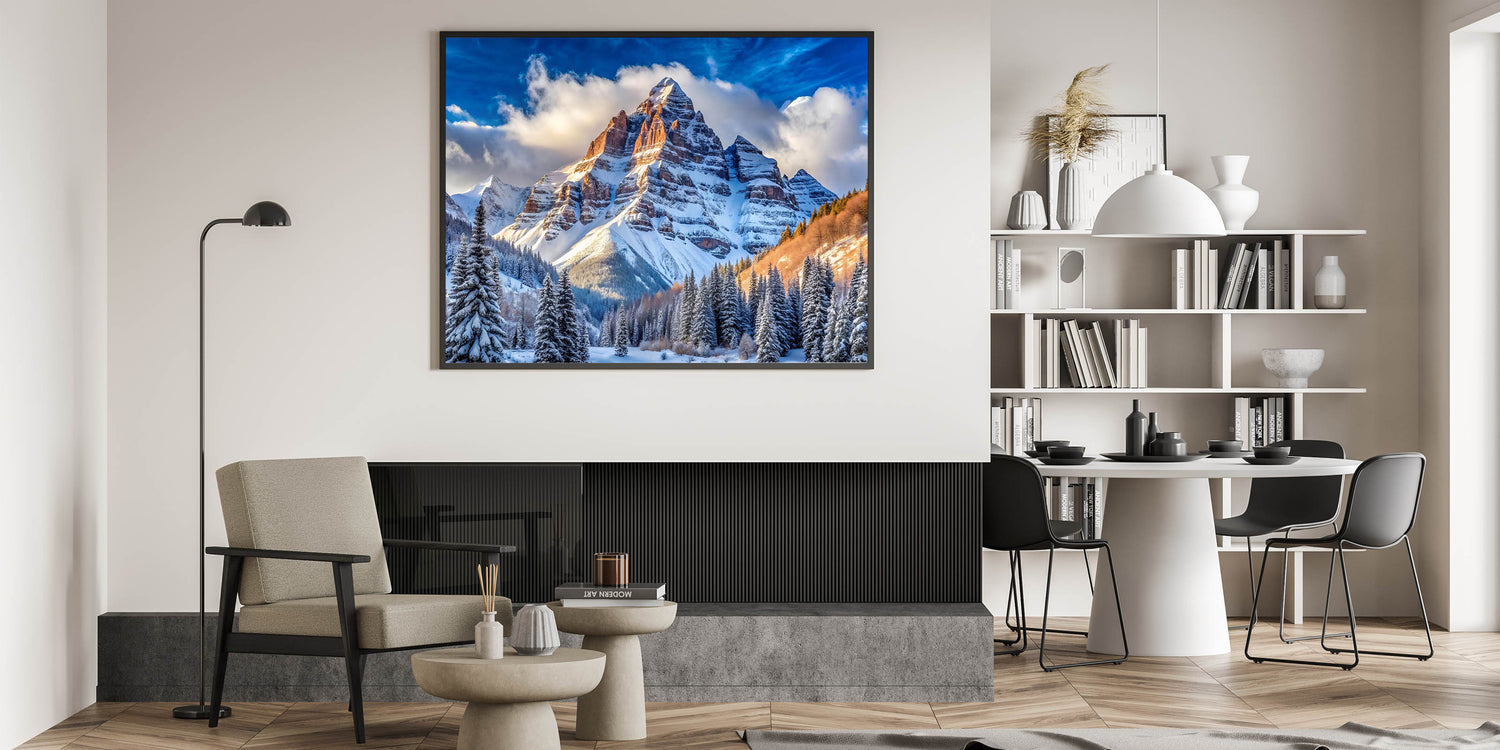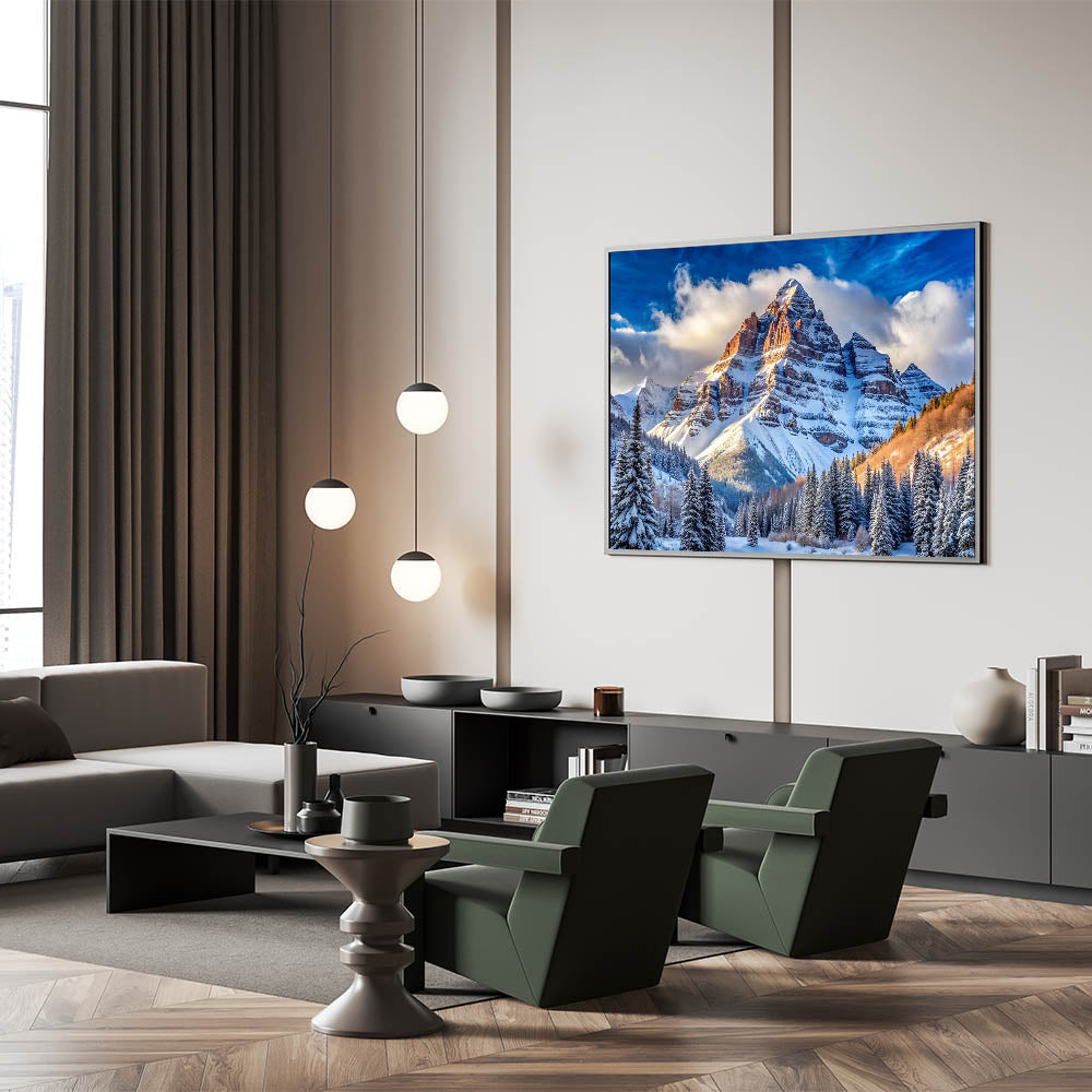 Capture the striking beauty of Colorado’s Maroon Bells in winter with this breathtaking wall art. The iconic snow-covered peaks stand tall under a brilliant blue sky, surrounded by frost-covered evergreens. This artwork perfectly captures the serene and awe-inspiring beauty of nature, making it an ideal piece to enhance any living room, office, or bedroom decor.