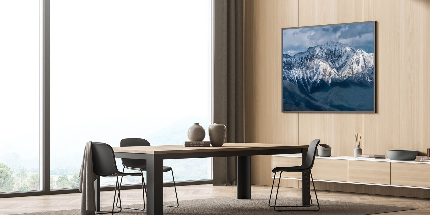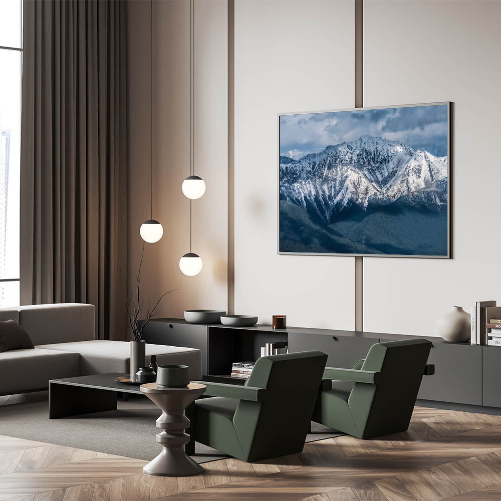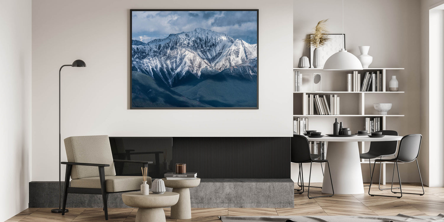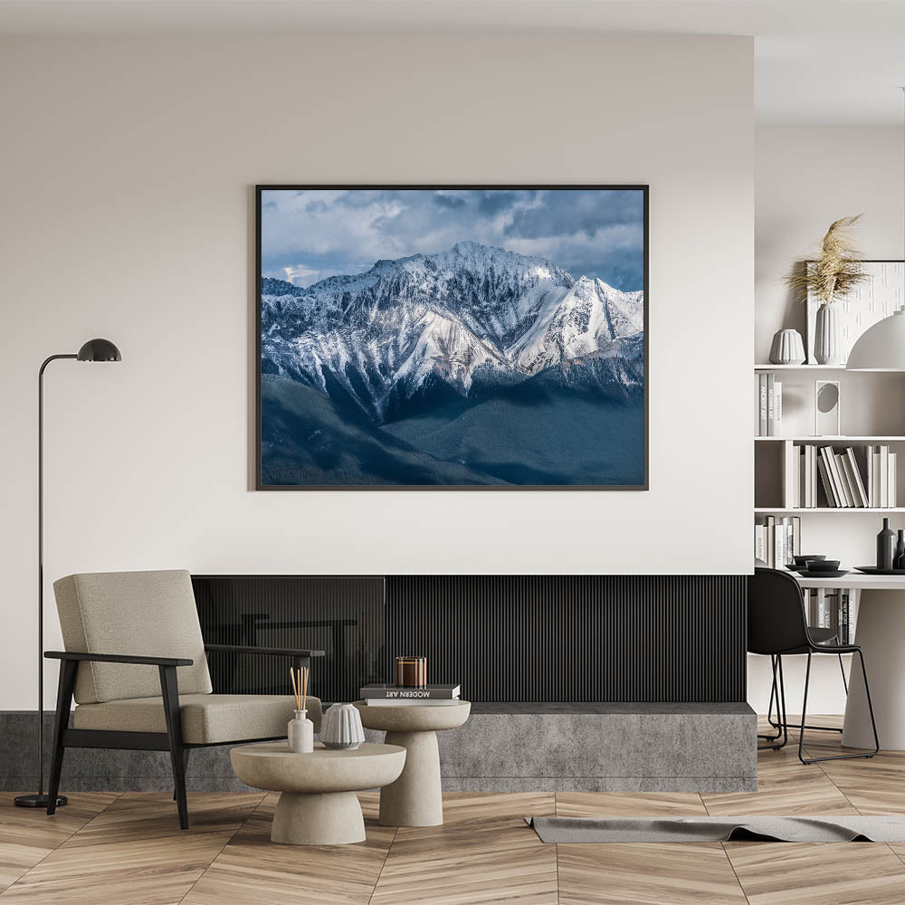 Embrace the grandeur of British Columbia’s rugged wilderness with this stunning wall art, featuring towering, snow-covered mountains against a moody sky. The sharp ridges of the mountains contrast beautifully with the dense forests below, creating a powerful image that evokes the untouched beauty of the Canadian Rockies. This artwork is perfect for anyone looking to bring the magnificence of nature into their space, offering a serene yet dramatic focal point for any room.