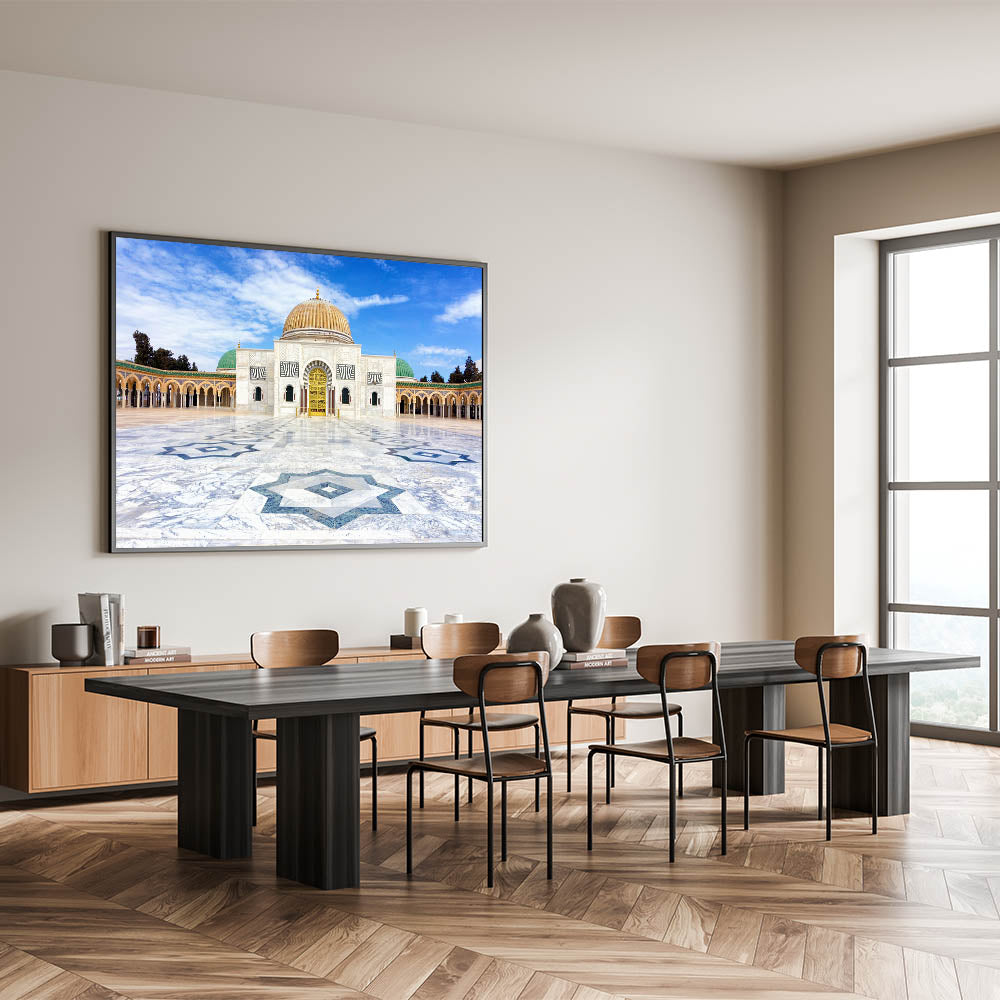 Elevate your space with the elegance and beauty of Tunisian Islamic architecture. This stunning wall art showcases the magnificent courtyard of a mosque, with its intricate patterns, domes, and stunning marble floors. The golden doors and green domes stand out against the bright blue sky, offering a glimpse into the rich cultural heritage and craftsmanship of Tunisia. Perfect for those who appreciate historical and architectural beauty, this artwork brings a sense of serenity and grandeur to any room.