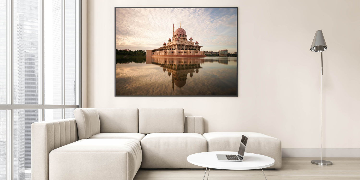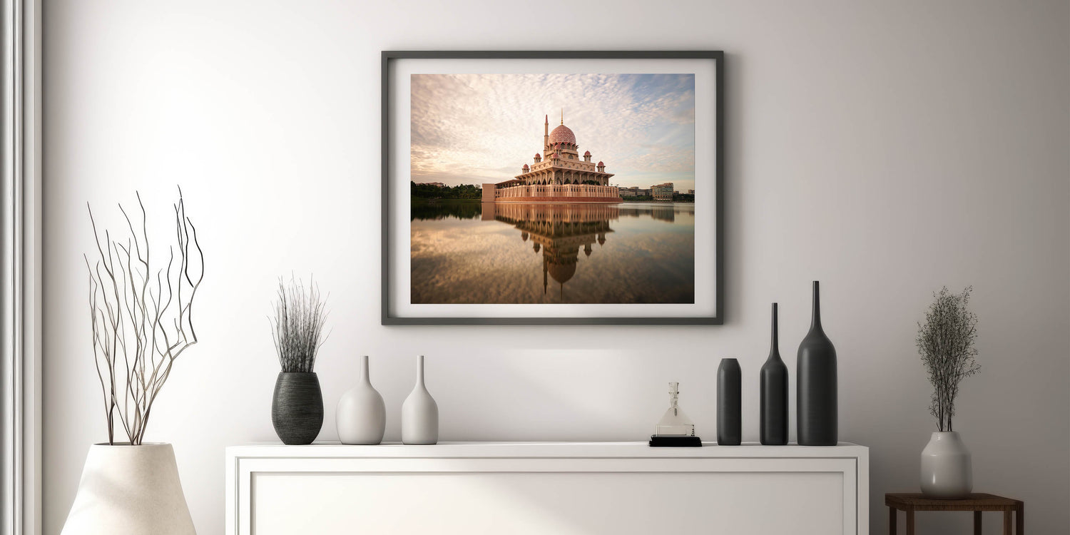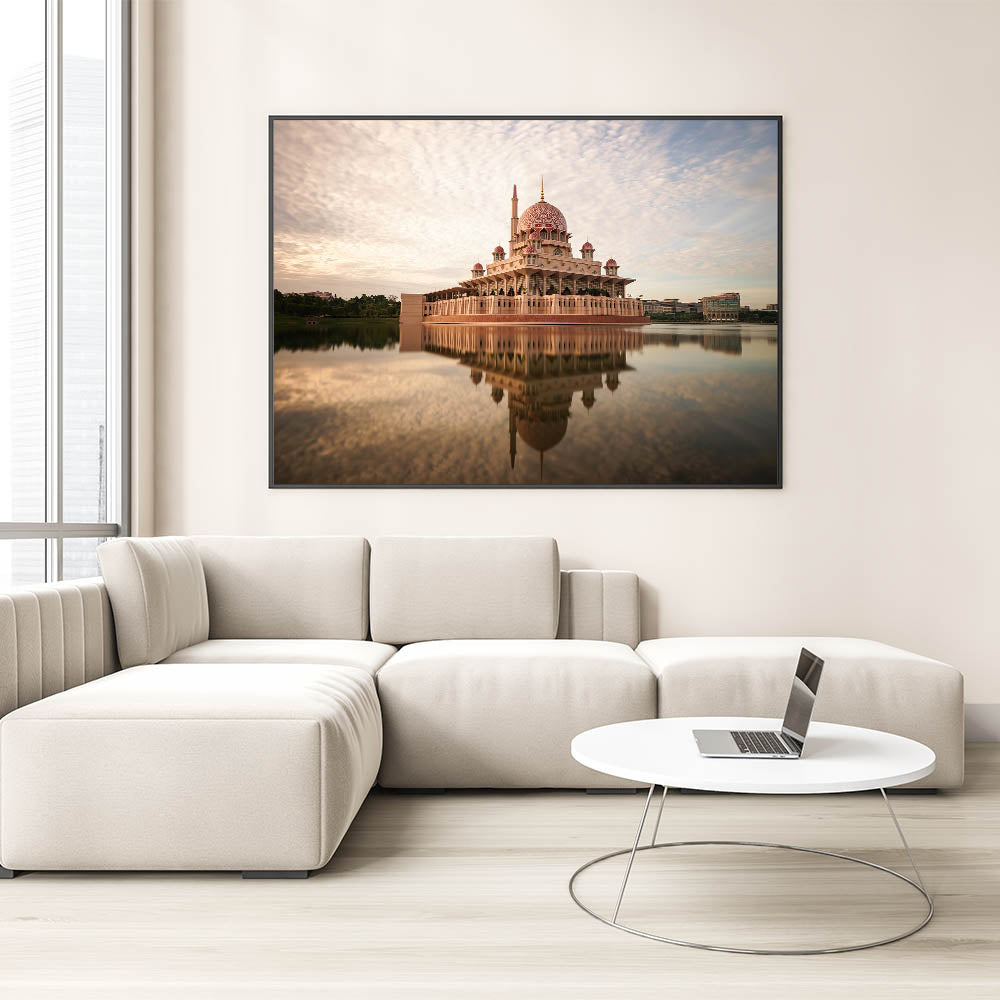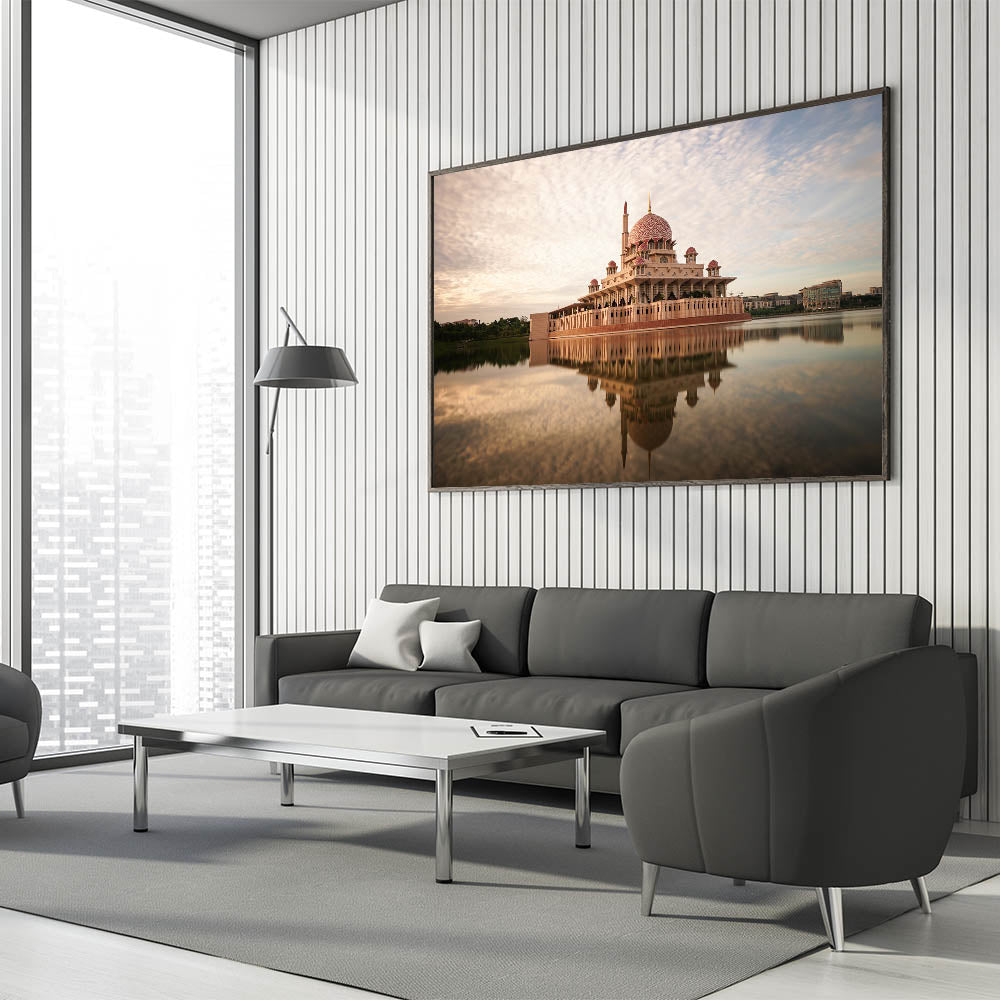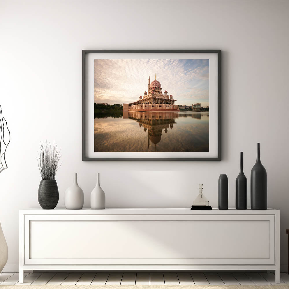 Admire the architectural elegance of Malaysia’s iconic Putra Mosque with this stunning Malaysia Landscape Print. The beautiful pink dome and grand structure are reflected in the still waters, creating a calming and majestic visual that radiates serenity. With soft, neutral tones in the sky and water, this artwork provides a soothing and sophisticated addition to any living space or office.
