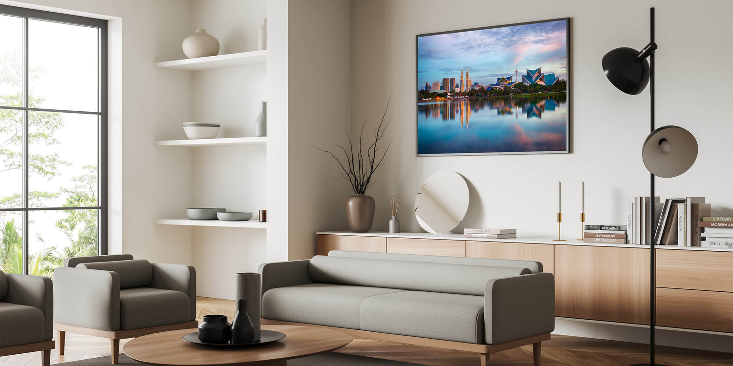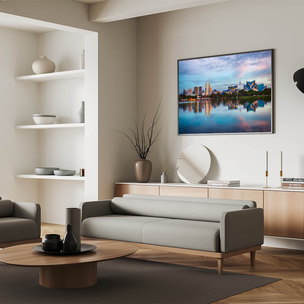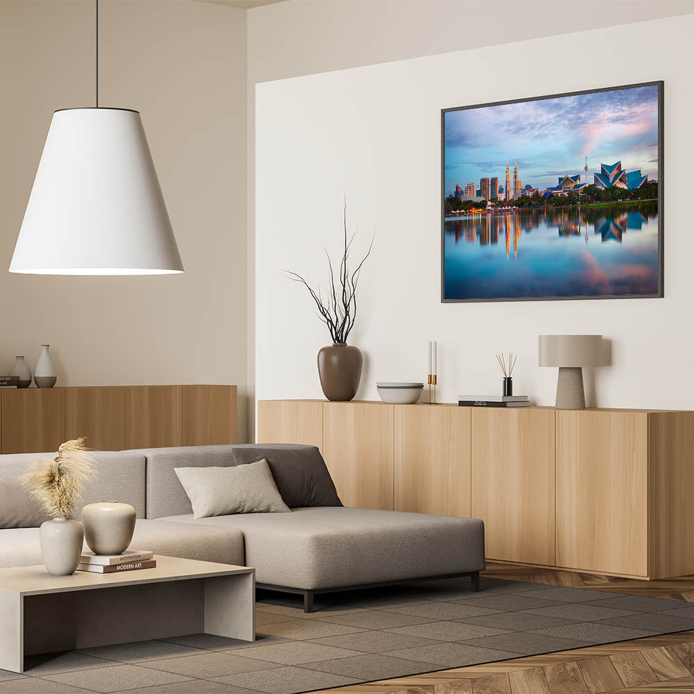 This Malaysia landscape print is perfect for adding a sense of serenity to your living room, office, or bedroom. The tranquil waters and stunning skyline offer a modern yet calming atmosphere, making it an excellent gift or personal addition to your home.