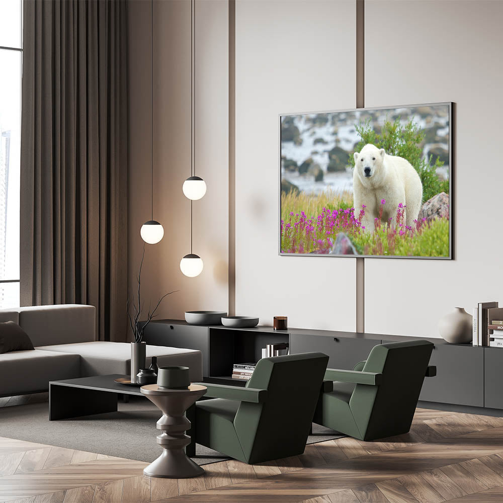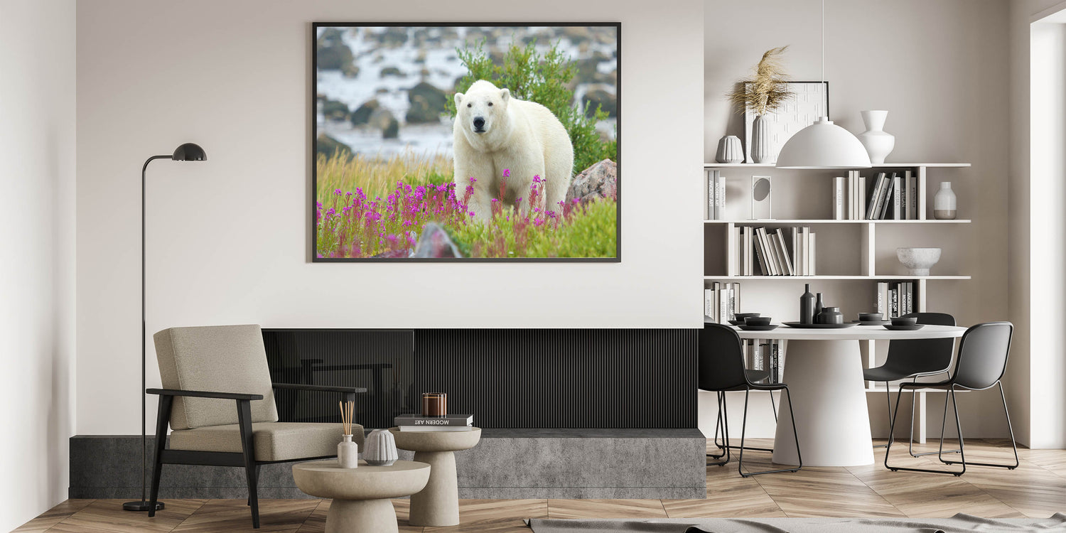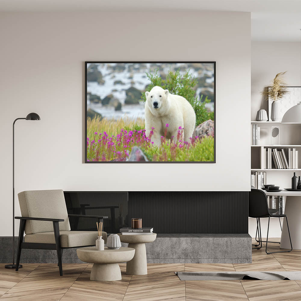 - Showcases a polar bear in its natural habitat, surrounded by native flowers and rocky terrain