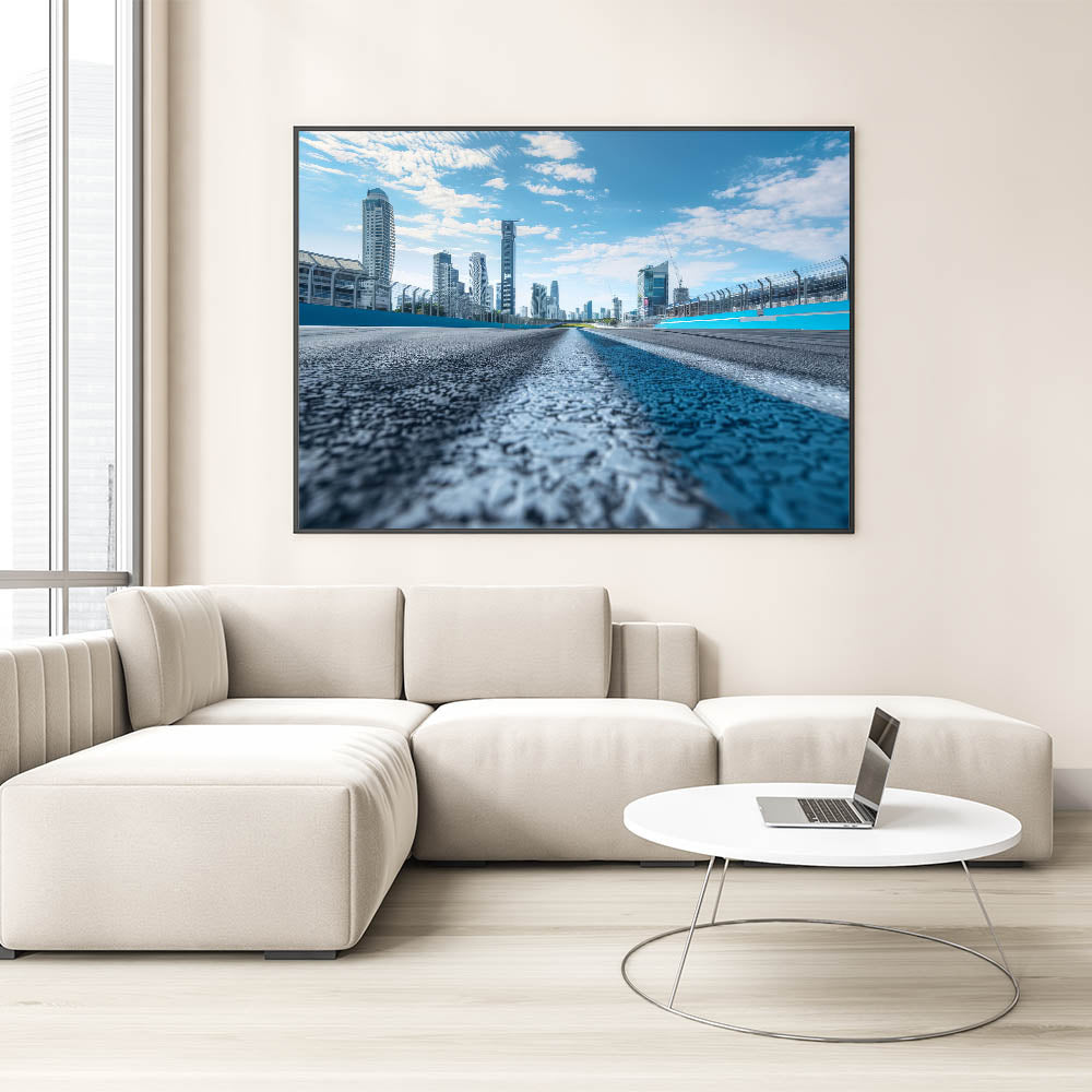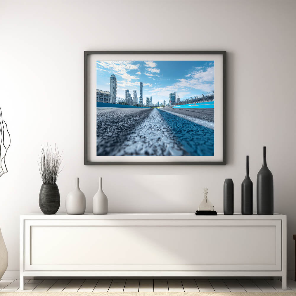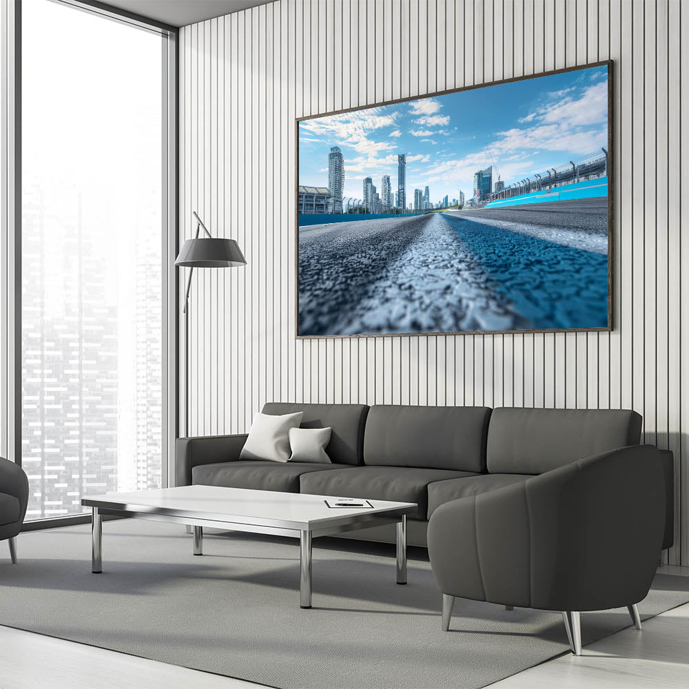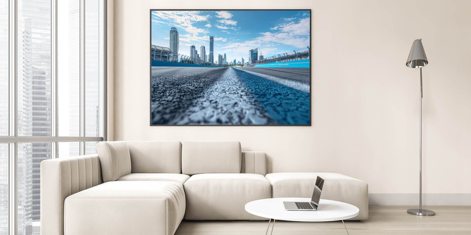 • Dynamic Design: Captures the blend of urban architecture and the adrenaline of a race track.