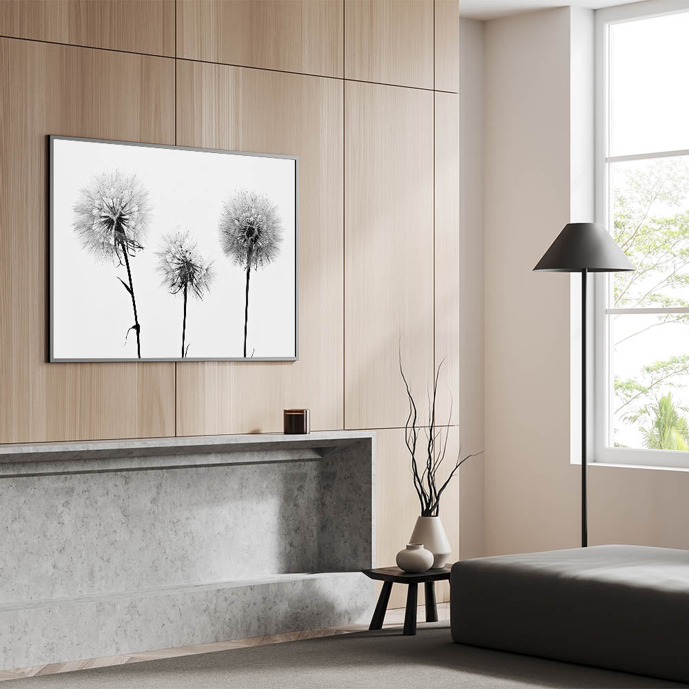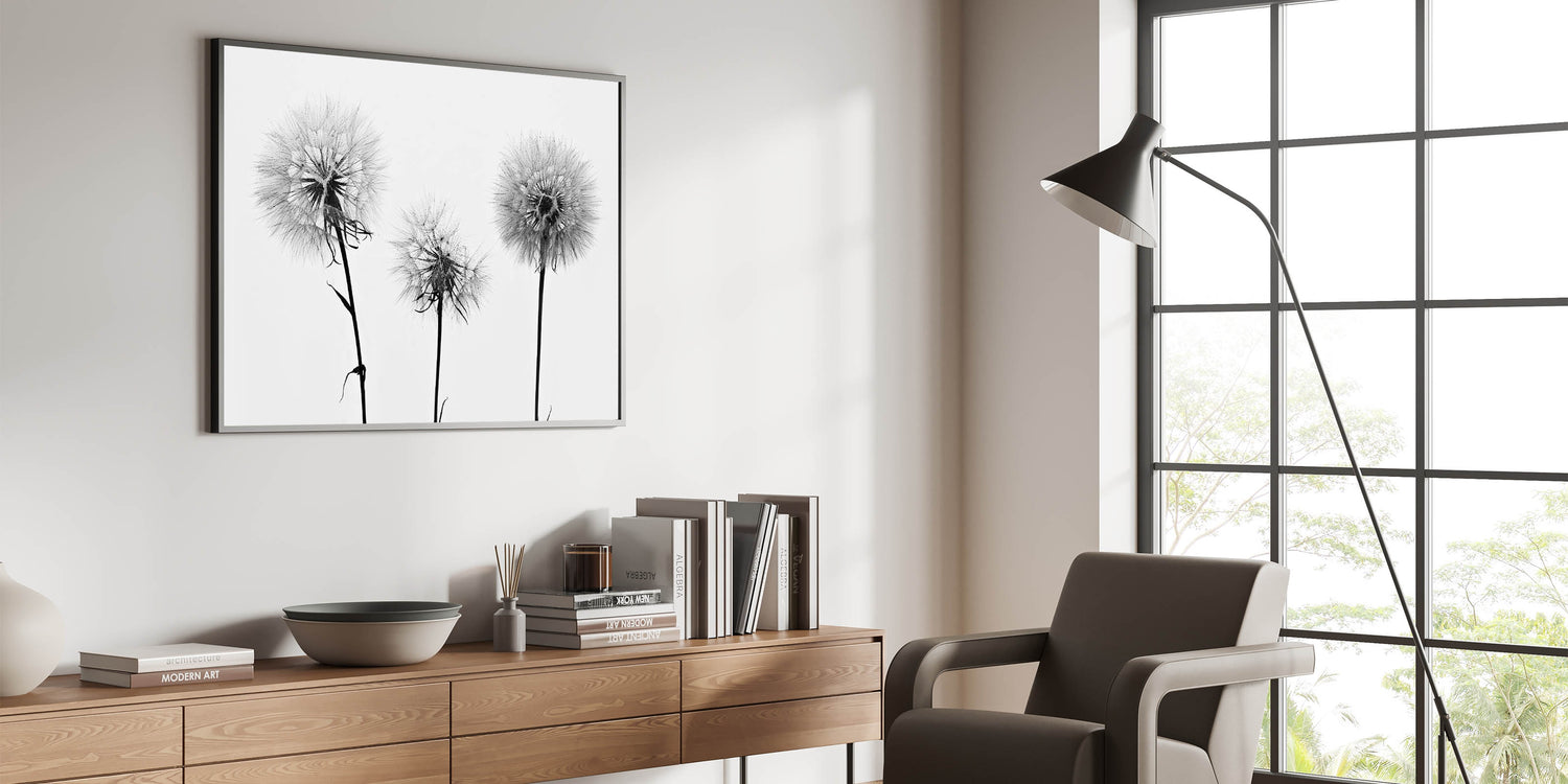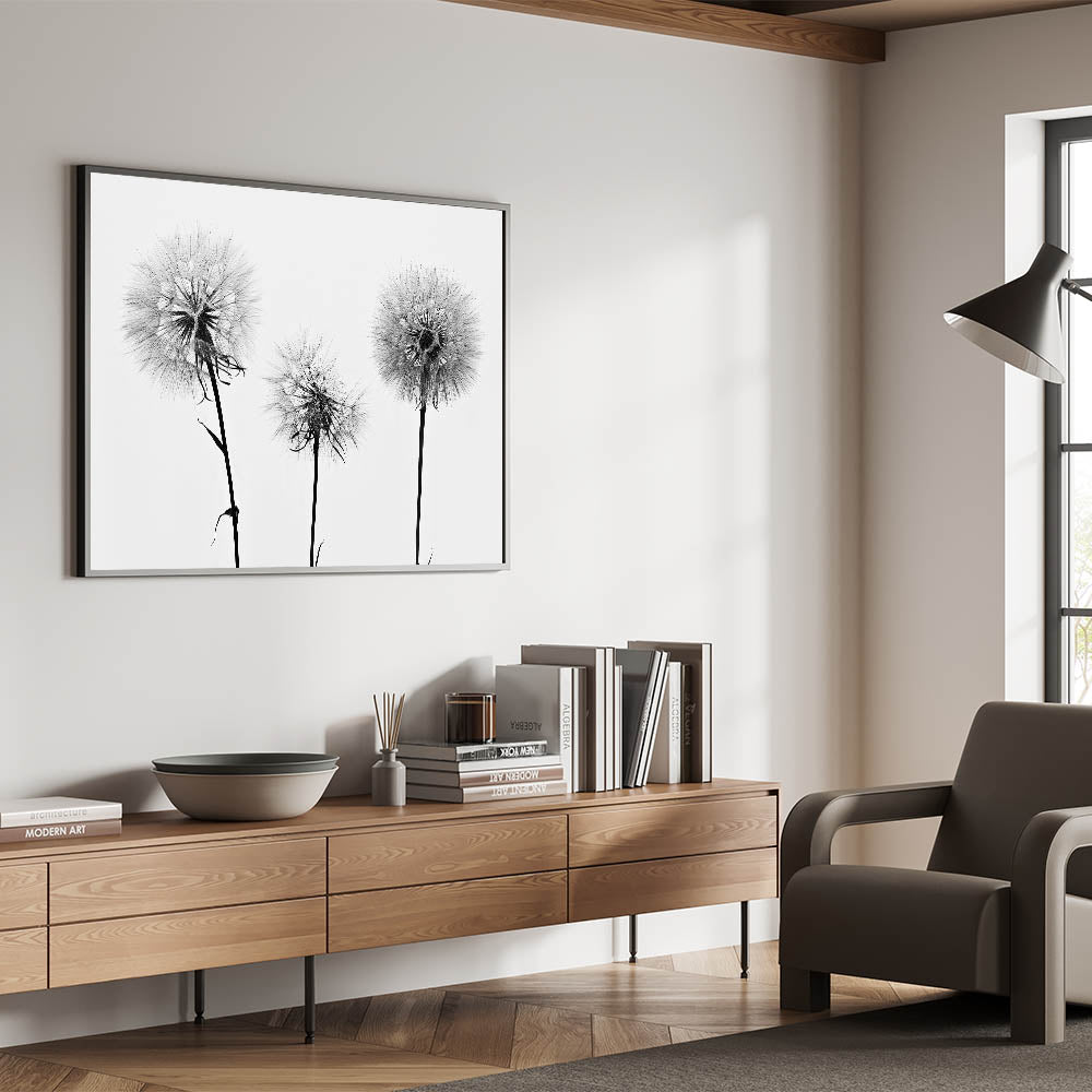 Introduce a touch of elegance and simplicity to your home with this Minimalist Black and White Dandelion Art. Featuring three stunning dandelion heads in a clean, high-contrast design, this piece evokes both serenity and sophistication. The delicate structure of the dandelion seeds is captured in intricate detail, making it an ideal addition to modern interiors or as part of a Nature-Inspired Wall Art collection.