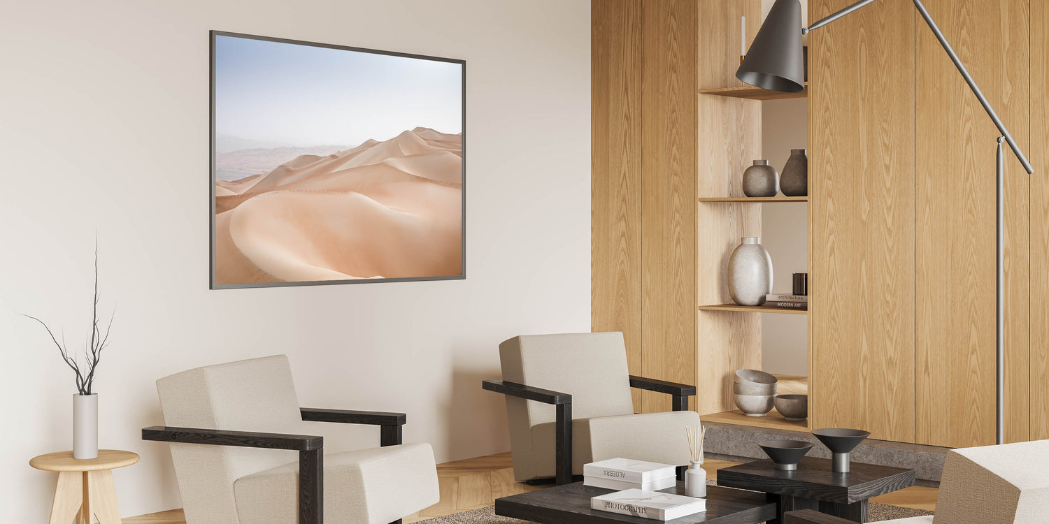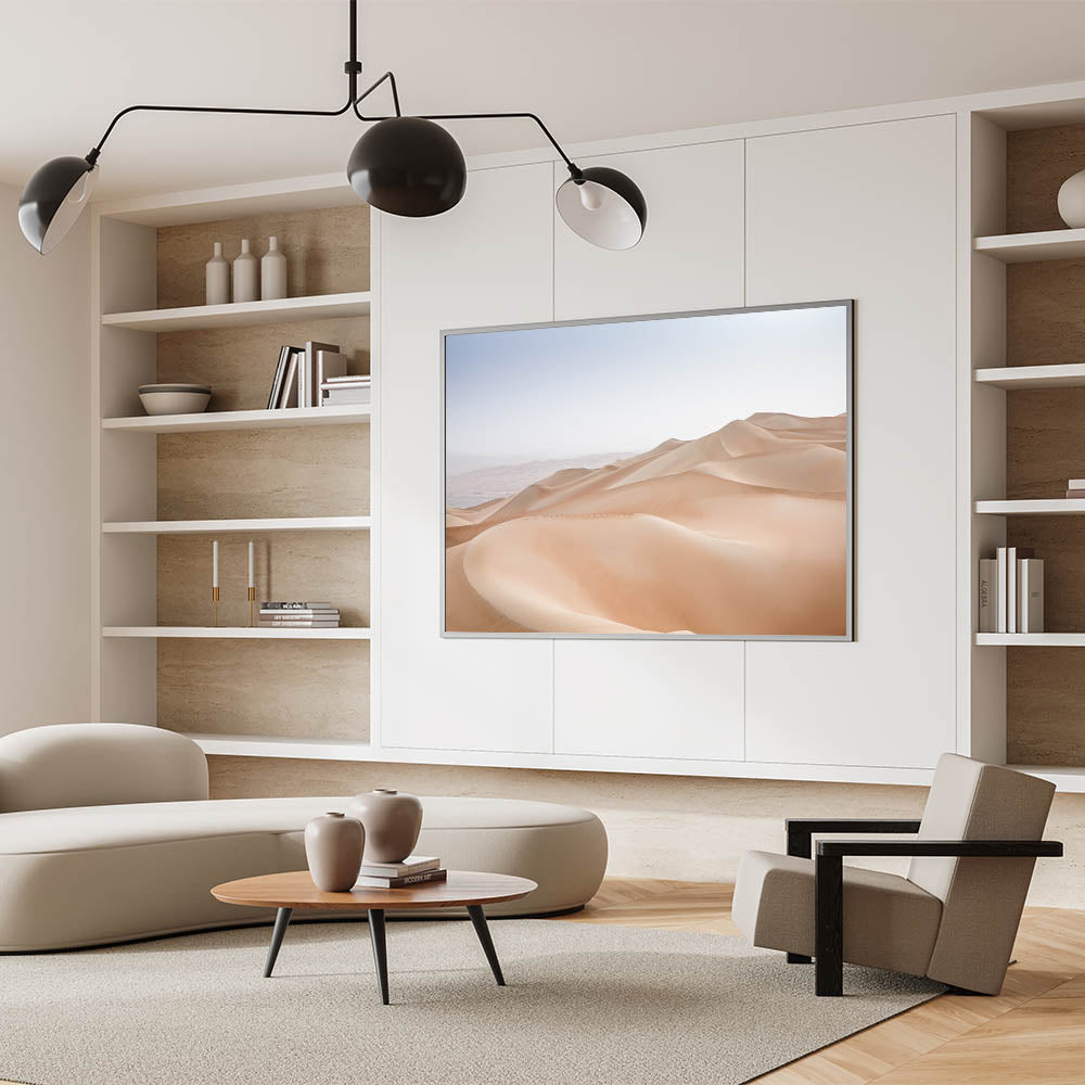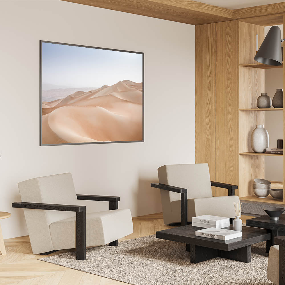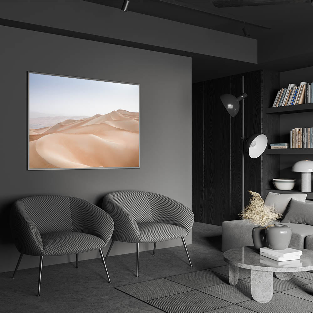 Experience the tranquil beauty of the desert with this minimalist wall art, featuring the soft, flowing curves of sand dunes under a serene sky. The subtle gradient of the dunes, with their gentle slopes and smooth textures, creates a peaceful and calming atmosphere. This artwork is perfect for those who appreciate the quiet elegance of nature’s simplicity, making it an ideal piece for creating a serene retreat in your home.