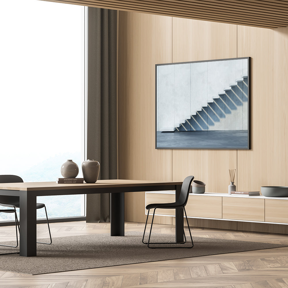 This floating staircase wall art is perfect for those who appreciate simplicity and elegance. Whether displayed in a living room, hallway, or office, this piece will enhance your space with its modern aesthetic and thoughtful design.