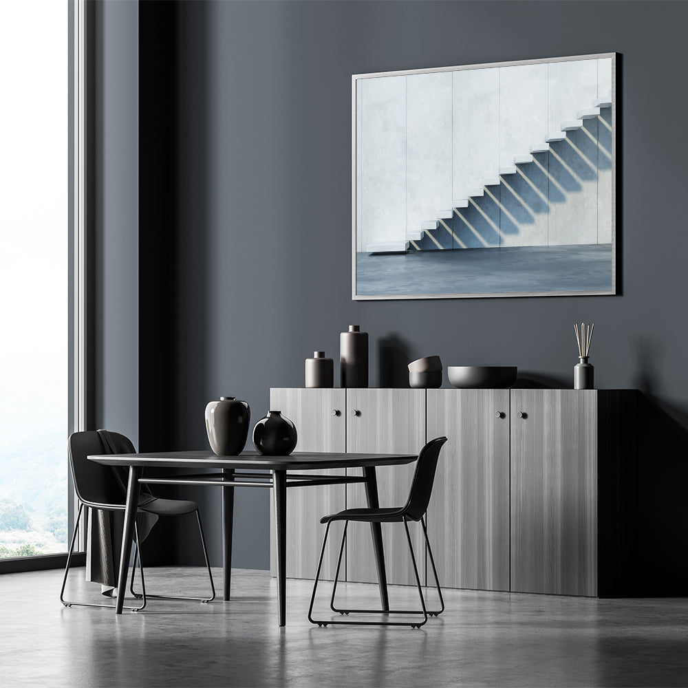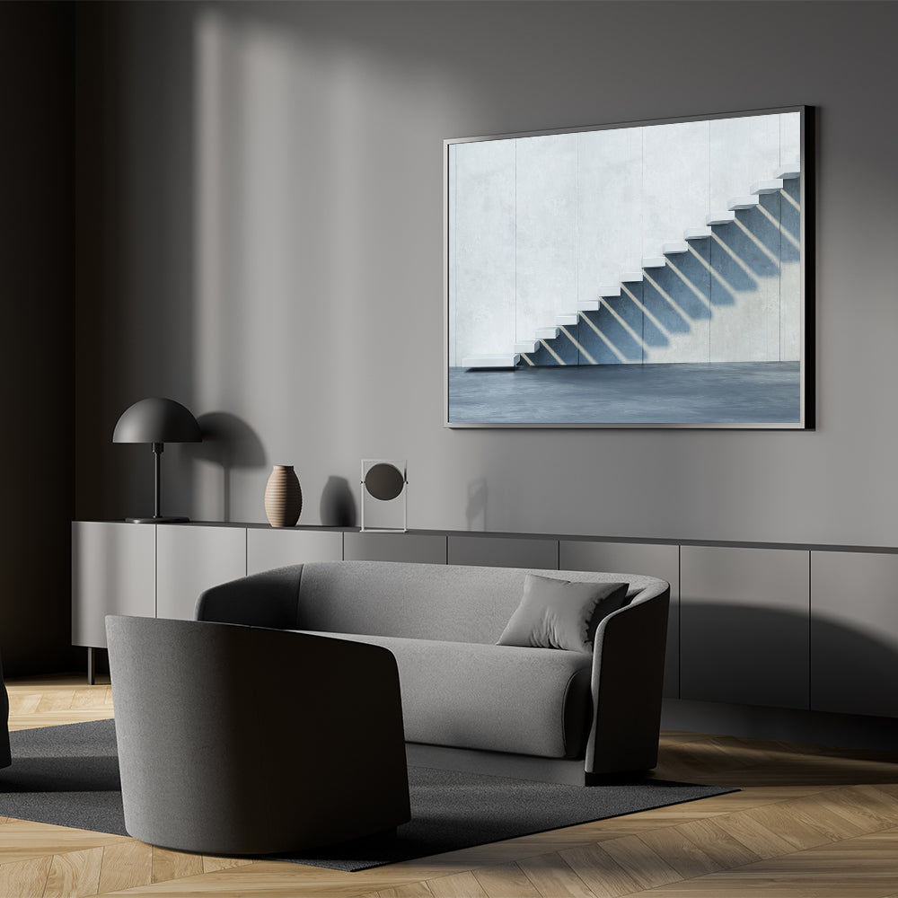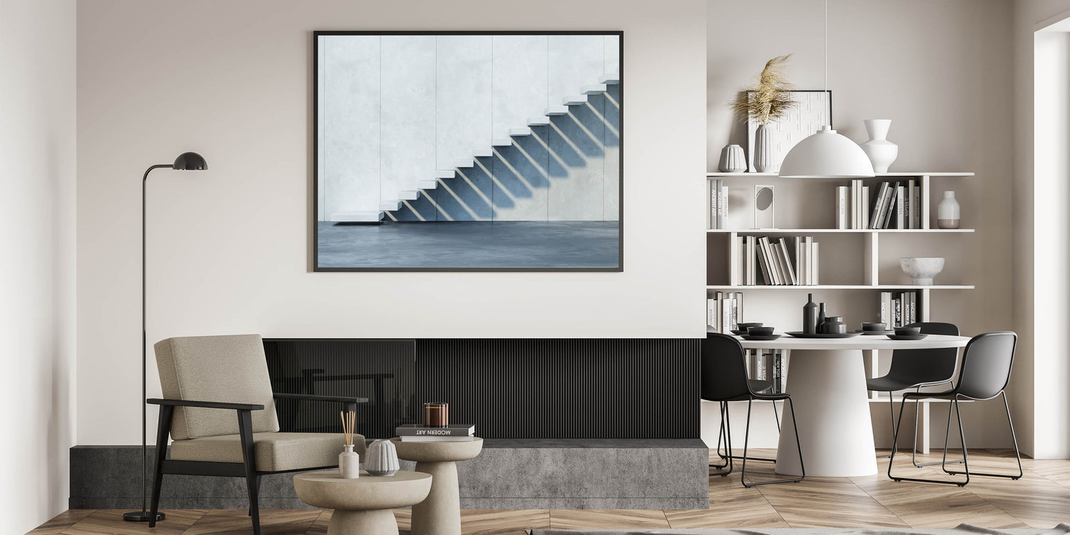 Bring a touch of modern minimalism to your space with this striking floating staircase wall art. The clean lines and simple design of this architectural masterpiece create a sense of calm and sophistication, making it a perfect addition to contemporary interiors. The play of light and shadow on the floating steps adds depth and intrigue to the composition, drawing the eye and inviting contemplation. This artwork is available in various formats, including stretched canvas, framed canvas, acrylic glass, framed acrylic glass, framed print, rolled canvas, and rolled print, allowing you to customize it to your style and space.