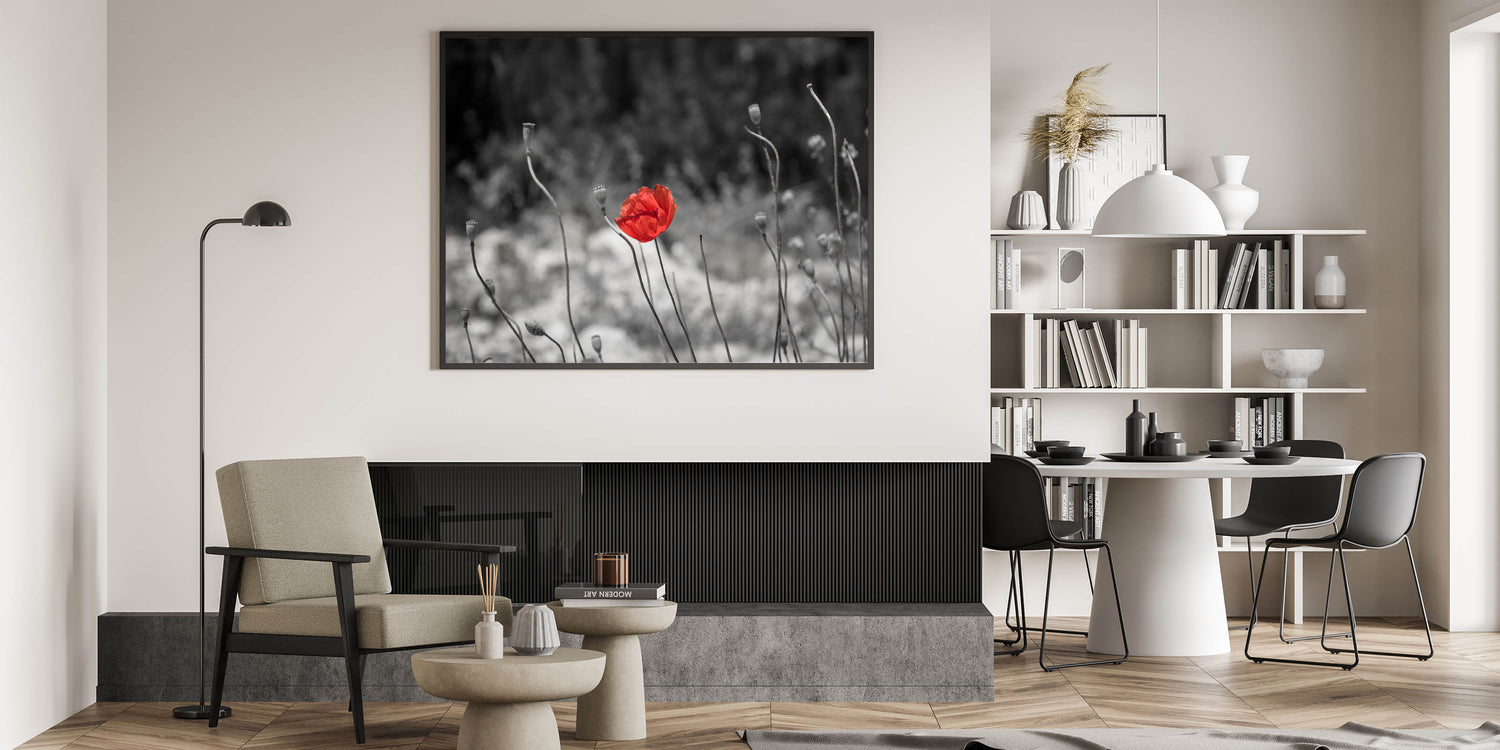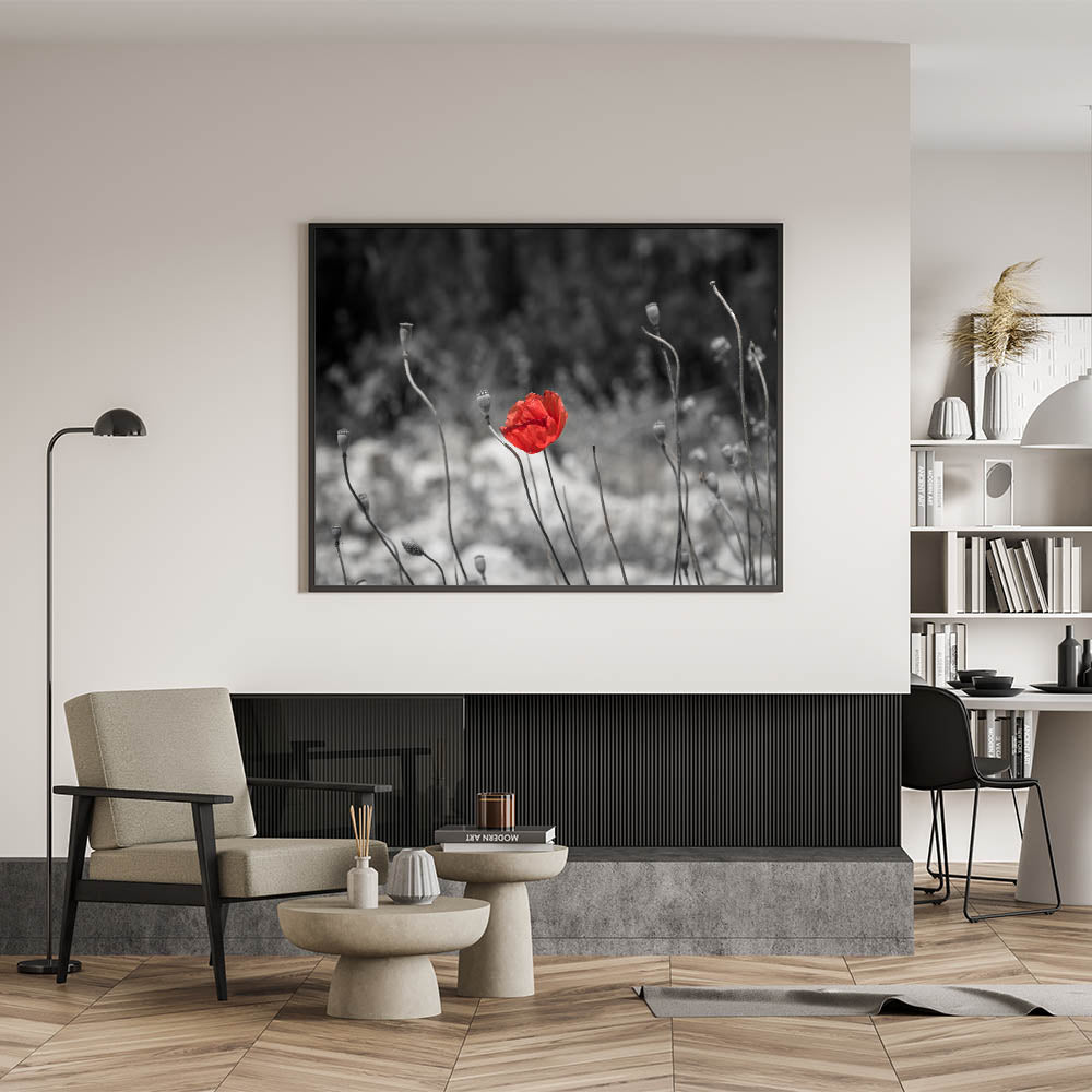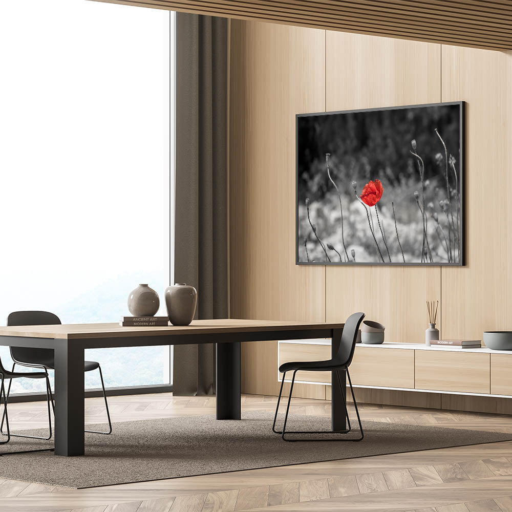 This minimalist red poppy wall art captures the beauty of simplicity. The vibrant red poppy stands alone amidst a desaturated grayscale background, drawing all focus to its delicate petals. The clean, minimalist composition evokes a sense of serenity, making it an ideal choice for those looking to add a peaceful yet impactful touch to their home decor.