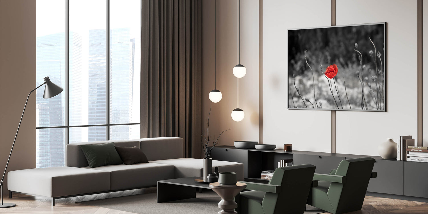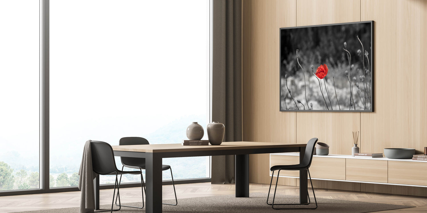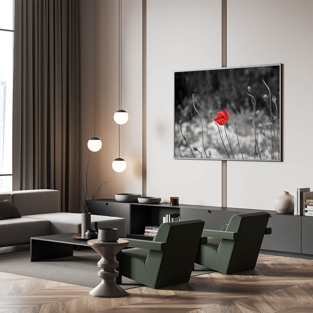 This minimalist red poppy wall art captures the beauty of simplicity. The vibrant red poppy stands alone amidst a desaturated grayscale background, drawing all focus to its delicate petals. The clean, minimalist composition evokes a sense of serenity, making it an ideal choice for those looking to add a peaceful yet impactful touch to their home decor.