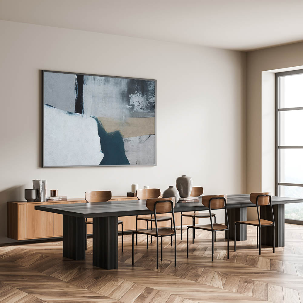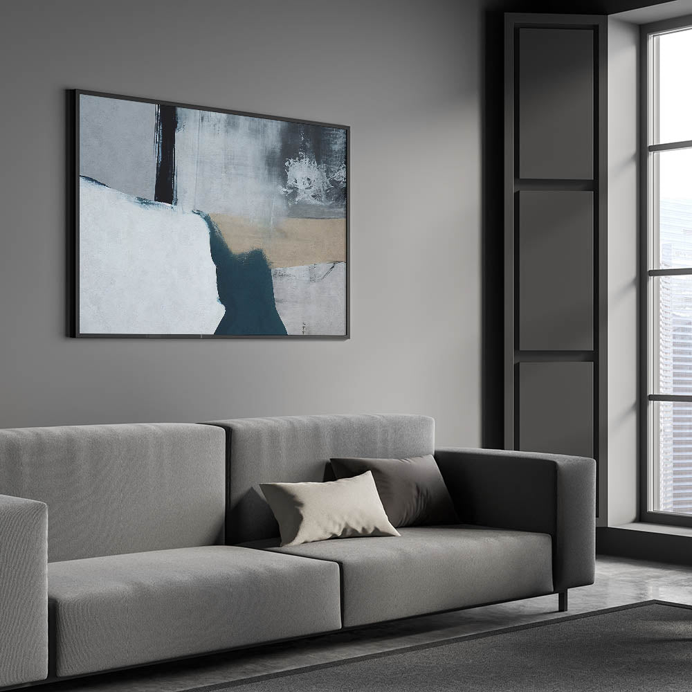 Bring the serene essence of the coast into your home with this minimalist strokes and lines abstract art. This piece features a soothing blend of cool blues, soft grays, and sandy beige tones, reminiscent of a tranquil beachscape. The subtle brush strokes and geometric shapes create a calming visual experience that will enhance any room's ambiance.